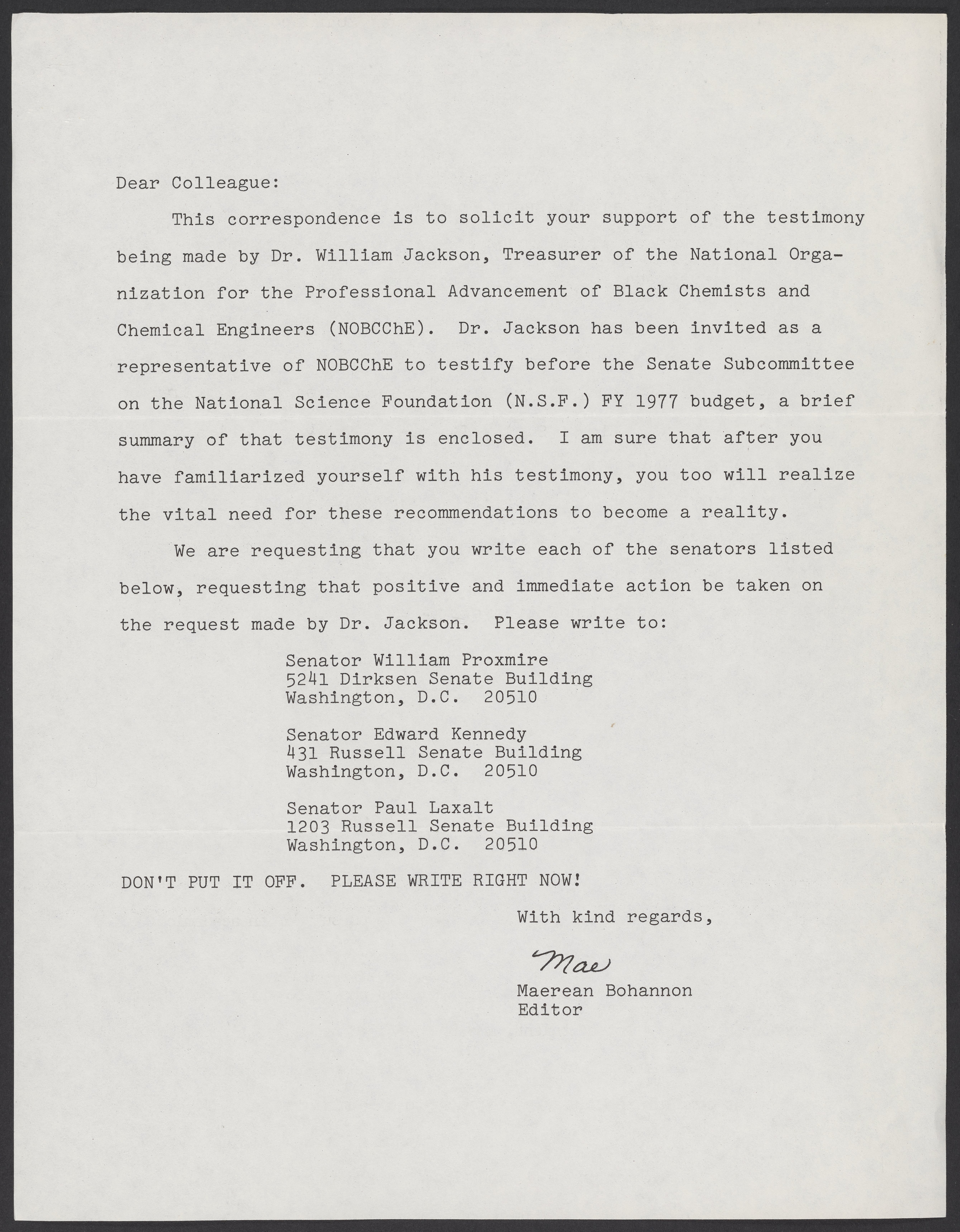 Letter regarding NOBCChE's testimony to the United States Senate, 1976