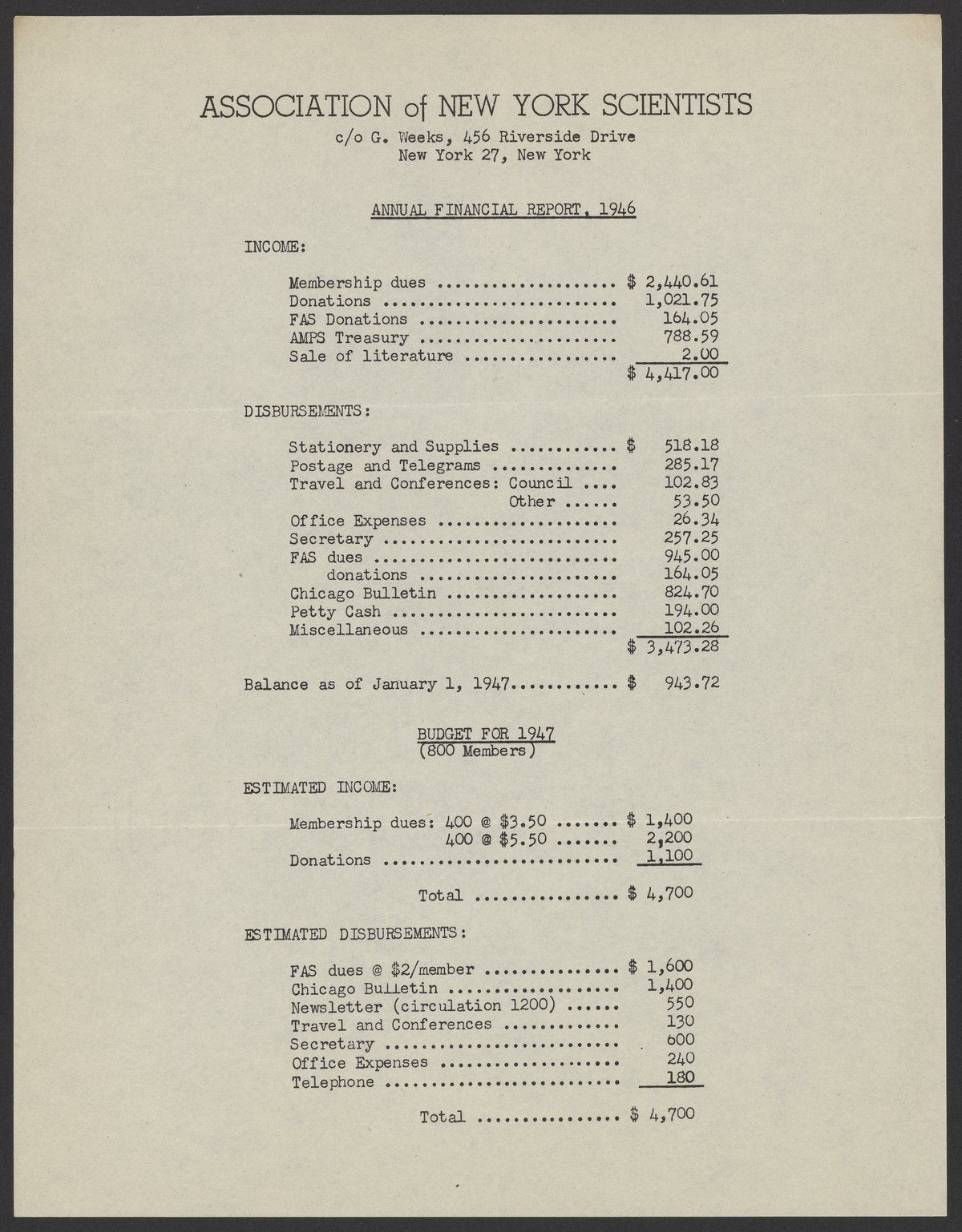 Annual financial report of the Association of New York Scientists, 1946