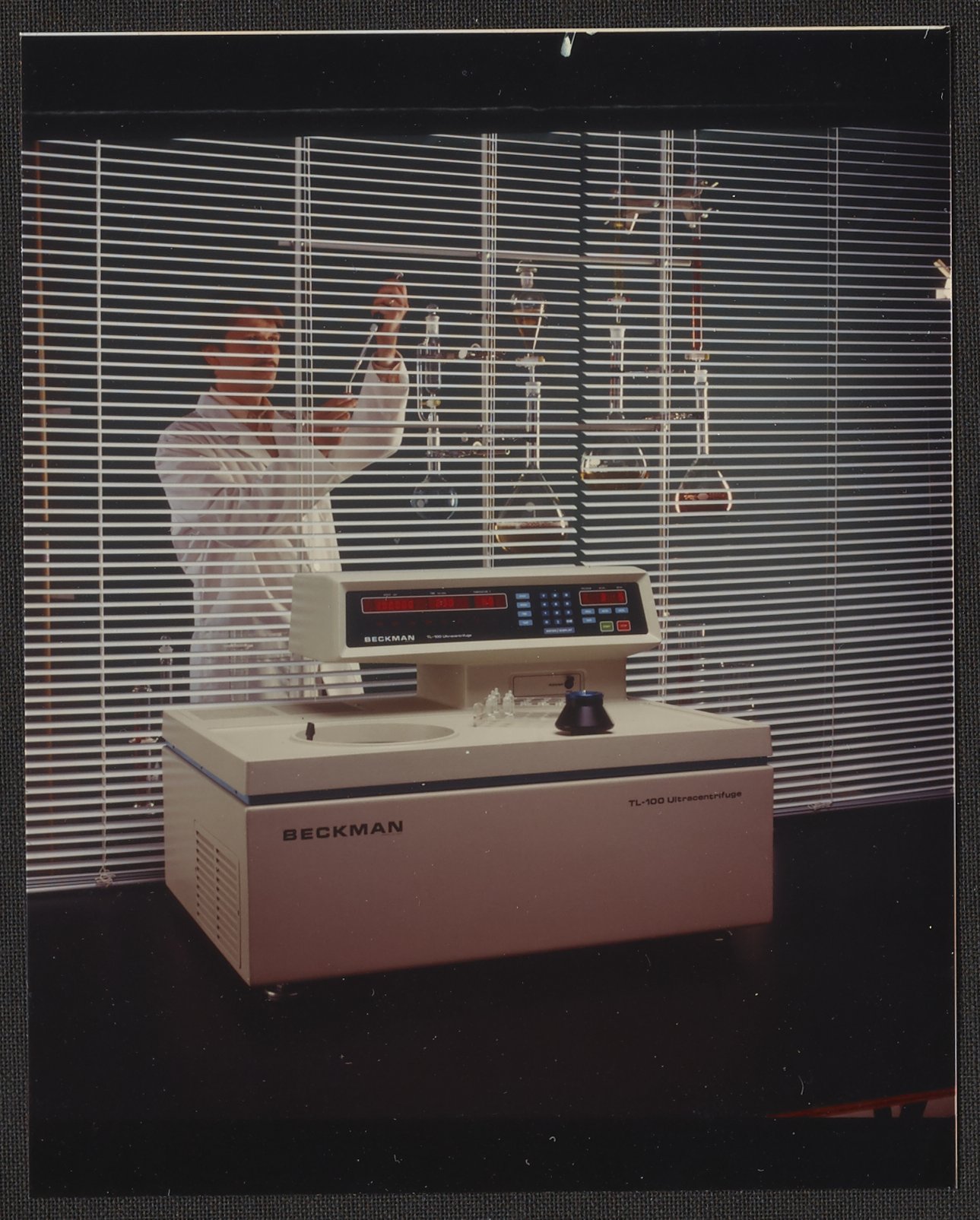 A man flanked by dramatically-lit glassware uses a syringe, separated from a Beckman tabletop ultracentrifuge by opened blinds. This model was produced in 1978.