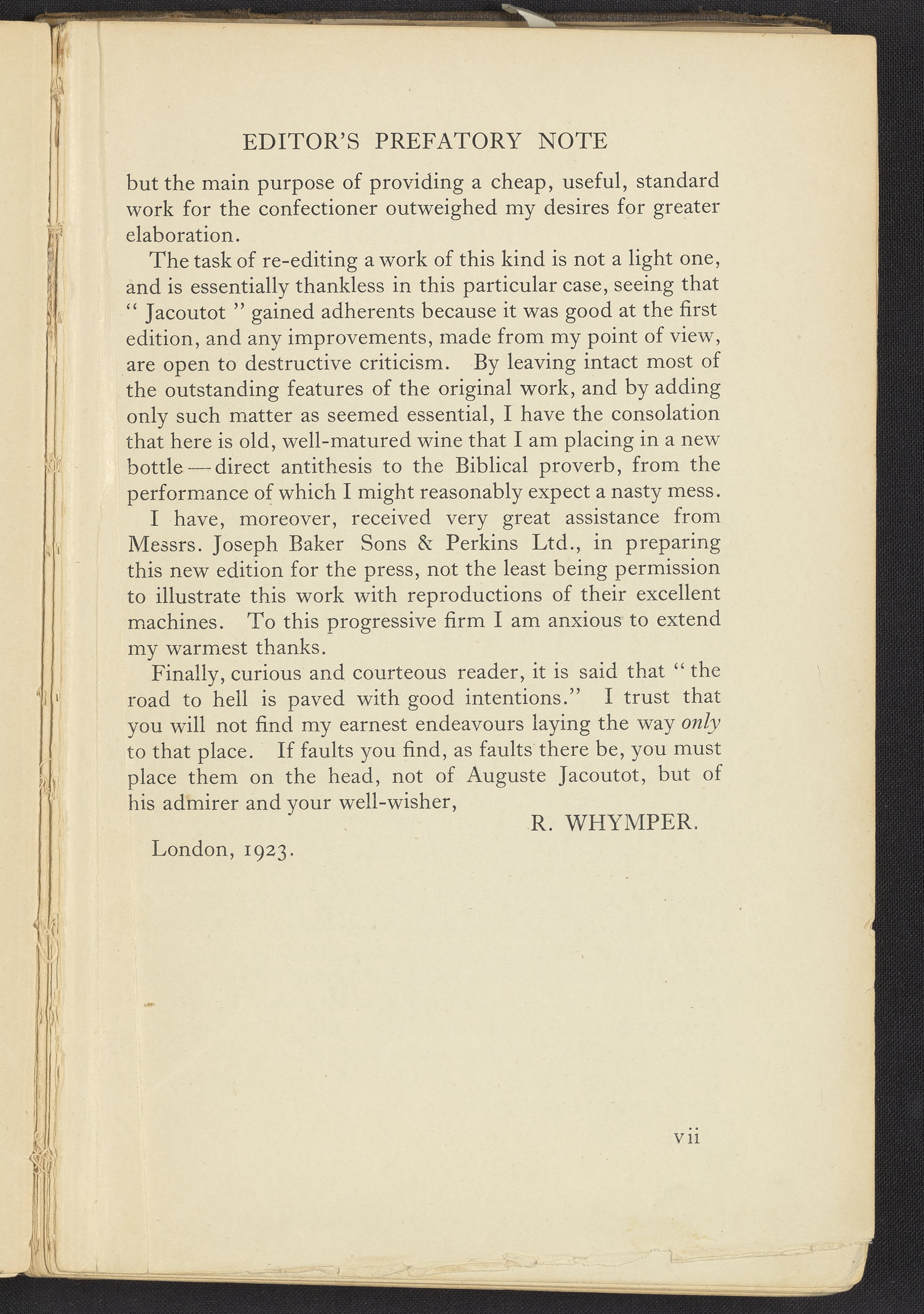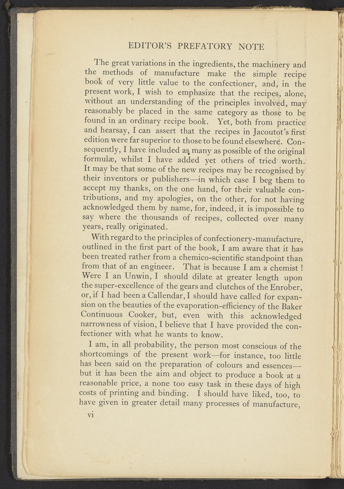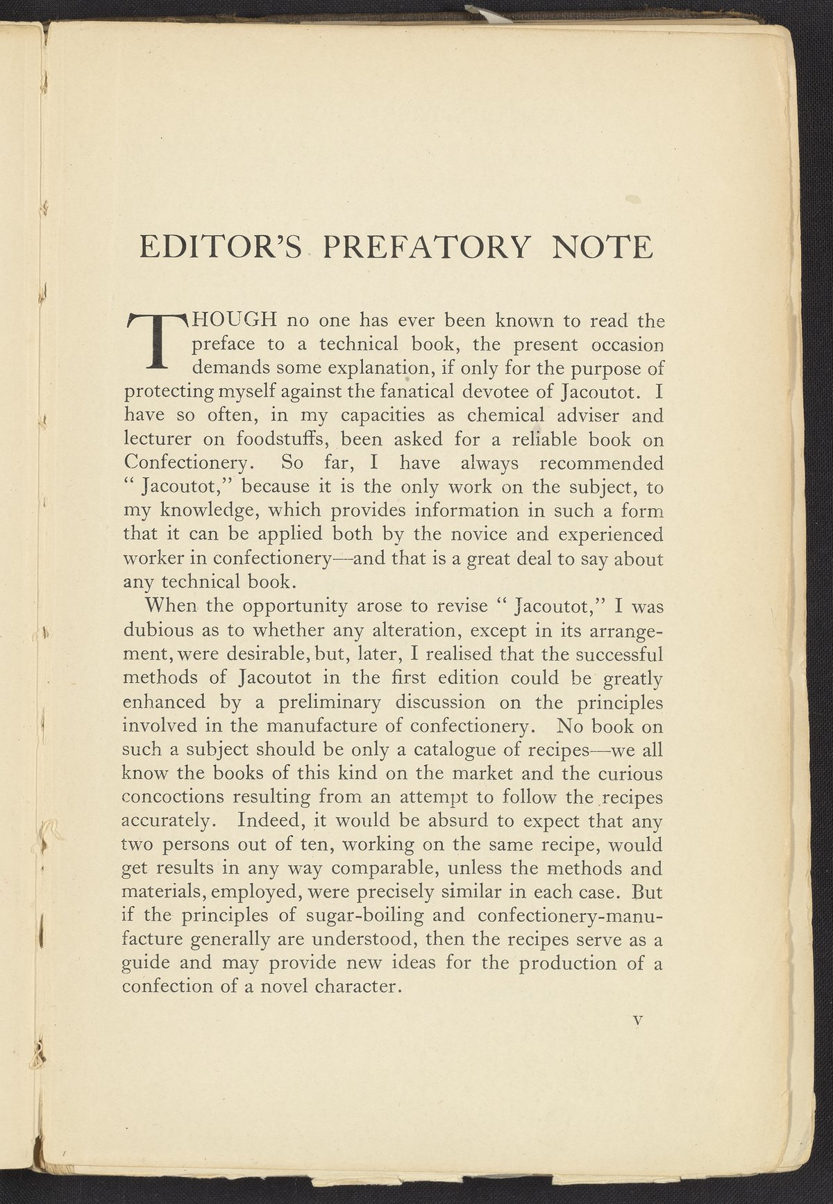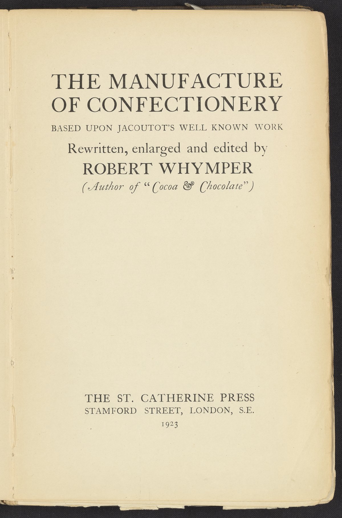 Small JPG1200 x 1741px — 623 KBFull-sized JPG2678 x 3886px — 2.7 MBOriginal fileTIFF — 2678 x 3886px — 29.8 MBA revised and extended version of the work, Chocolate & Confectionery Manufacture (1903) by August Jacoutot. Editor, Rober Whymper (1885-), sought to enhance the content of Jacoutot's original work to contain not only recipes but also an emphasis on the understanding of the chemical principles of confectionery. In his edited rendition, Whymper places an emphasis on ingredients, machinery, and methods of manufacture. The volume contains six fully illustrated chapters, with the fifth chapter including a series of recipes.