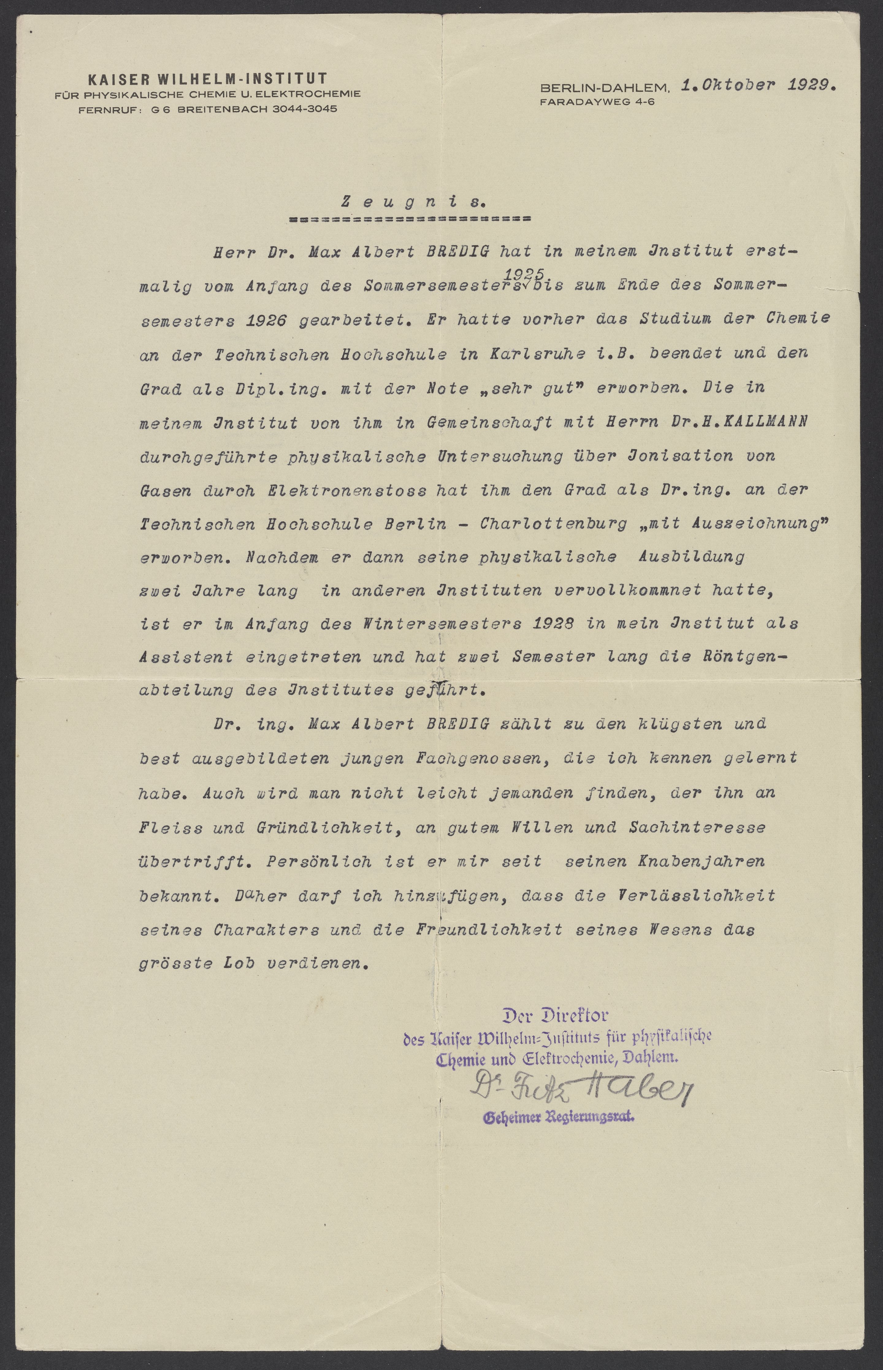 Herr Dr. Max Albert BREDIG hat in meinem Institut erstmalig vom Anfang des Sommersemesters 1925 bis zum Ende des Sommersemesters 1926 gearbeitet. Er hatte vorher das Studium der Chemie and der Technischen Hochschule in Karlsruhe i.B. beendet und den Grad als Dipl. ing. mit der Note „sehr gut“ erworben. Die in meinem Institut von ihm in Gemeinschaft mit Herrn Dr. H. KALLMANN durchgeführte physikalische Untersuchung über Ionisation von Gasen durch Elektronenstoss hat ihm den als Dr. ing. an der Technischen Hochschule Berlin – Charlottenburg „mit Auszeichnung“ erworben. Nachdem er dann seine physikalische Ausbildung zwei Jahre lang in anderen Instituten vervollkommnet hatte, ist er im Anfang des Wintersemesters 1928 in mein Institut als Assistent eingetreten und hat zwei Semester lang die Röntgenabteilung des Institutes geführt.