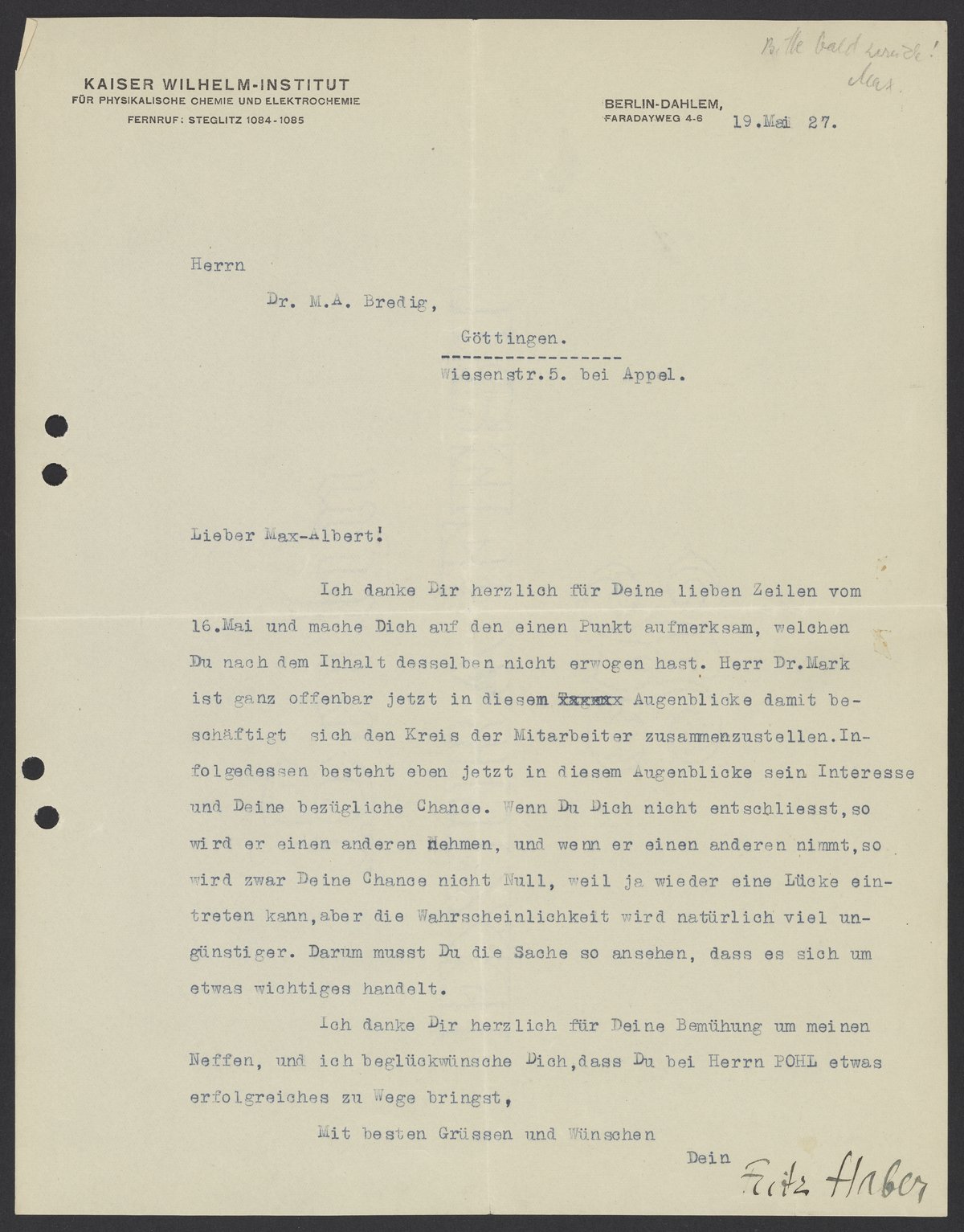 Letter from Fritz Haber to Max Bredig, May 19, 1927