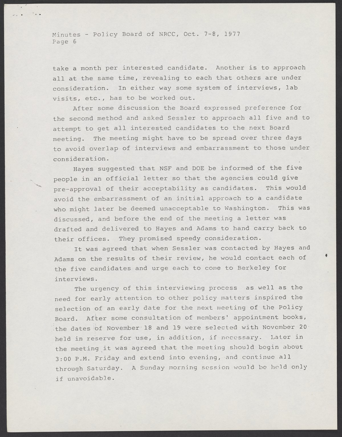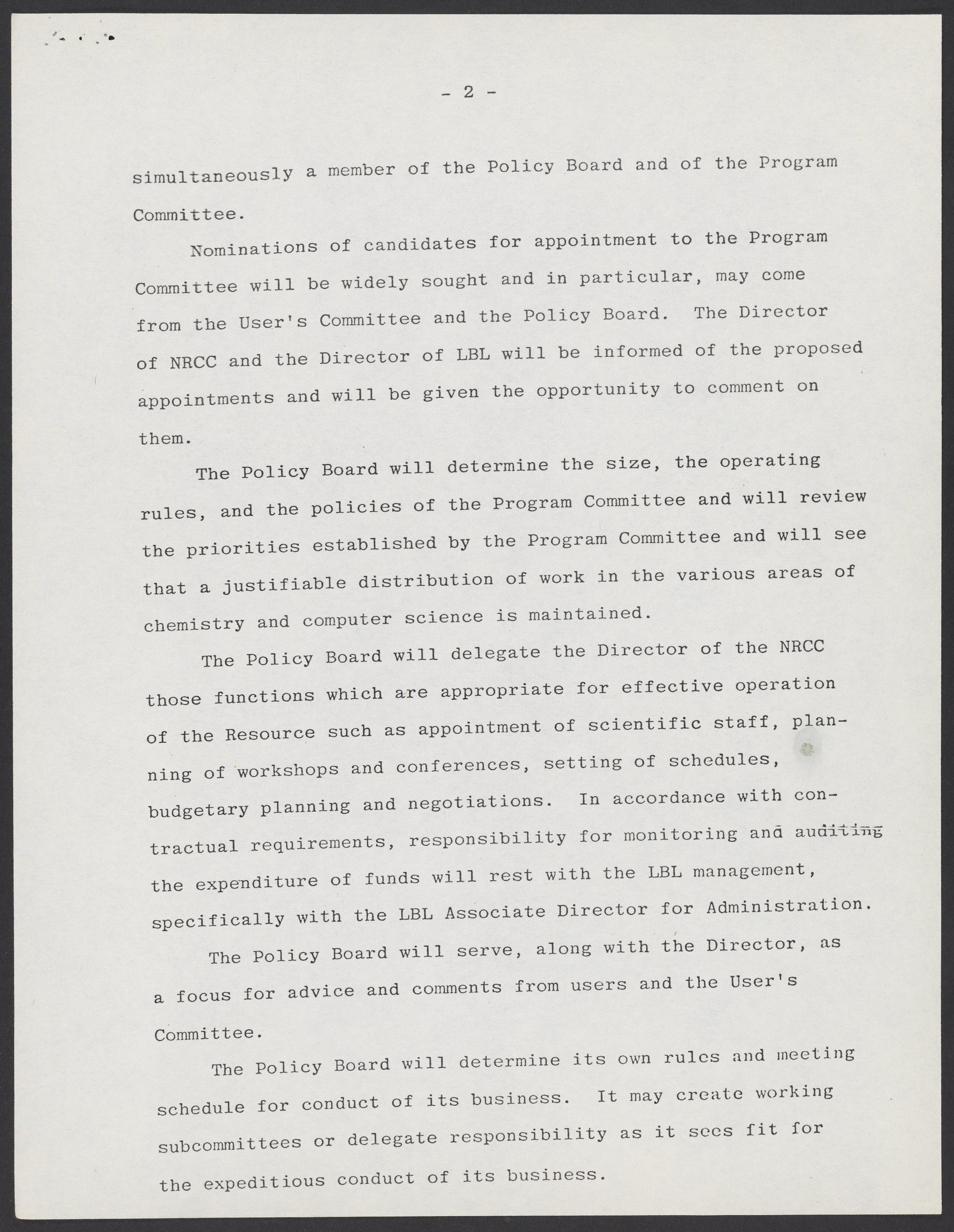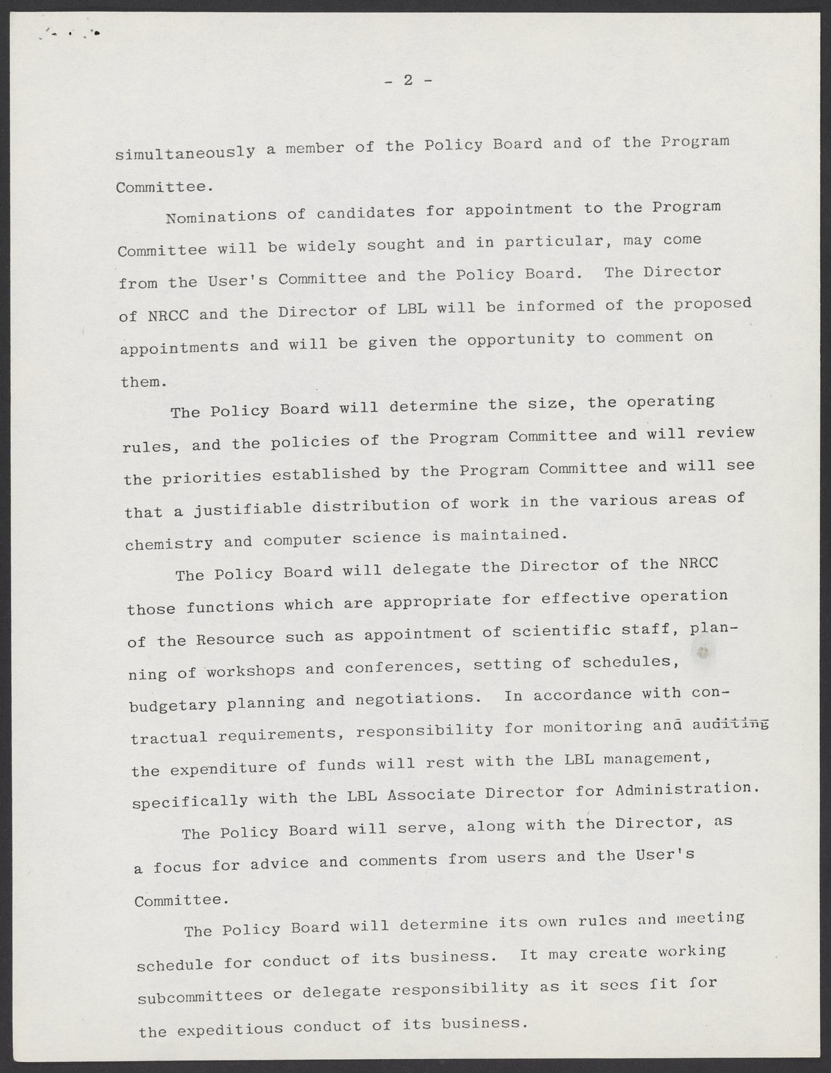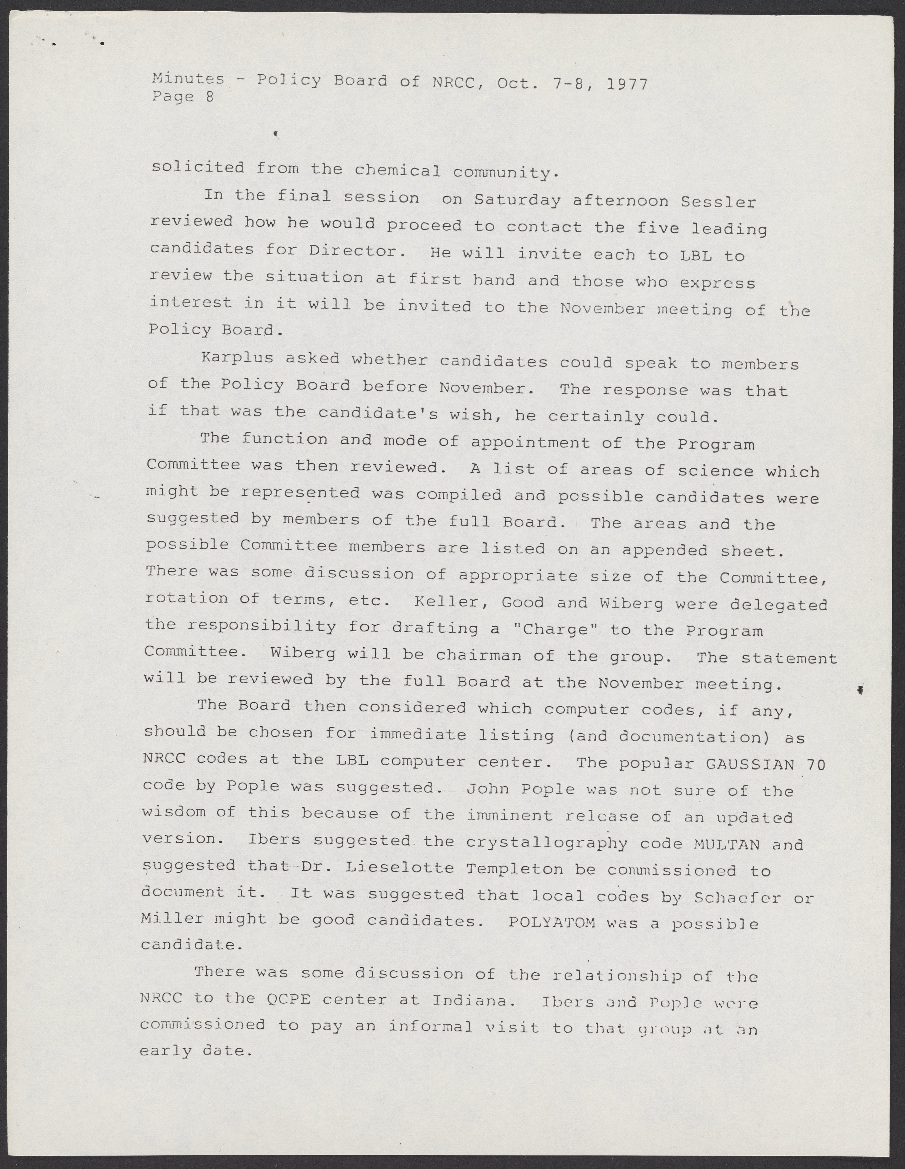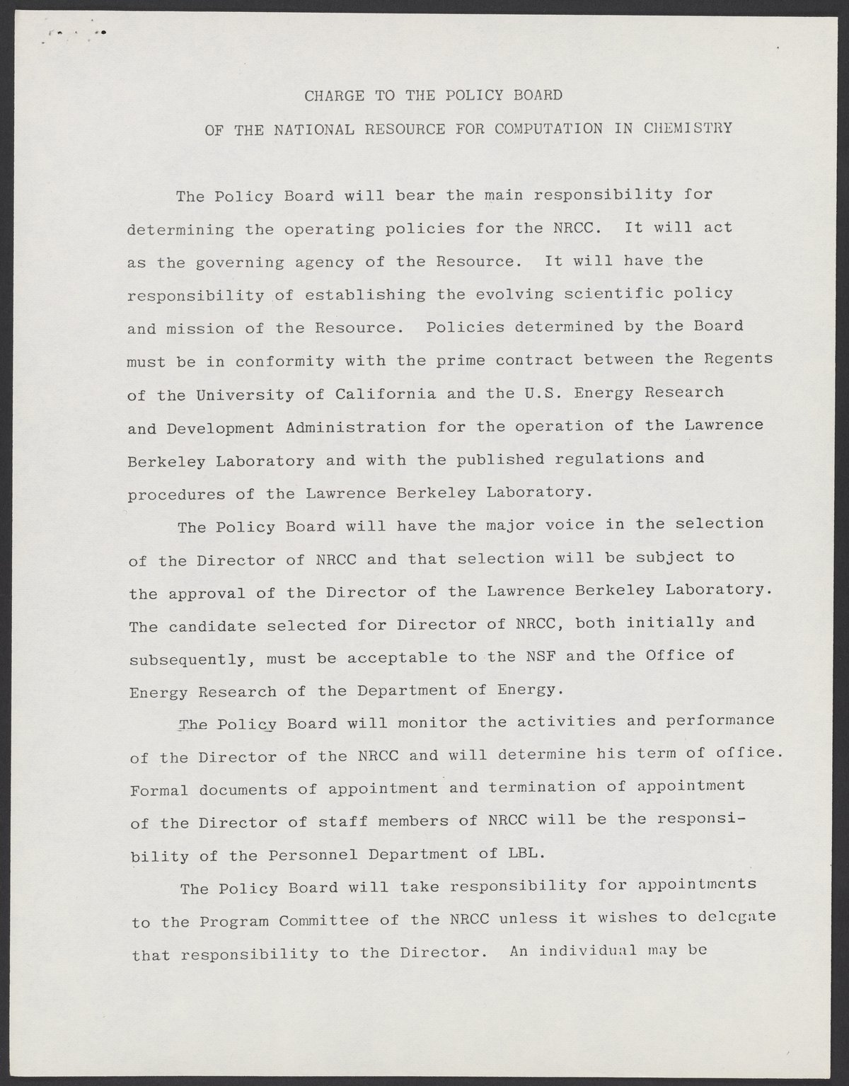 Small JPG1200 x 1535px — 260 KBLarge JPG2880 x 3685px — 1.4 MBFull-sized JPG5414 x 6927px — 4.9 MBOriginal fileTIFF — 5414 x 6927px — 107 MBMeeting minutes of the first meeting of the policy board of the National Resource for Computation in Chemistry (NRCC), held at the Lawrence Berkeley Laboratory on October 8, 1977. Included are outlines of the responsibilities of the policy board of the NRCC.