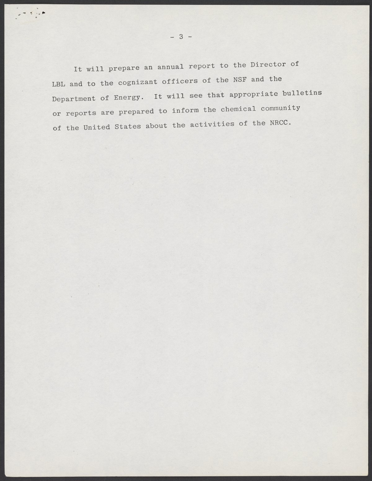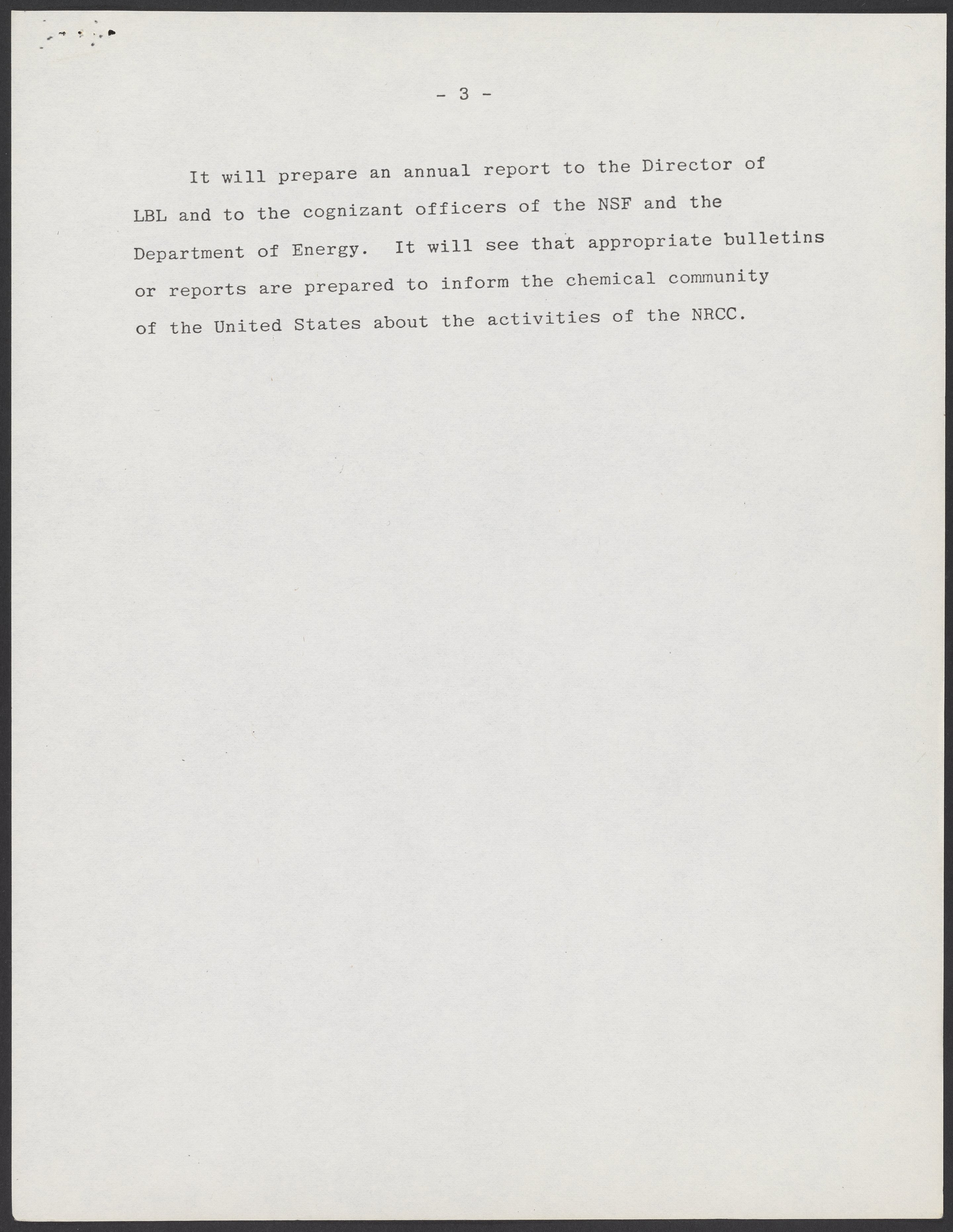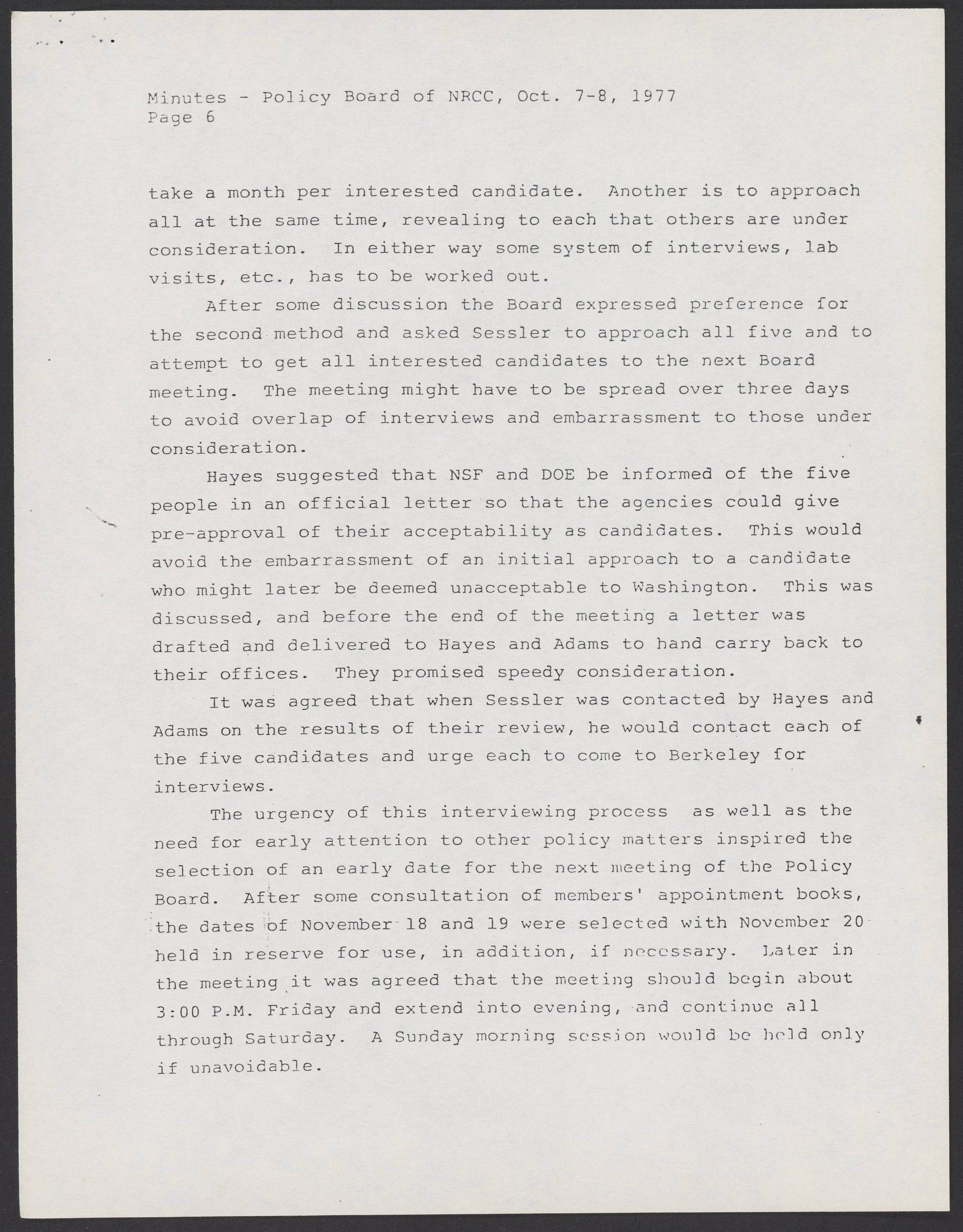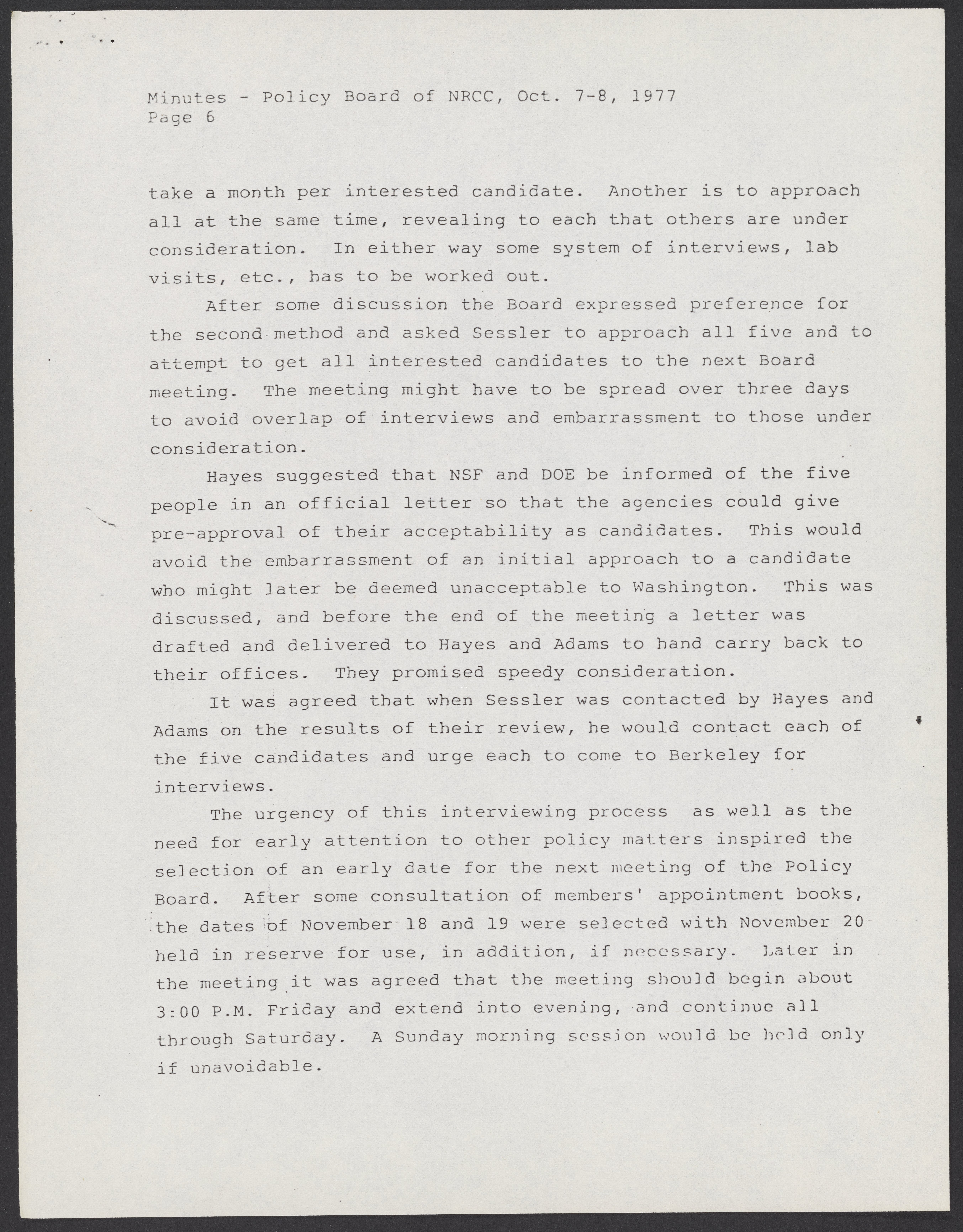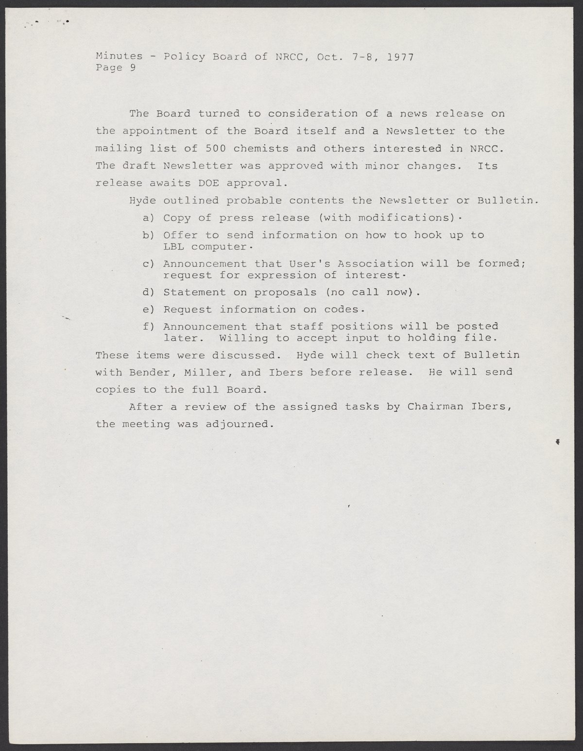 Small JPG1200 x 1535px — 260 KBLarge JPG2880 x 3685px — 1.4 MBFull-sized JPG5414 x 6927px — 4.9 MBOriginal fileTIFF — 5414 x 6927px — 107 MBMeeting minutes of the first meeting of the policy board of the National Resource for Computation in Chemistry (NRCC), held at the Lawrence Berkeley Laboratory on October 8, 1977. Included are outlines of the responsibilities of the policy board of the NRCC.