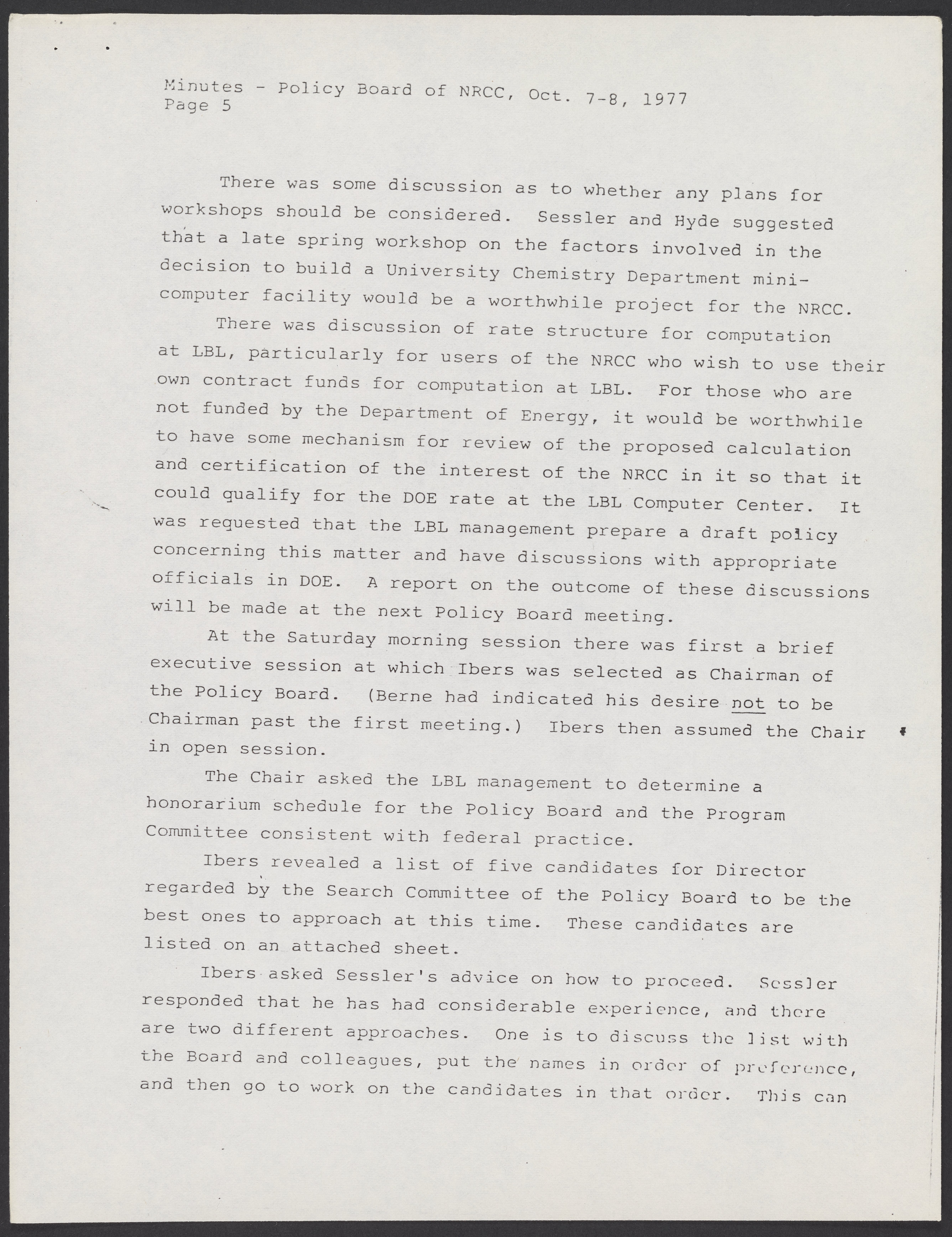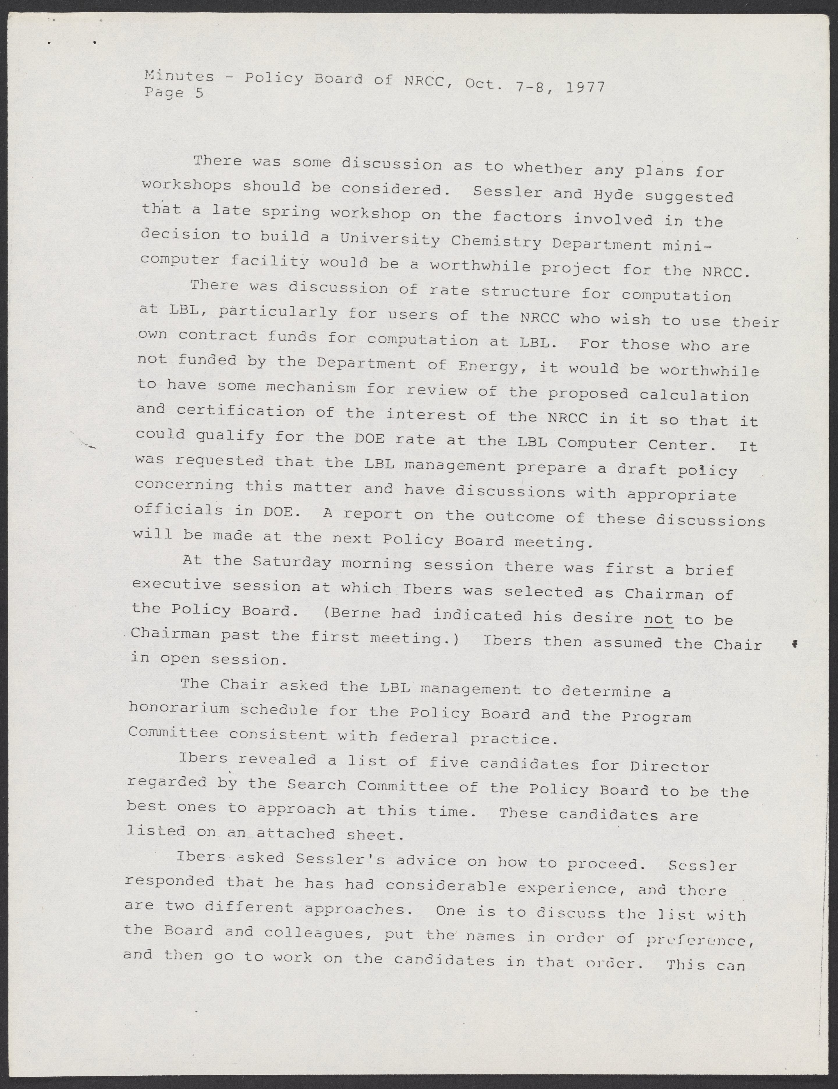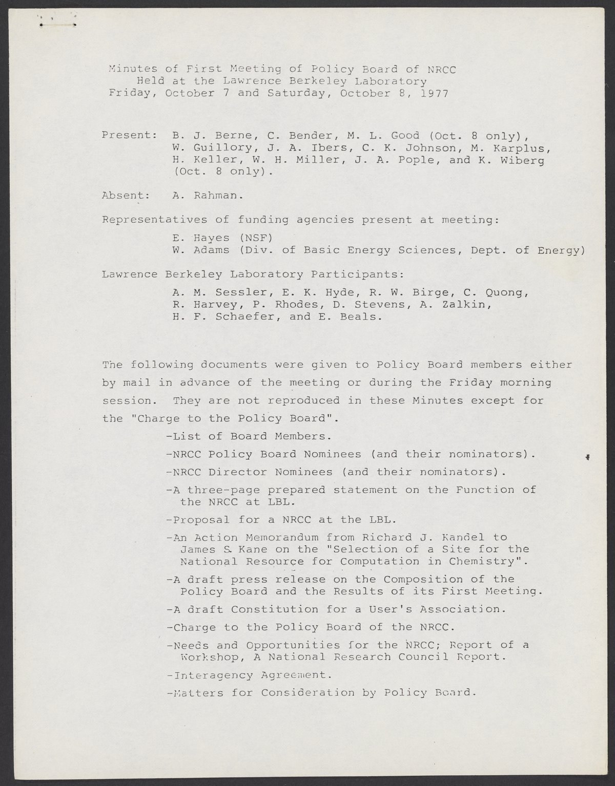 Lawrence Berkeley Laboratory. National Resource for Computation in Chemistry. “Minutes of the Meeting of the Policy Board of the National Resource for Computation in Chemistry, October 1977,” October 8, 1977. William A. Lester, Jr. Papers, Box 14, Folder 4. Science History Institute. Philadelphia. https://digital.sciencehistory.org/works/d1thivn.