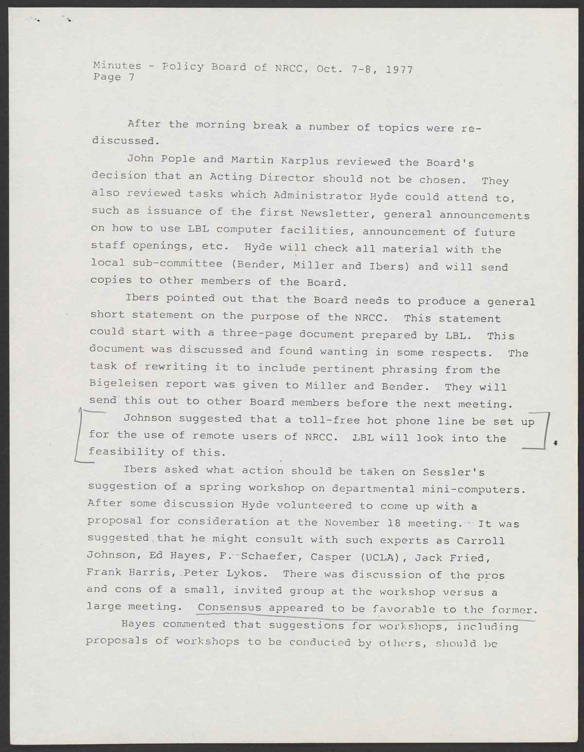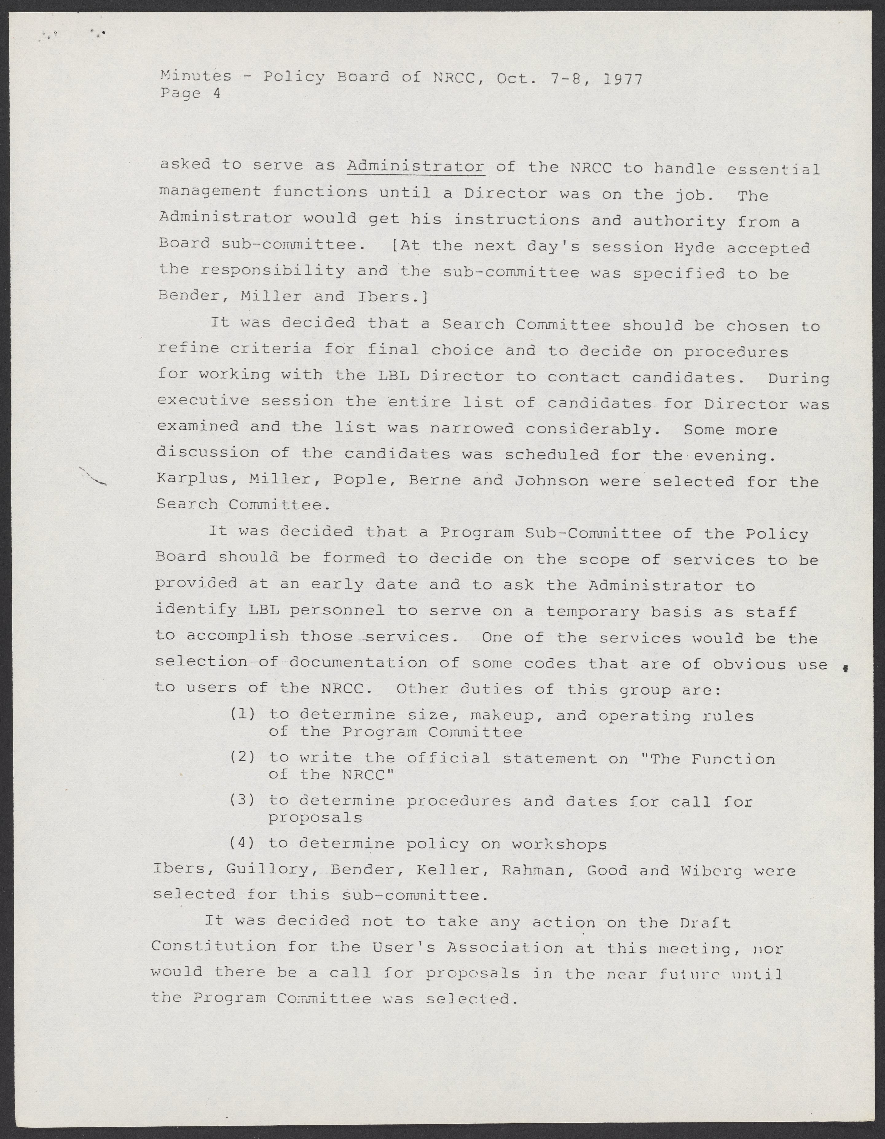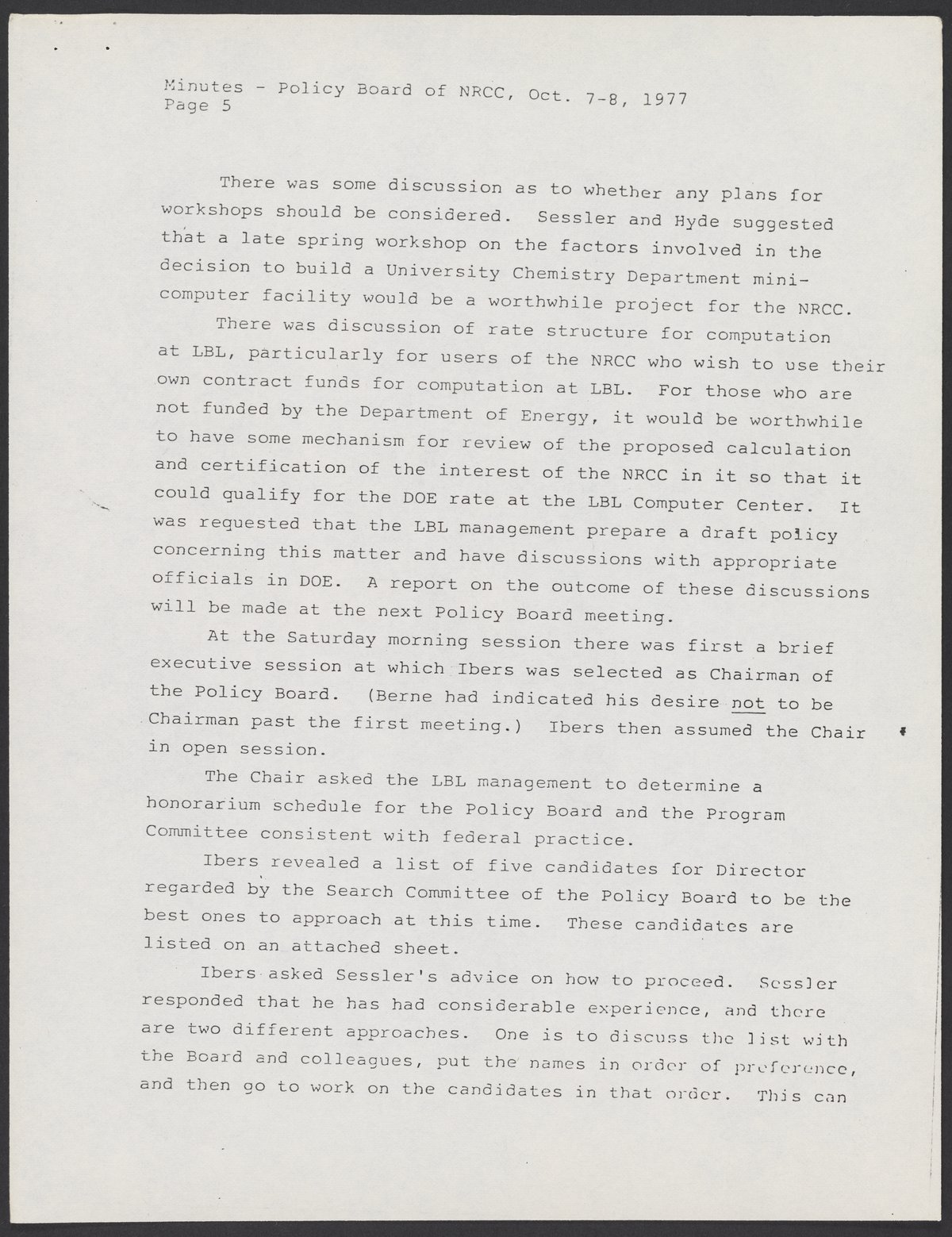 Lawrence Berkeley Laboratory. National Resource for Computation in Chemistry. “Minutes of the Meeting of the Policy Board of the National Resource for Computation in Chemistry, October 1977,” October 8, 1977. William A. Lester, Jr. Papers, Box 14, Folder 4. Science History Institute. Philadelphia. https://digital.sciencehistory.org/works/d1thivn.