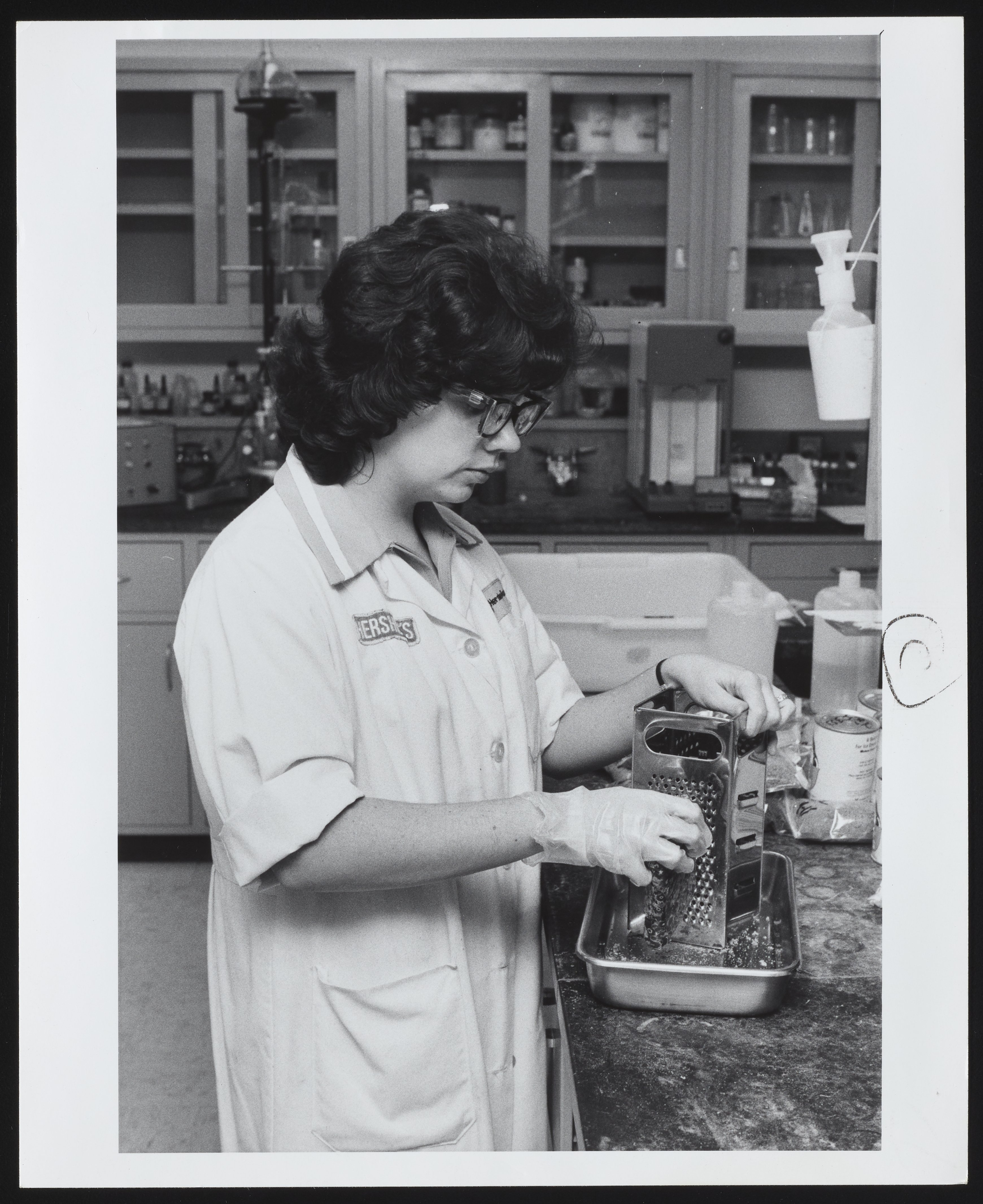General view of laboratory technician Margaret Kreiser grating a sample of chocolate prior to testing at a Hershey Company facility. Per notations accompanying the photograph, testing included an analysis of the moisture present in a sample, as well as total fat and carbohydrate content.