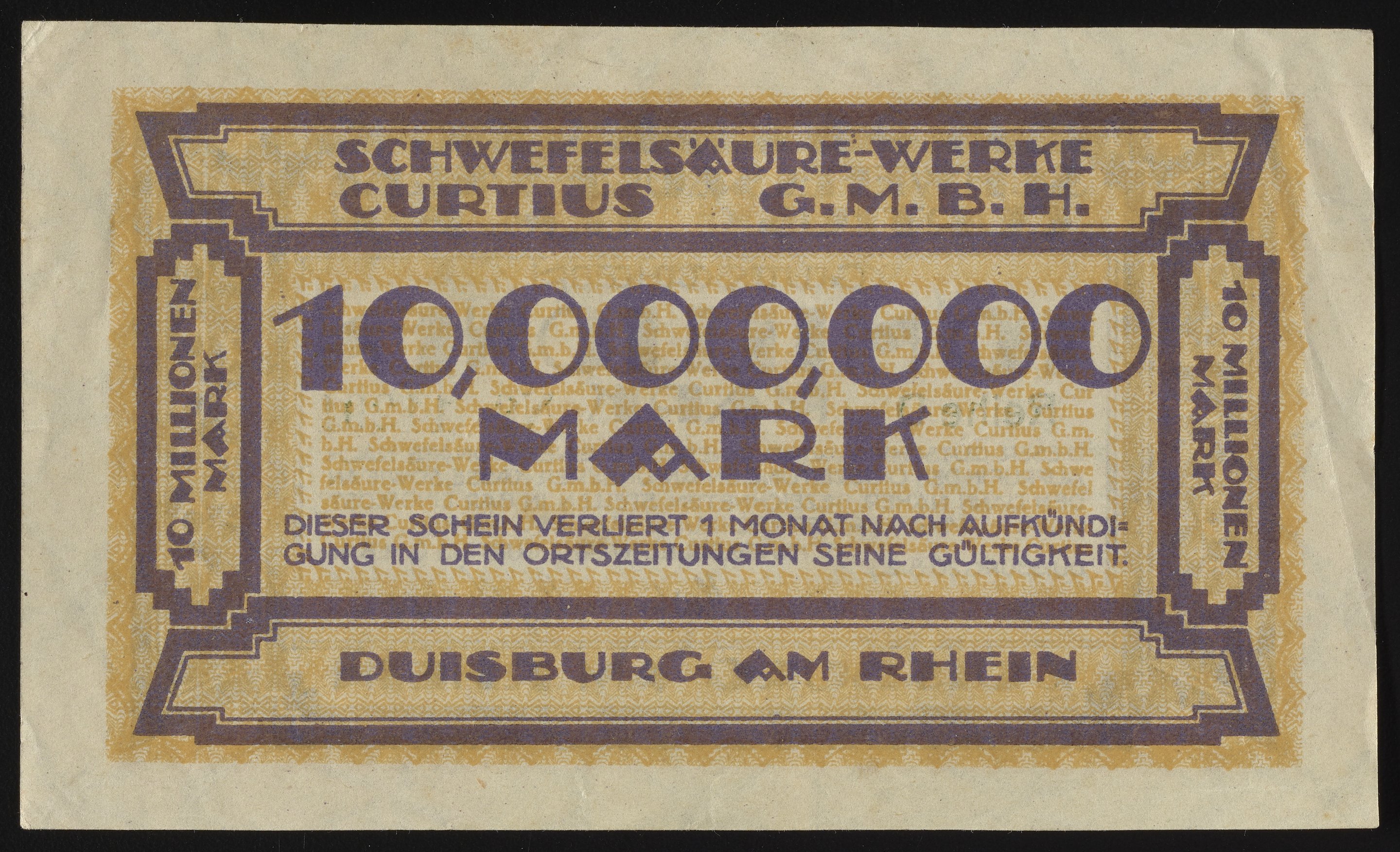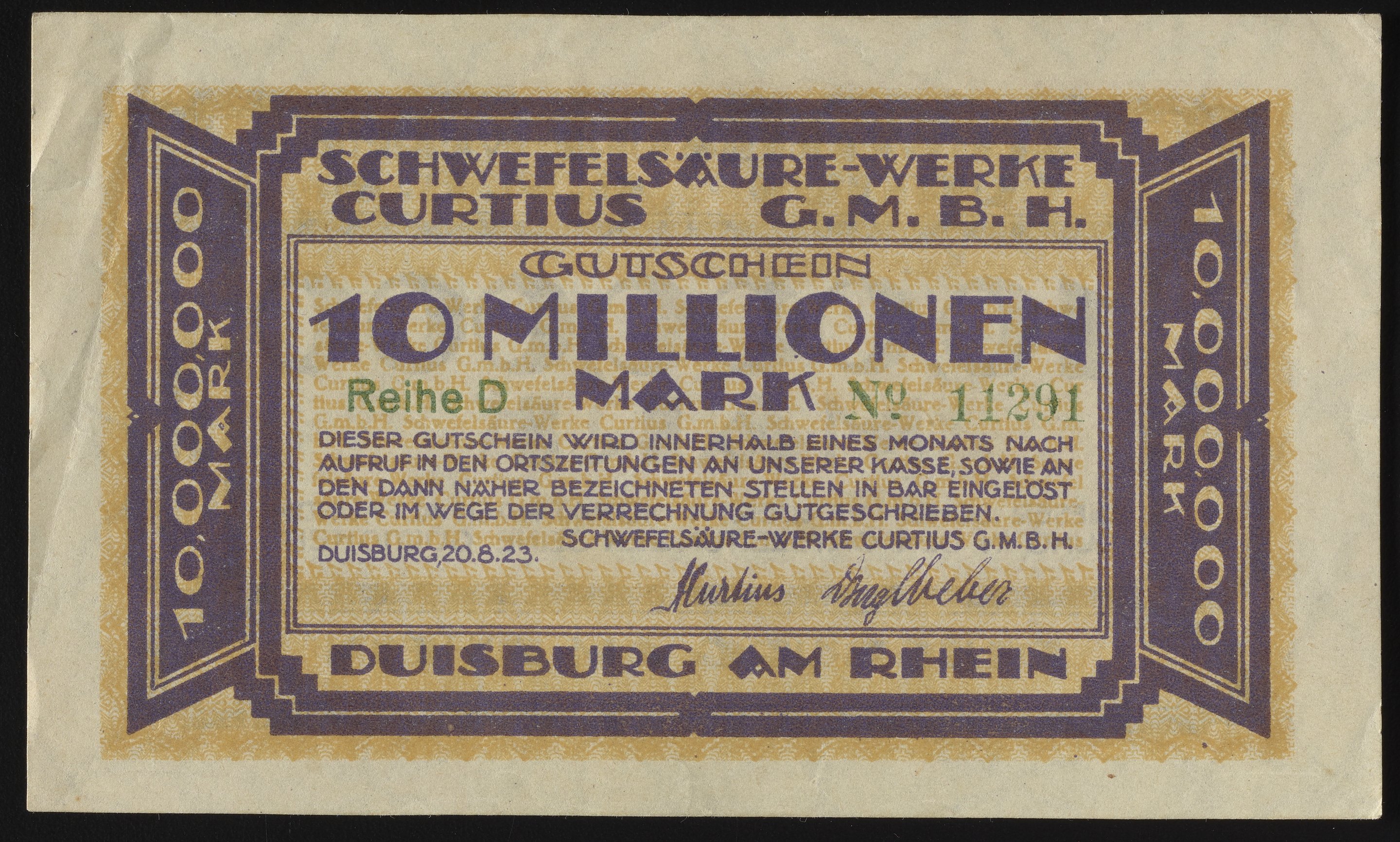 Small JPG1200 x 722px — 220 KBLarge JPG2880 x 1732px — 1.2 MBFull-sized JPG4095 x 2463px — 2.1 MBOriginal fileTIFF — 4095 x 2463px — 28.9 MBThis Ten Millionen Mark Gutschein, or ten million Mark voucher, was issued by Schwefelsäure-Werke Curtius GmbH, or Curtius Sulfuric Acid Works GmbH. Paper features a watermark design.