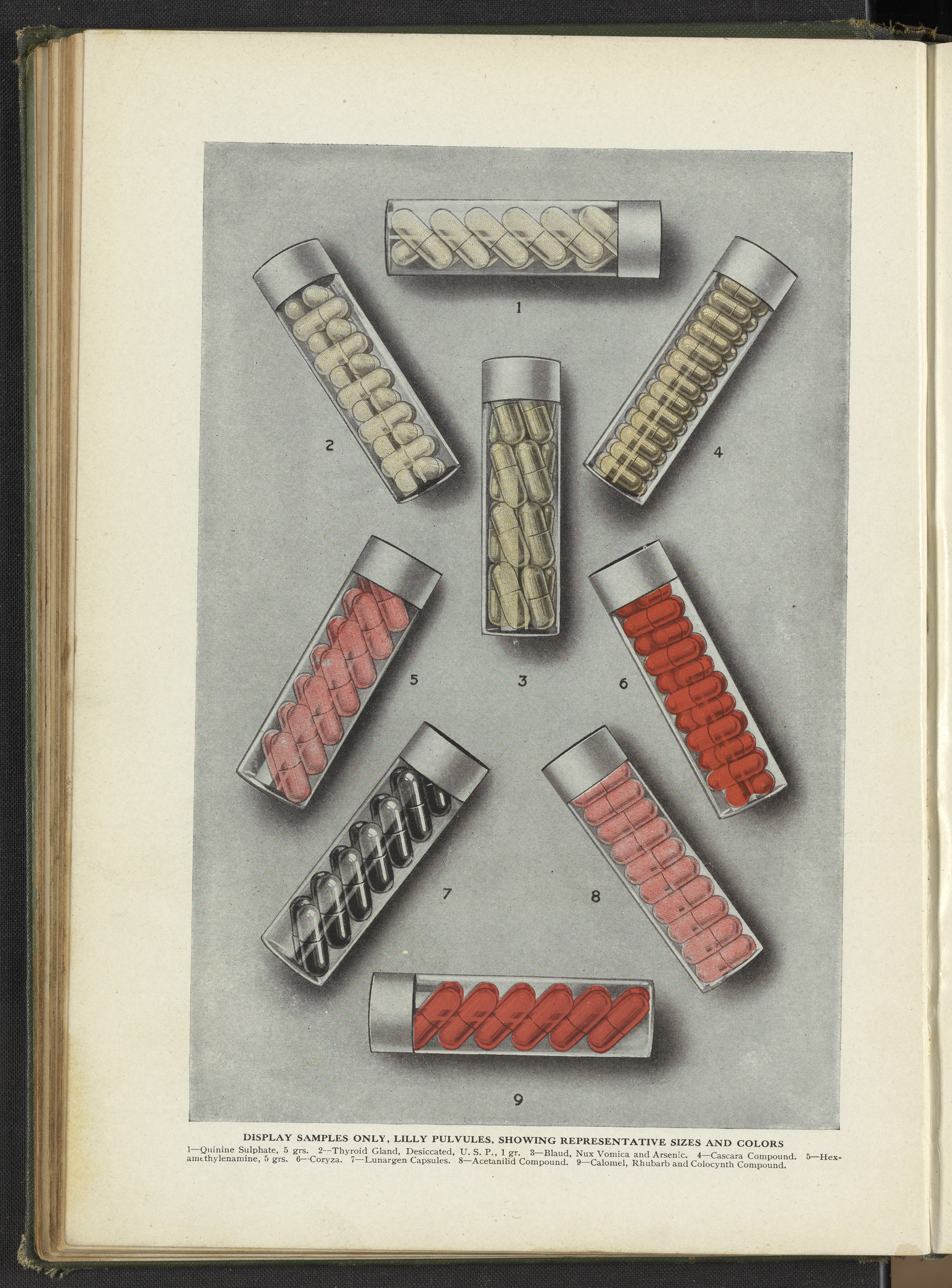 Eli Lilly and Company. “Display Samples Only, Lilly Pulvules, Showing Representative Sizes and Colors.” Hand Book of Pharmacy and Therapeutics. Indianapolis, Indiana, circa 1919. https://digital.sciencehistory.org/works/d217qq76x.