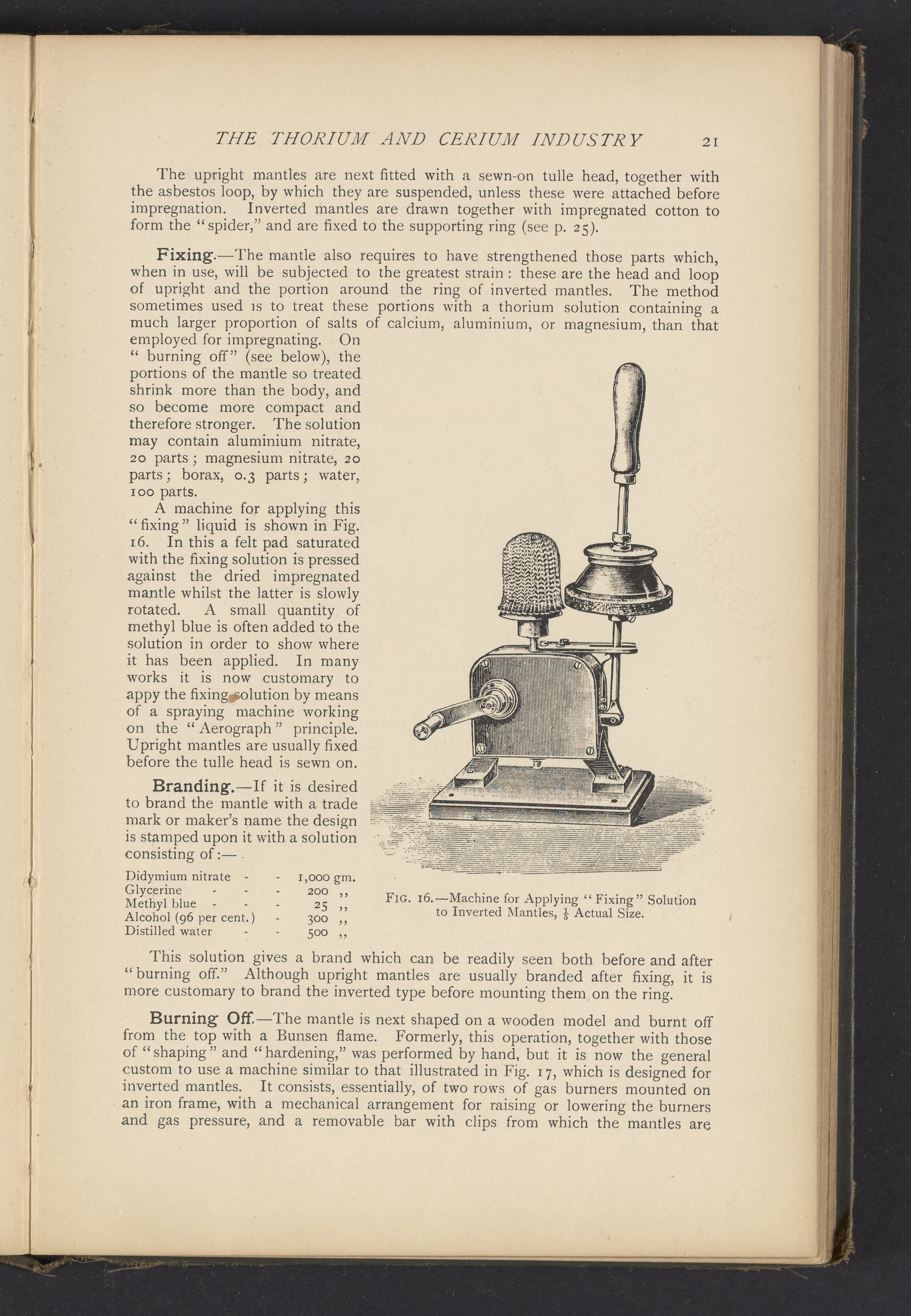 Figure 16 from the 1915 volume The Rare Earth Industry depicting a machine (1/5 actual size) for applying "fixing" solution to inverted mantles, a component of incandescent gas lanterns. The volume details various industrial applications of rare earths and closely-related elements, including thorium, zirconium, tantalum, and tungsten. Particular attention is given to the illuminating effect of the oxides of thorium and cerium and their application to the manufacture of incandescent gas mantles and electric lamps. The volume also includes chapters on uranium and vanadium, as well as the industry of radioactive substances.