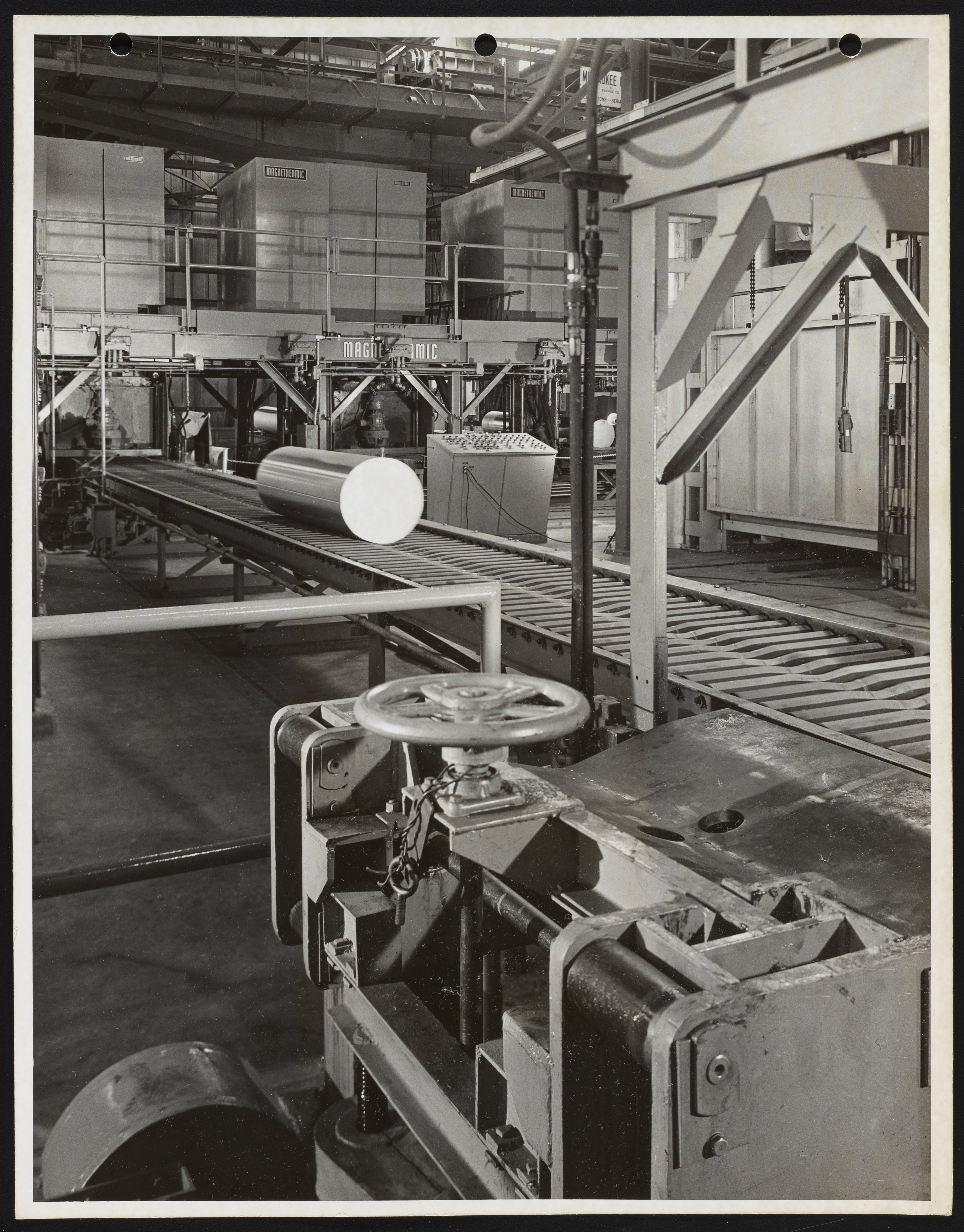 General view of a section of the magnesium rolling mill at the Dow Chemical Company facilities located in Madison, Illinois. Dedicated in 1954, the magnesium fabrication plant in Madison was the world's first facility designed for the mass production of magnesium mill products and boasted the first large-scale magnesium sheet mill, as well as the largest extrusion facilities for the metal.