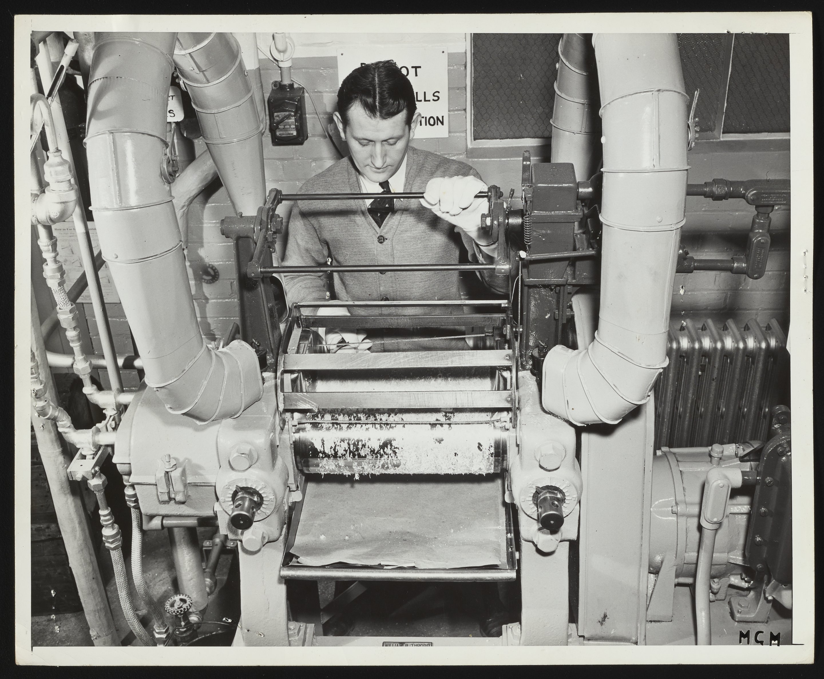 Hercules Incorporated. “Felix G. Nakielny Operating Two-Roll Mill in Hercules Experimental Plastics Laboratory ,” January 1945. Photographs from the Records & Ephemera of Hercules Incorporated, Box 2, Folder 26. Science History Institute. Philadelphia. https://digital.sciencehistory.org/works/d504rk955.