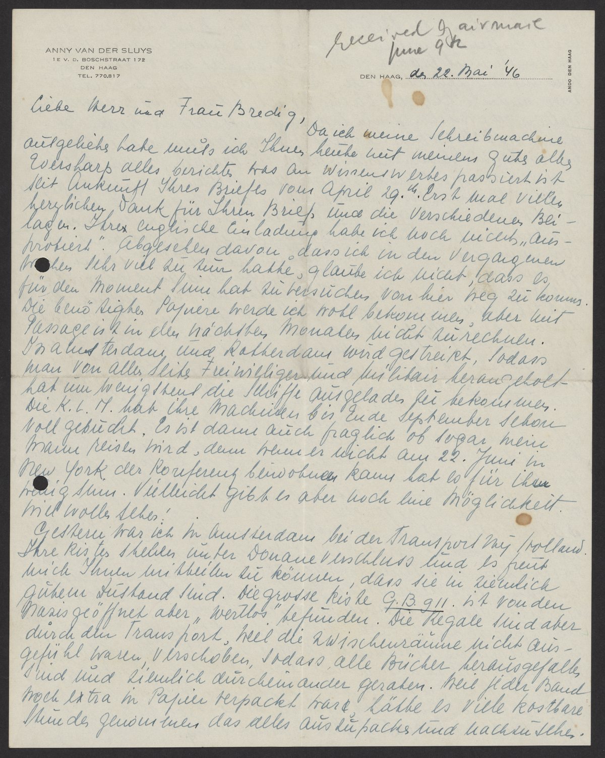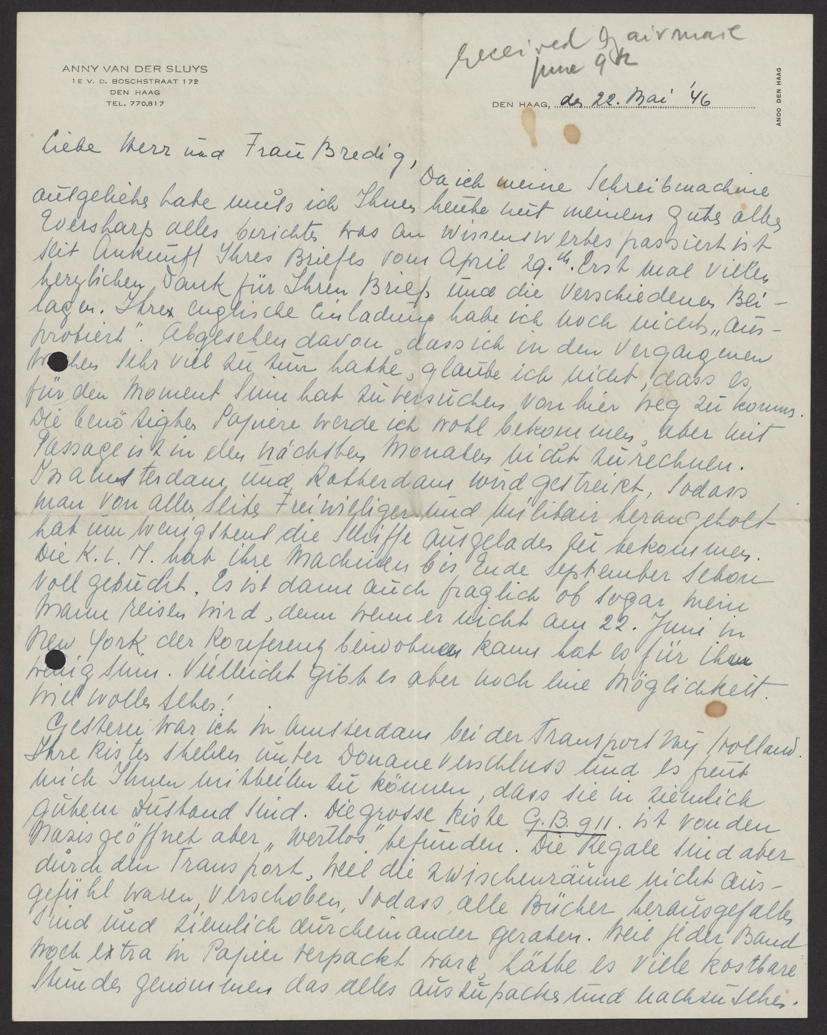 Letter from Anny van der Sluys to Max and Lydia Bredig, May 22, 1946