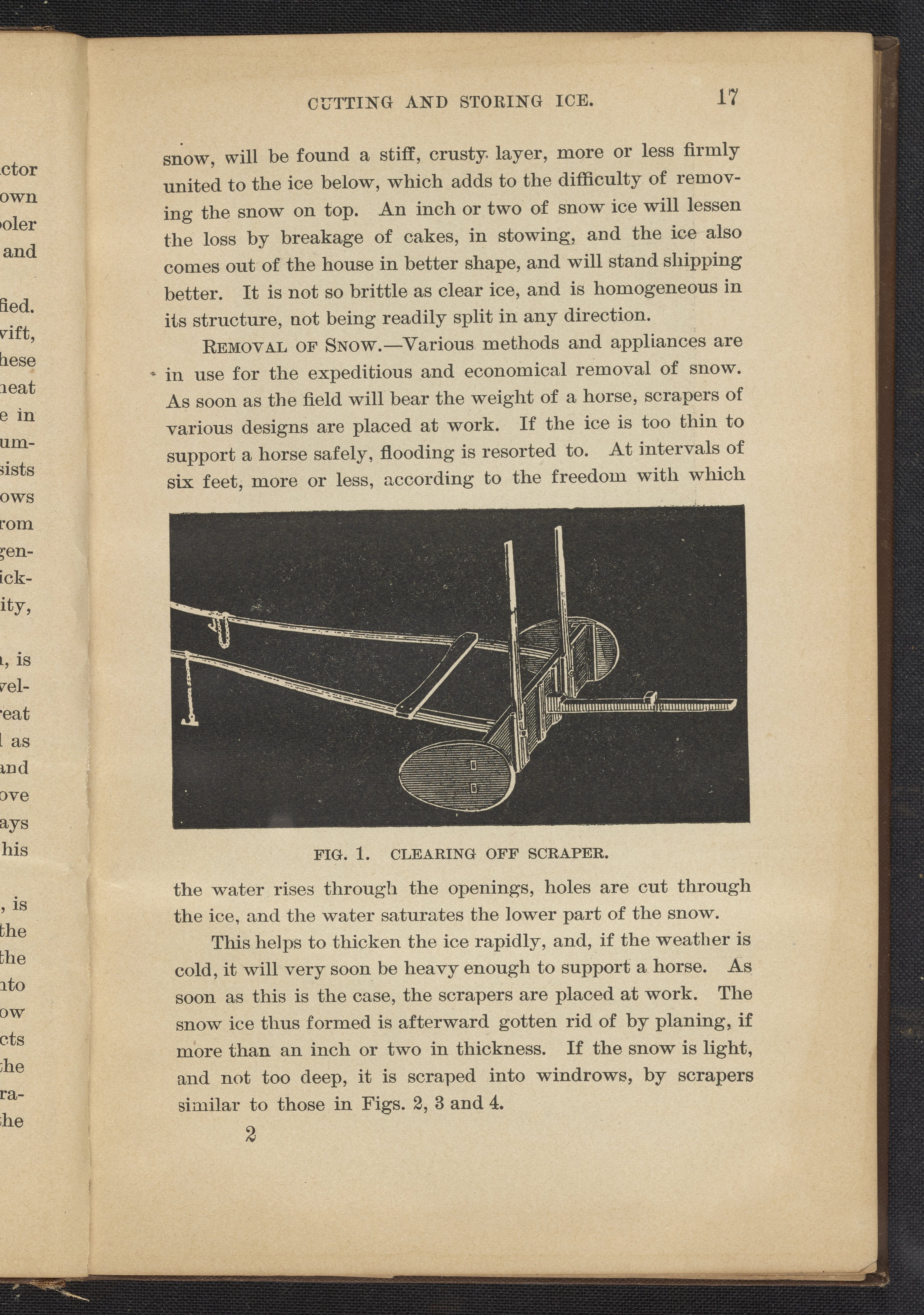 Figure 1 from the 1893 volume The Ice Crop: How to Harvest, Store, Ship and Use Ice depicting a scraper used to remove snow from the surface of a lake or river prior to the harvesting of ice. Historically, ice harvesting or cutting was a winter task of collecting surface ice from lakes and rivers for storage in ice houses and use or sale as a cooling method.