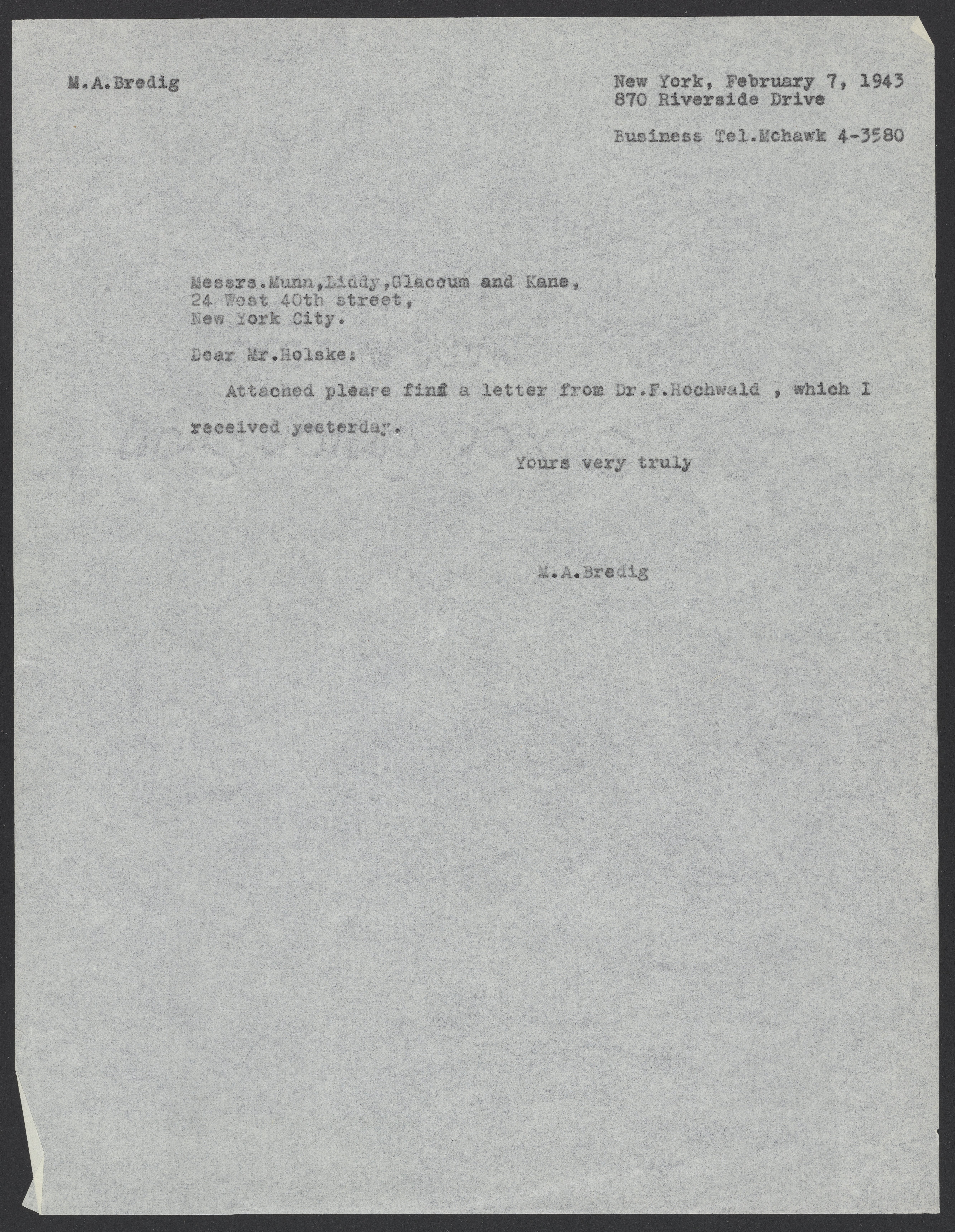 Max Bredig (1902-1977) forwards attorney Clarence Holske a letter from Fritz Hochwald (1897-1968).