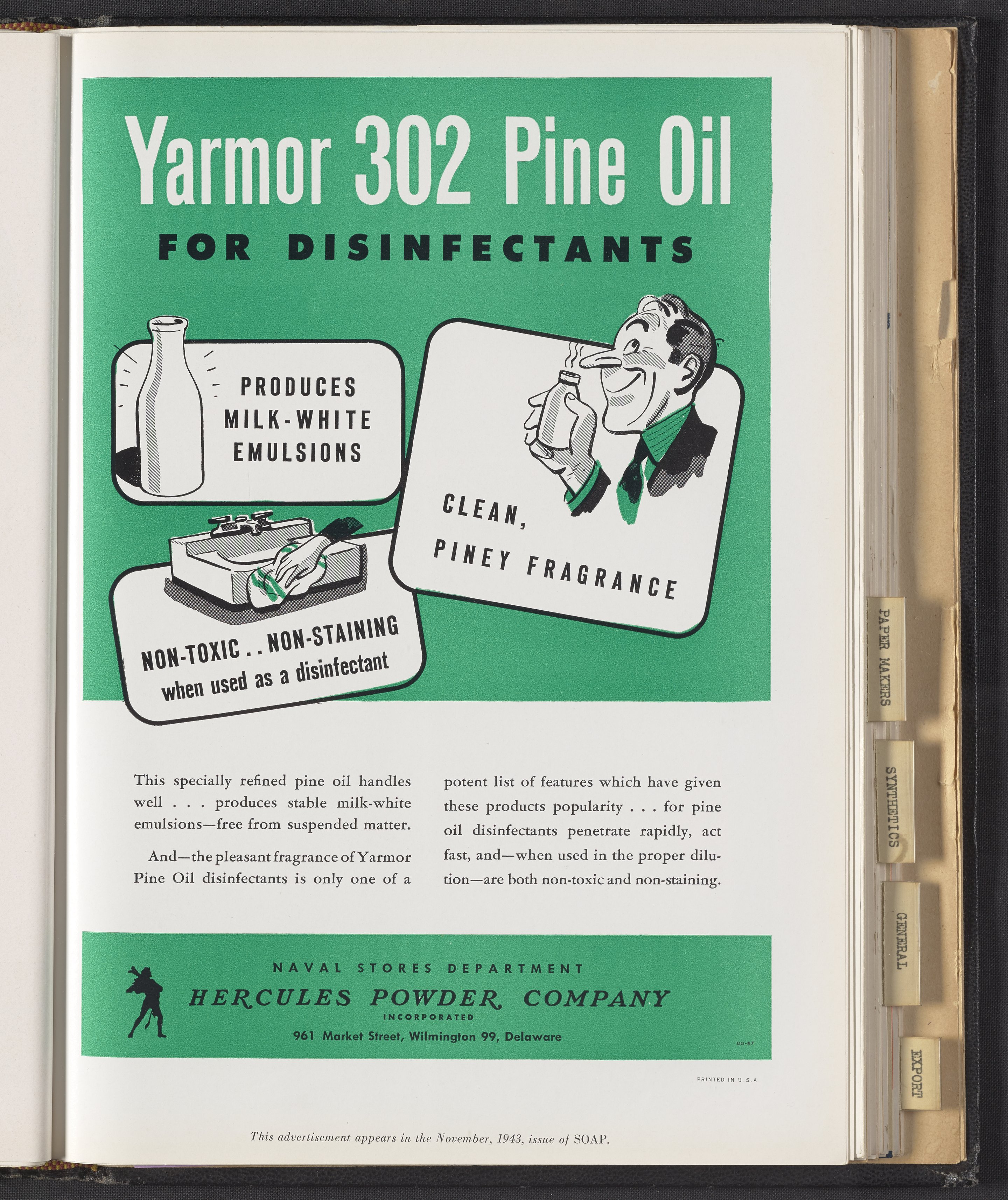 Hercules Incorporated. “Yarmor 302 Pine Oil for Disinfectants.” 1943 Hercules Advertisements, 1943. Records of Hercules Incorporated, Volume 1943. Science History Institute. Philadelphia. https://digital.sciencehistory.org/works/d791sg78q.