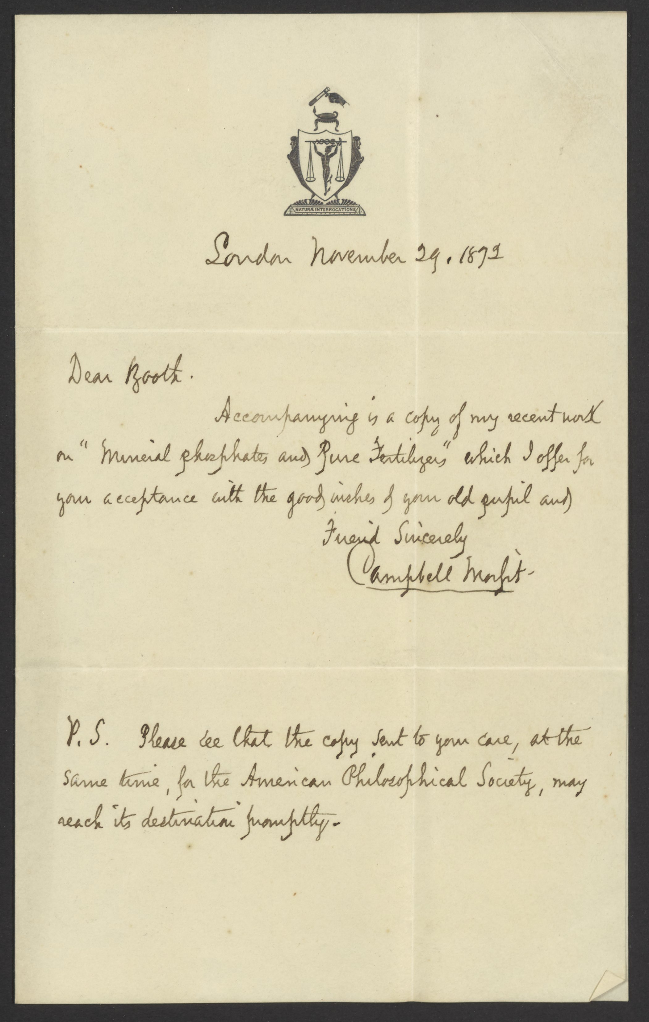 Morfit, Campbell. “Letter from Campbell Morfit to James Curtis Booth, November 29, 1872,” November 29, 1872. Papers of James Curtis Booth, Box 1, Folder 10. Science History Institute. Philadelphia. https://digital.sciencehistory.org/works/dck2llc.