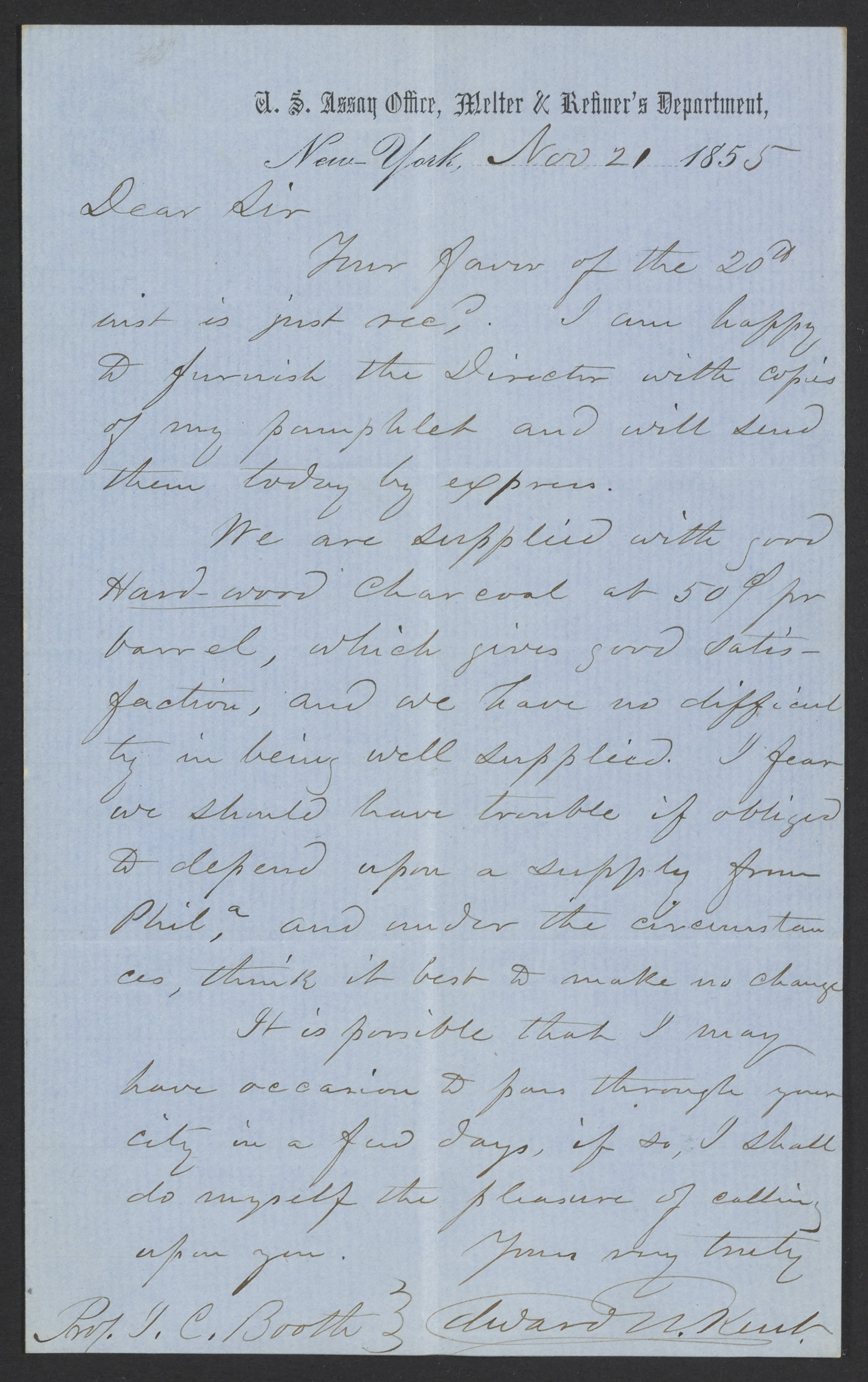 Small JPG1200 x 1909px — 348 KBFull-sized JPG2089 x 3324px — 882 KBOriginal fileTIFF — 2089 x 3324px — 19.9 MBEdward N. Kent of the United States Assay Office at New York writes to inform James Curtis Booth (1810-1888) that he prefers to use hard-wood charcoal from New York rather than depend upon supplies from Philadelphia.