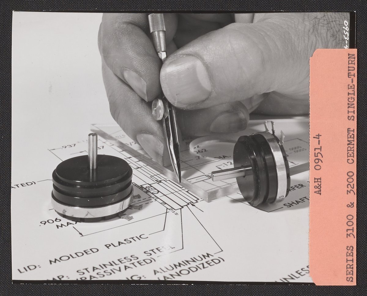 Armstrong & Hess. “Helipot Series 3100 and 3200 Cermet Single-Turn Potentiometers with Diagram and Hand for Scale,” 1950–1969. Beckman Historical Collection, Box 86. Science History Institute. Philadelphia. https://digital.sciencehistory.org/works/df65v8181.