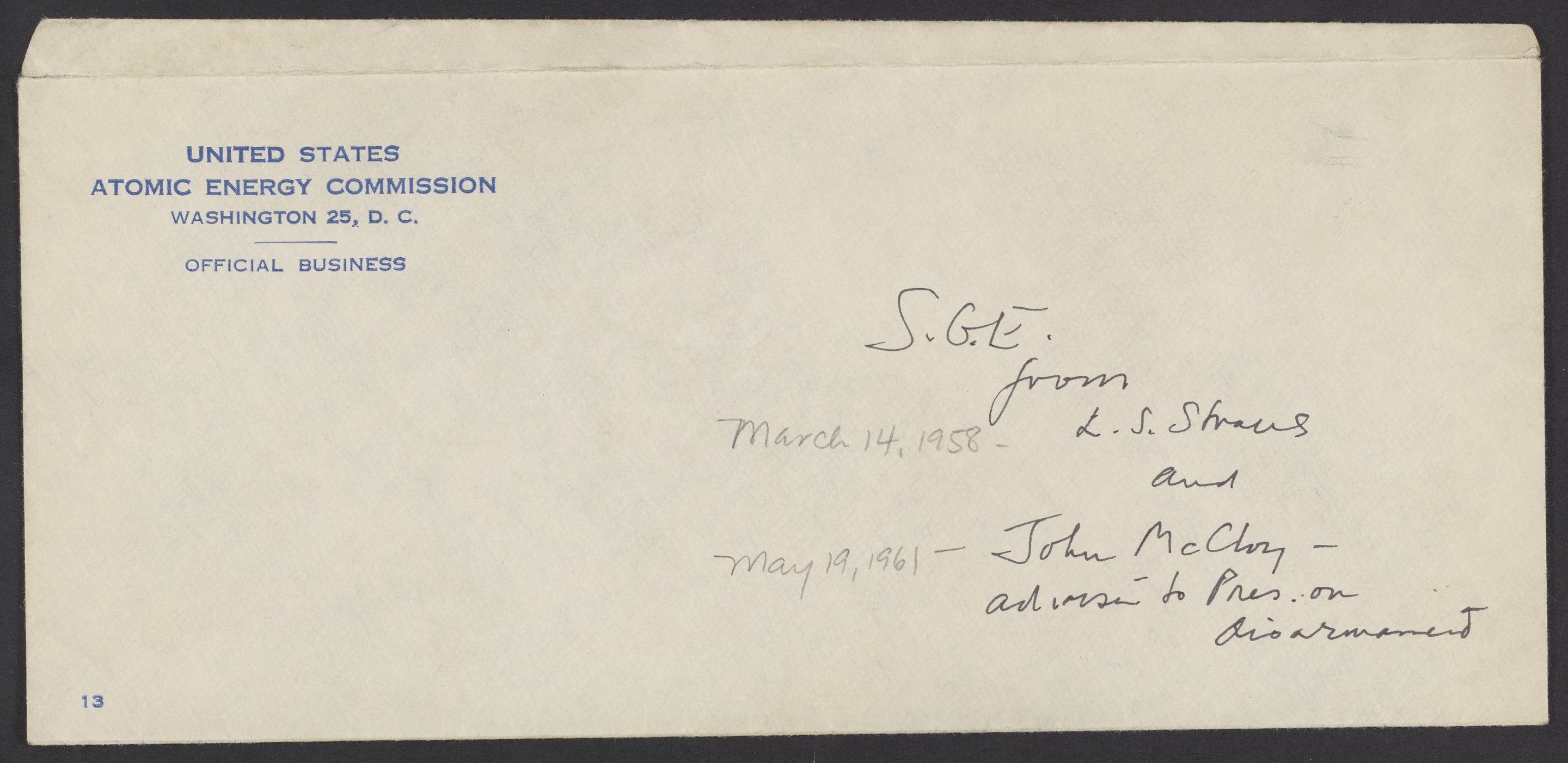 Small JPG1200 x 1572px — 200 KBLarge JPG2880 x 3774px — 1.3 MBFull-sized JPG5040 x 6604px — 3.9 MBOriginal fileTIFF — 5040 x 6604px — 95.3 MBLetter from U.S. Senator Hubert H. Humphrey (1911-1978) to Lewis L. Strauss (1896-1974), chair of the U.S. Atomic Energy Commission. Humphrey thanks Strauss, Spofford Grady English (1916-1981), and Alfred Dodd Starbird (1912-1983) for helping the United States Senate Committee on Foreign Relation's Subcommittee on Disarmament. (The Disarmament Subcommittee of the U.S. Senate's Committee on Foreign Relations was created in 1955. In 1958 it expired and was replaced by the Subcommittee on Disarmament.)