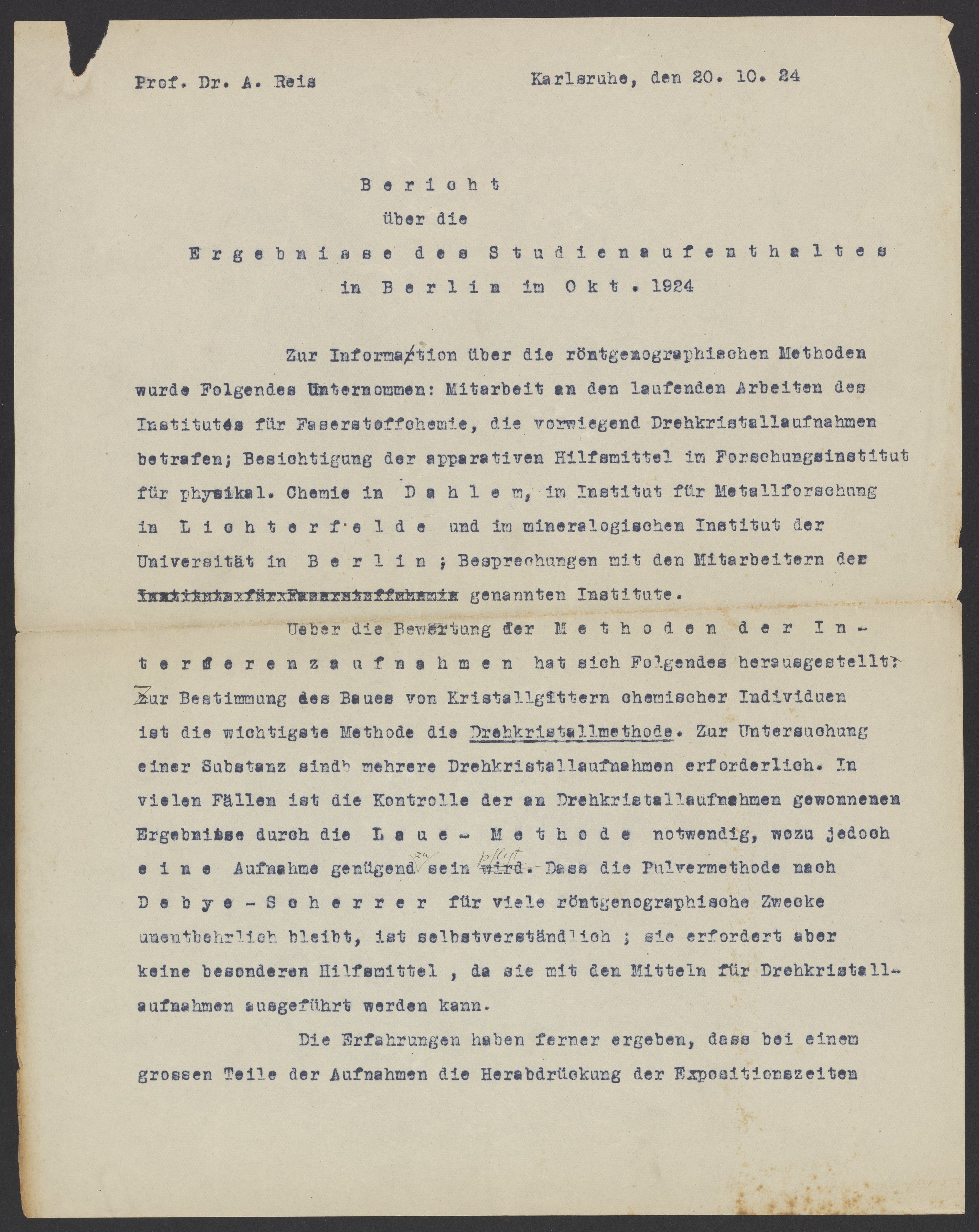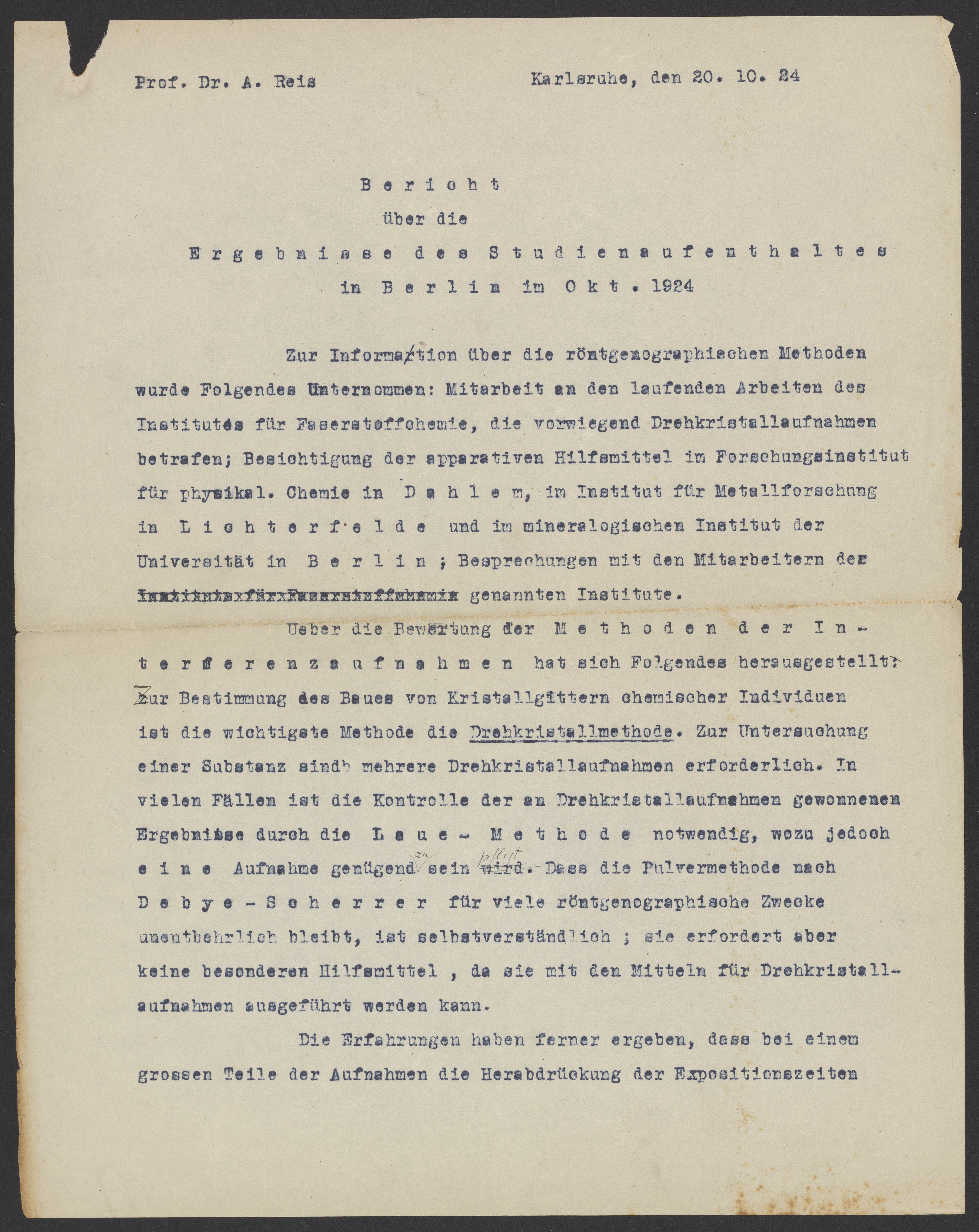 Scientific Report by Alfred Reis sent to Georg Bredig, October 1924