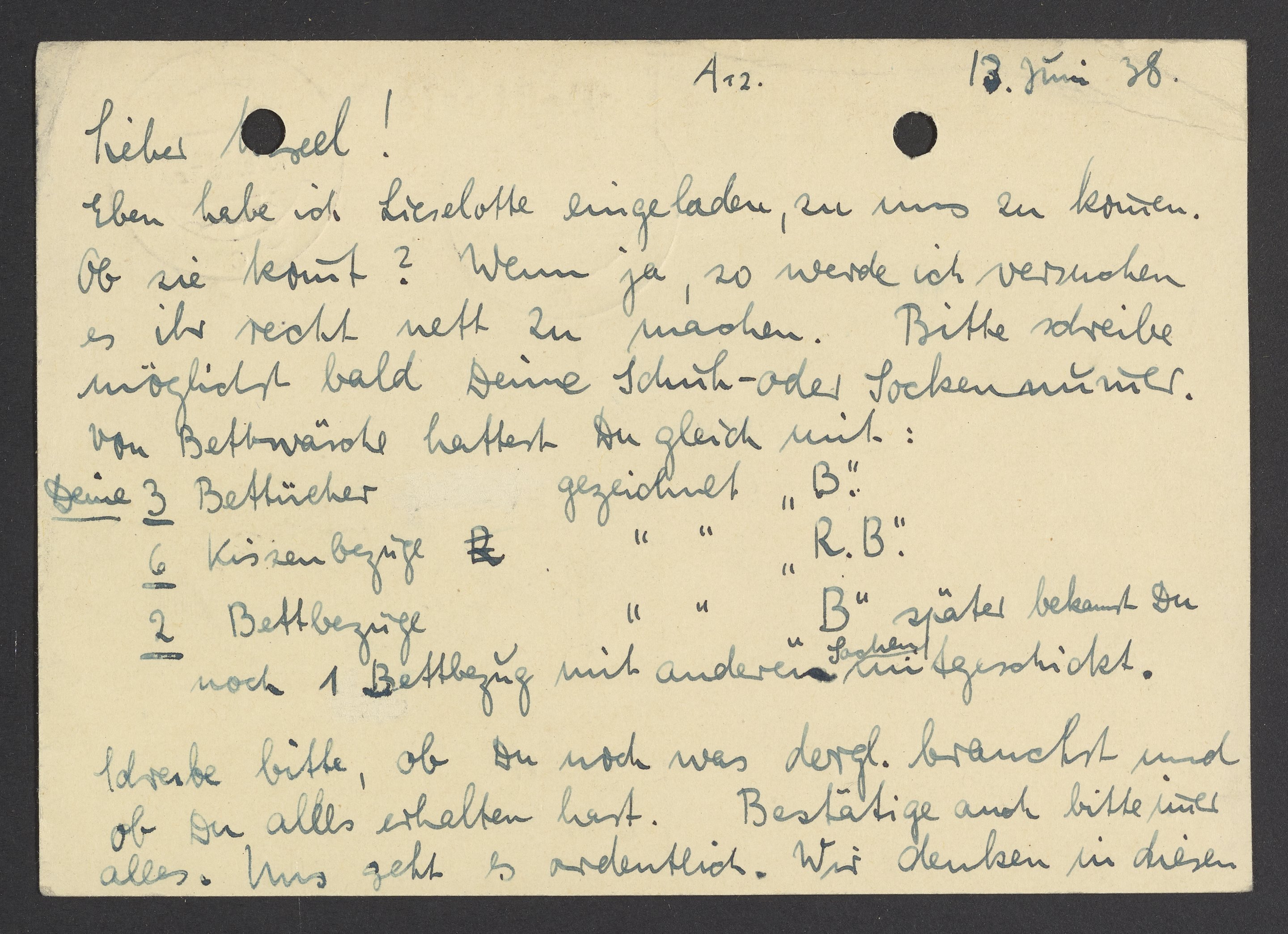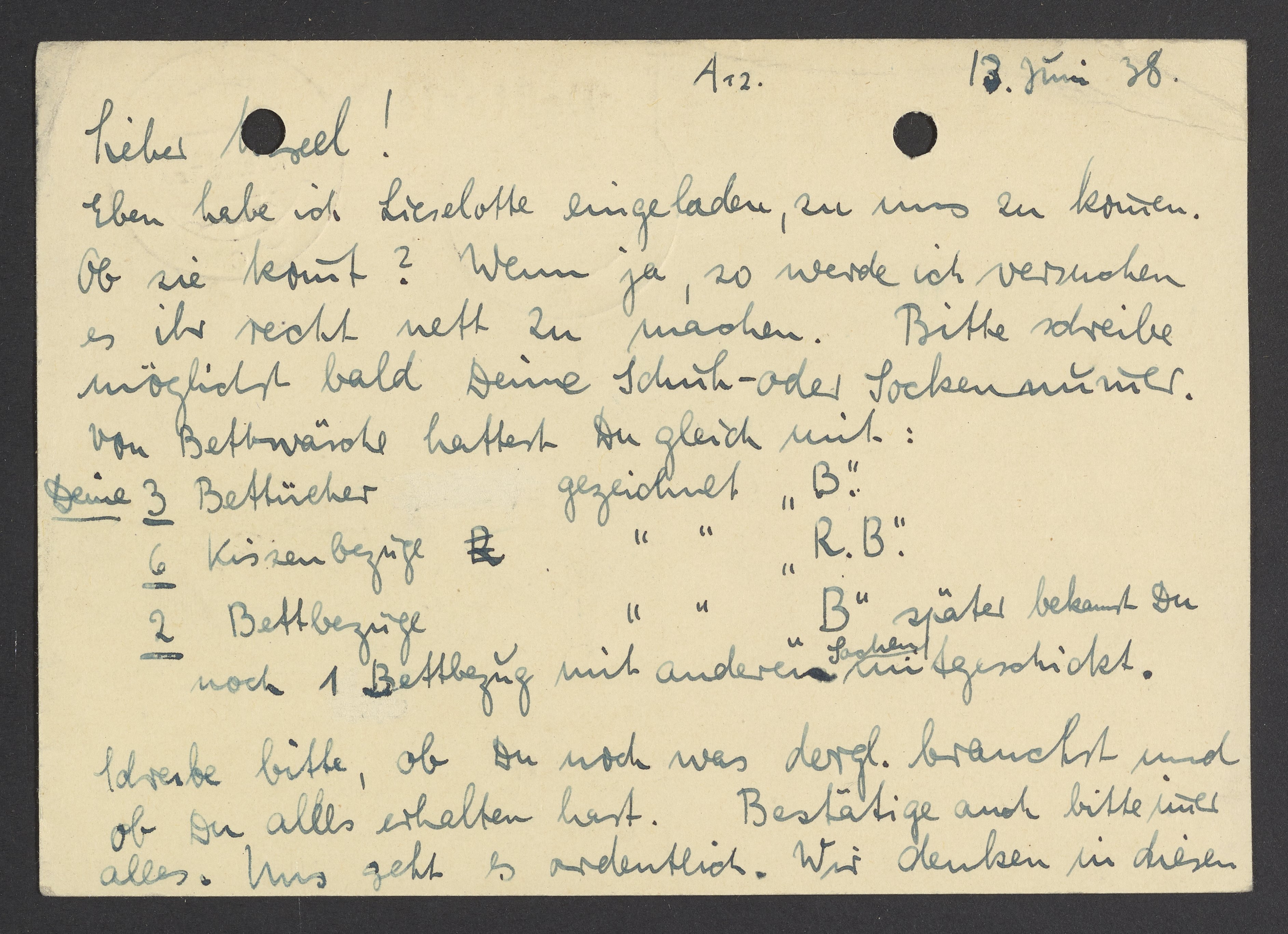 Eben habe ich Lieselotte eingeladen, zu uns zu kommen. Ob sie kommt? Wenn ja, so werde ich versuchen es ihr recht nett zu machen. Bitte schreibe möglich bald Deine Schuh-oder Sockennummer. Von Bettwäsche hattest Du gleich mit: