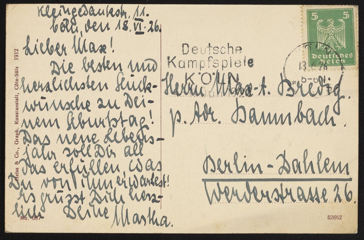 “Postcard from Cologne, Germany to Max Bredig, 1926,” June 13, 1926. Papers of Max Bredig, Box 20. Science History Institute. Philadelphia. https://digital.sciencehistory.org/works/diarzdn.