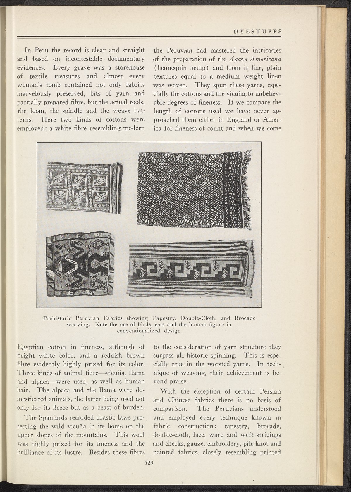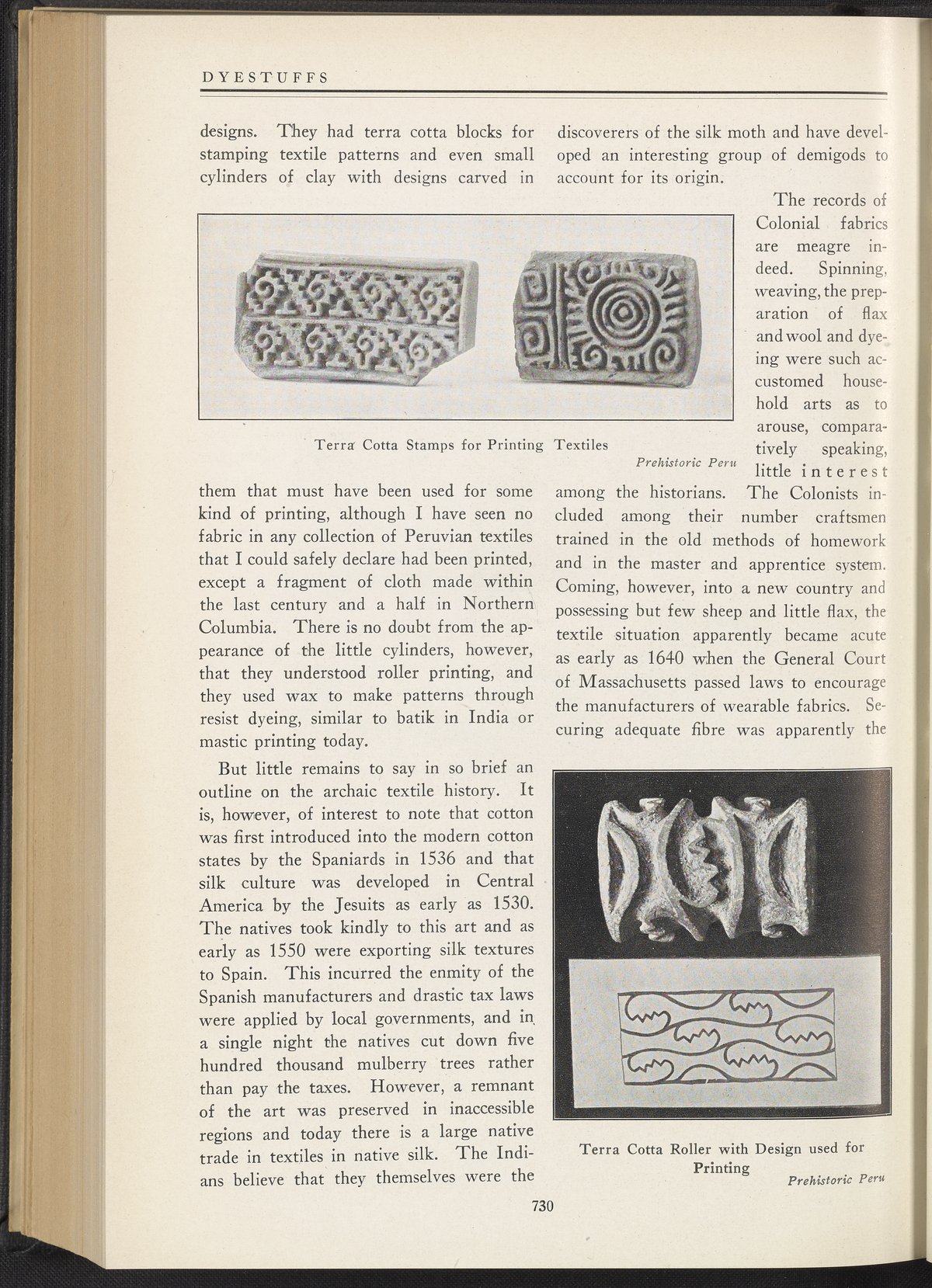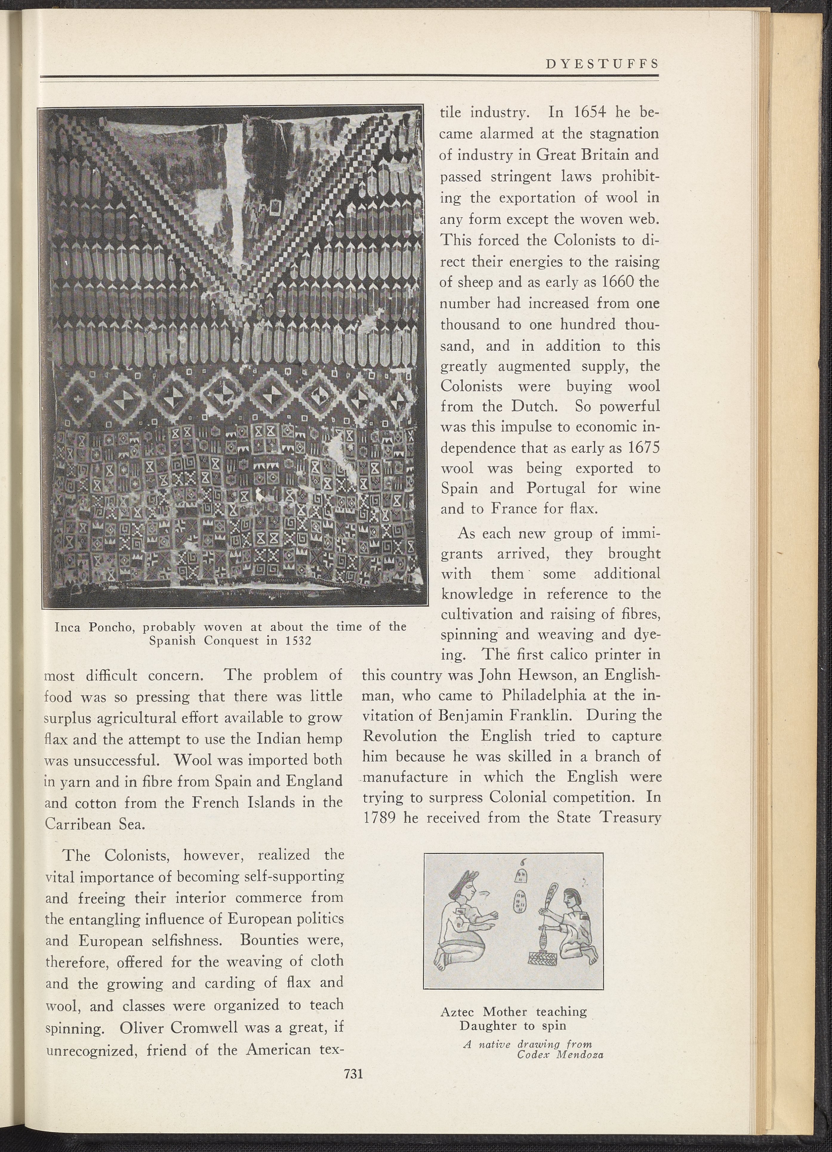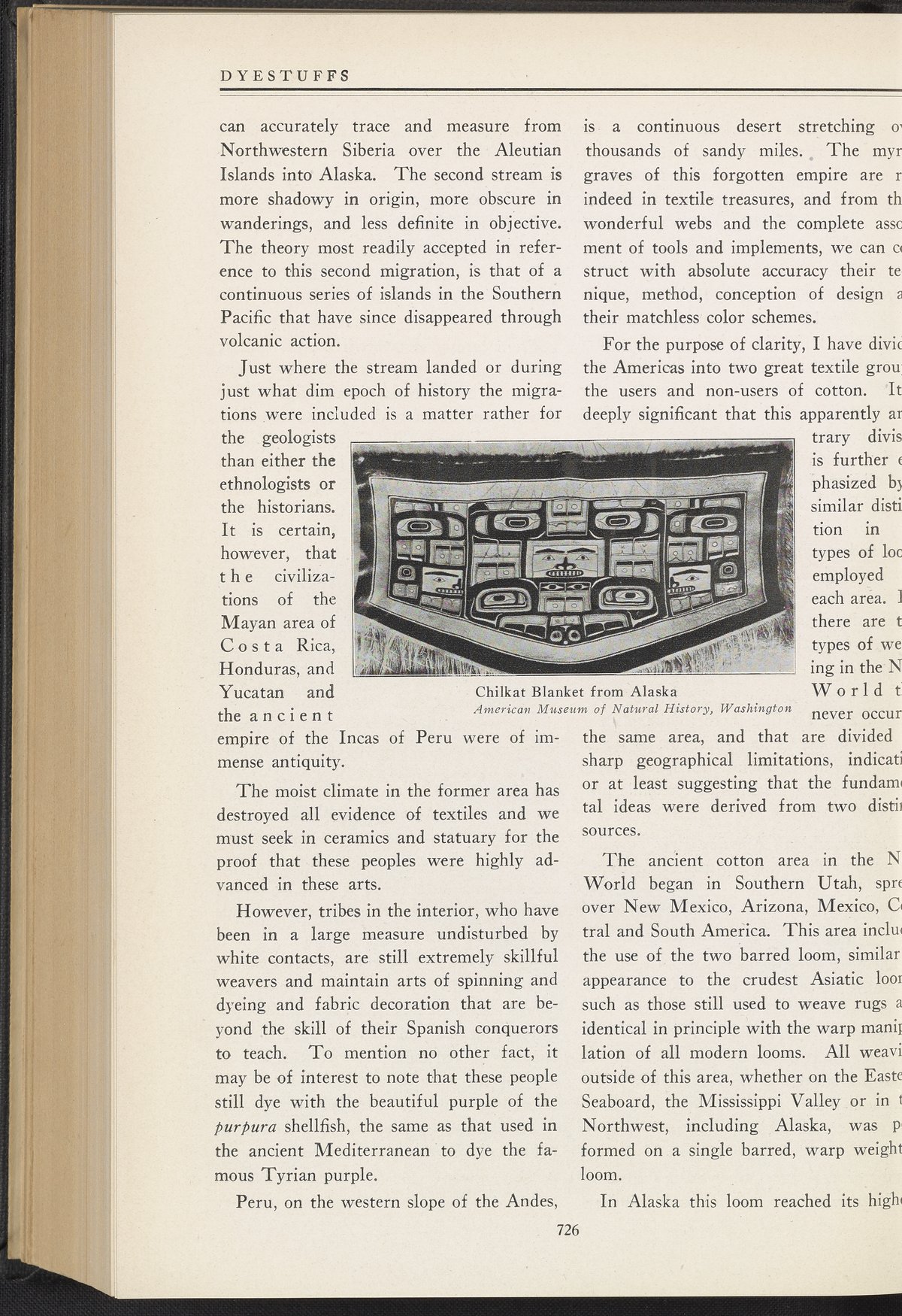 The journal contains reprints of select articles from periodicals in the dyeing and textile fields. This issue is the "Textile Exposition Number" and contains an article by M. D. C. Crawford titled The History of Textiles in the New World in which the author discusses textile arts of indigenous peoples of the Americas. This issue includes black and white printed illustrations.
