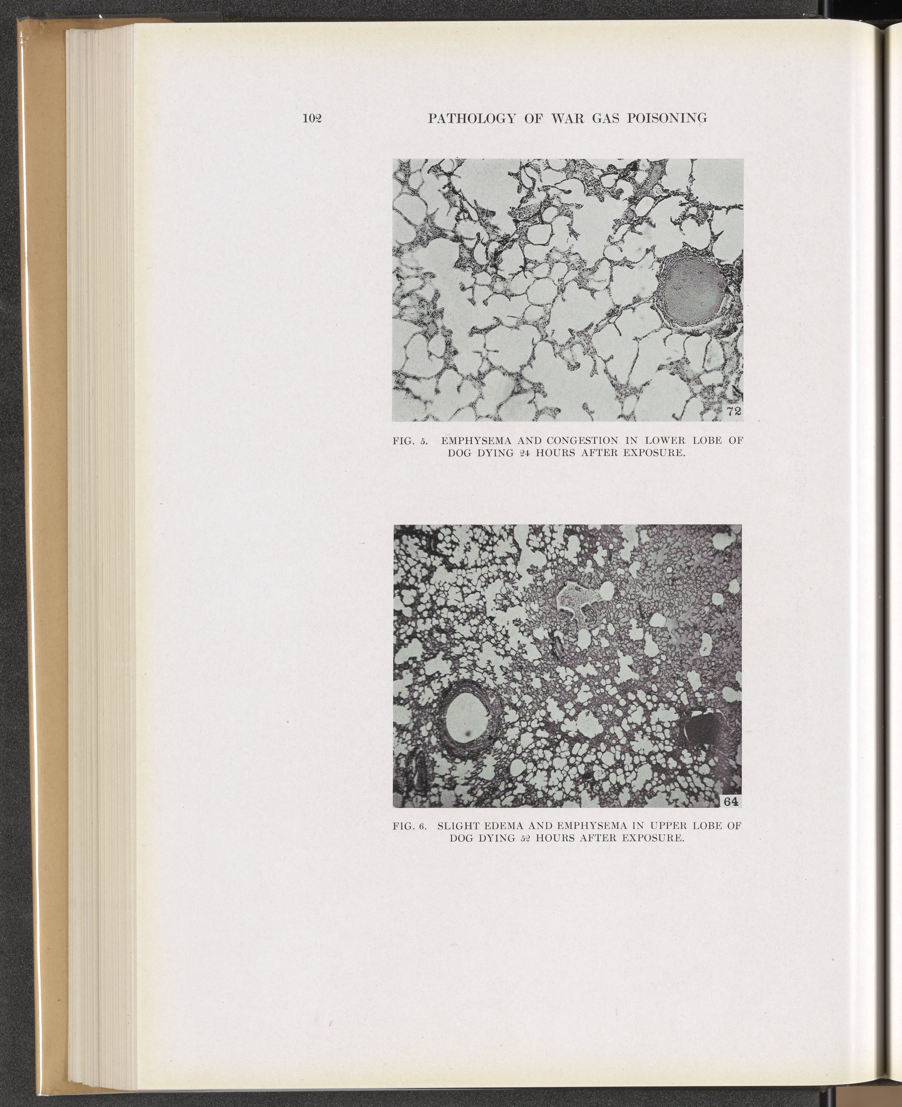 Winternitz, M. C. (Milton C.). “Fig. 5: Emphysema and Congestion in Lower Lobe of Dog Dying 24 Hours after Exposure. Fig. 6: Slight Edema and Emphysema in Upper Lobe of Dog Dying 52 Hours after Exposure.” Collected Studies on the Pathology of War Gas Poisoning. New Haven, Connecticut: Yale University Press, 1920. https://digital.sciencehistory.org/works/dj52w485x.