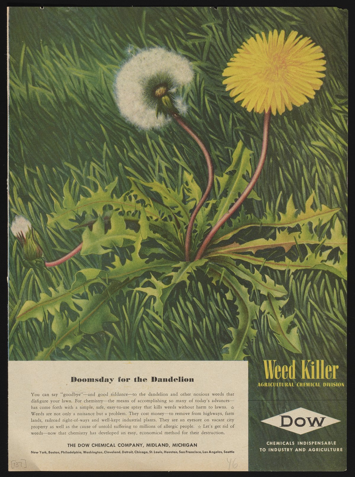 Dow Chemical Company. “Doomsday for the Dandelion,” 1946. Advertisements from the Dow Chemical Historical Collection, Box 7. Science History Institute. Philadelphia. https://digital.sciencehistory.org/works/dj52w5498.