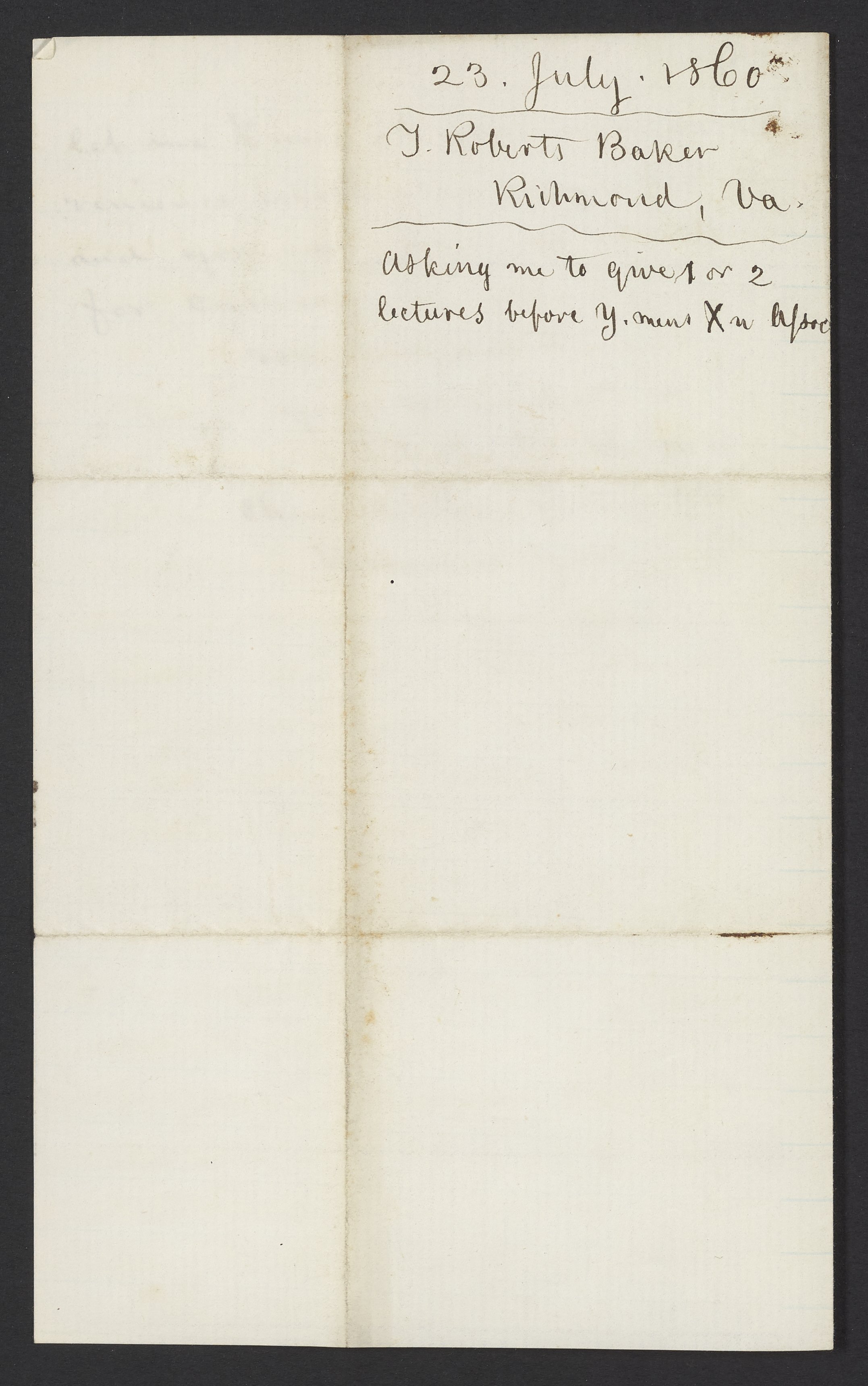 Small JPG1200 x 1937px — 318 KBFull-sized JPG2130 x 3438px — 863 KBOriginal fileTIFF — 2130 x 3438px — 21.0 MBT. Roberts Baker asks James Curtis Booth (1810-1888) to give one or two lectures before the Young Men's Christian Association (Y.M.C.A.).