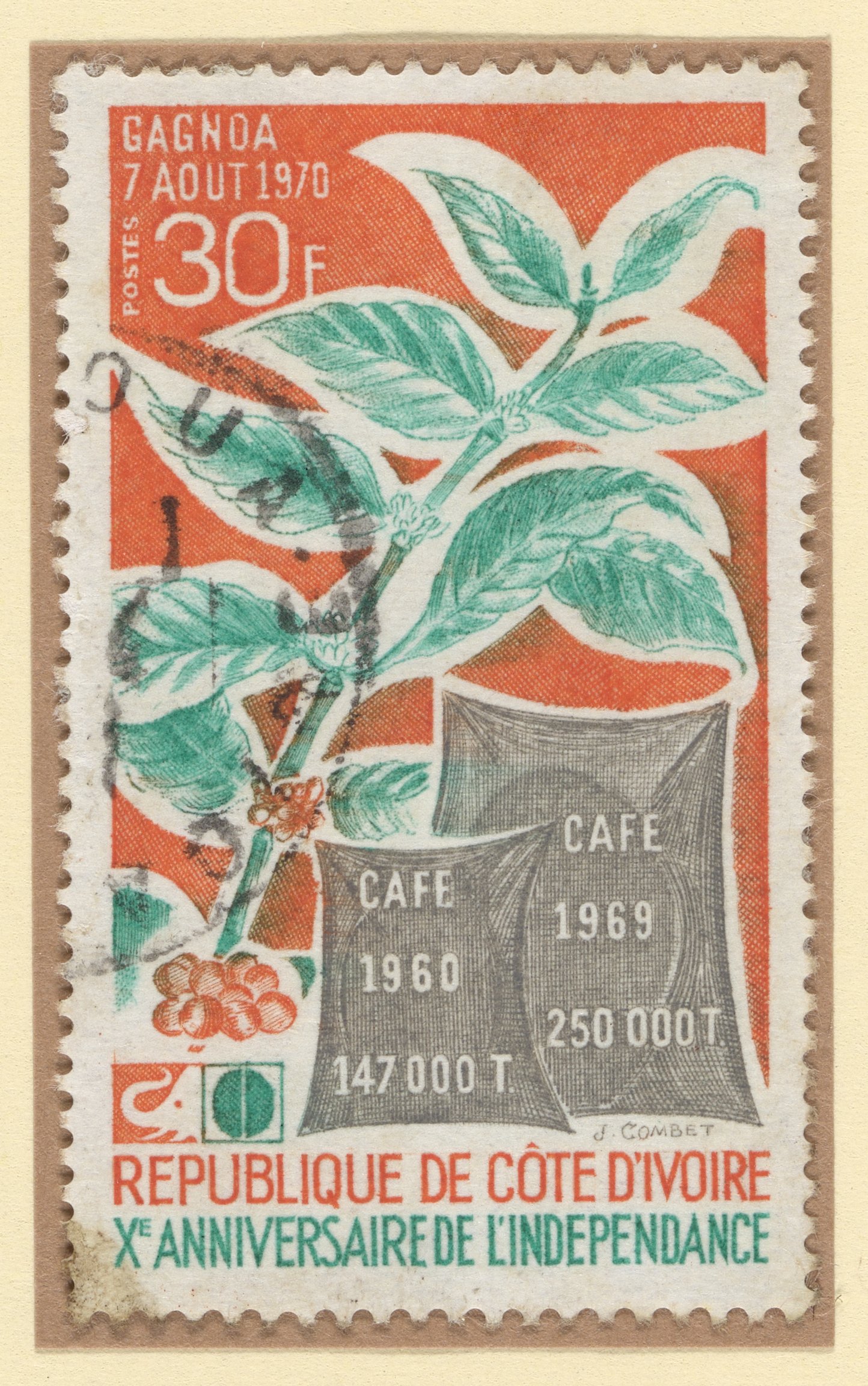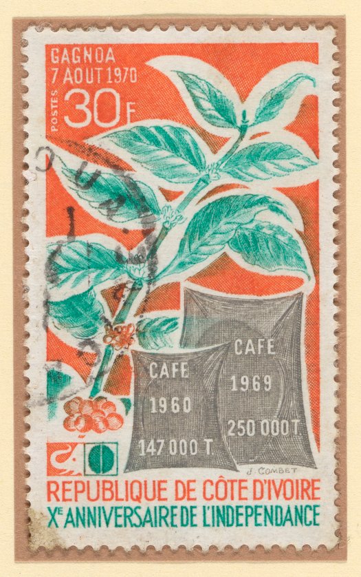 Postage stamp commemorating Côte d'Ivoire's (Ivory Coast) 10th anniversary of independence. Côte d'Ivoire was the largest coffee producer in the 1970s and 1980s. The stamp features an illustration of a coffee bush as well as bags of coffee beans.