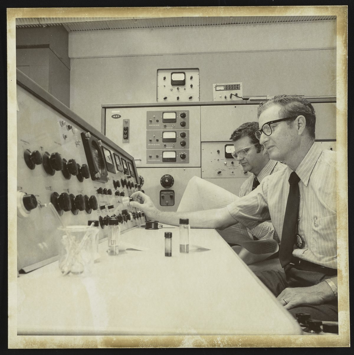 View of a Mass Spectrometer 9 (MS-9) in use at the Exxon Research and Engineering Company analytical laboratory located in Baytown, Texas. On the left, Research Associate Henry Earle Lumpkin operates the console while, on the right, Senior Research Associate Thomas Aczel consults a chart. Manufactured in Manchester, England by Associated Electrical Industries (AEI), this MS-9 was the first installed in the United States.