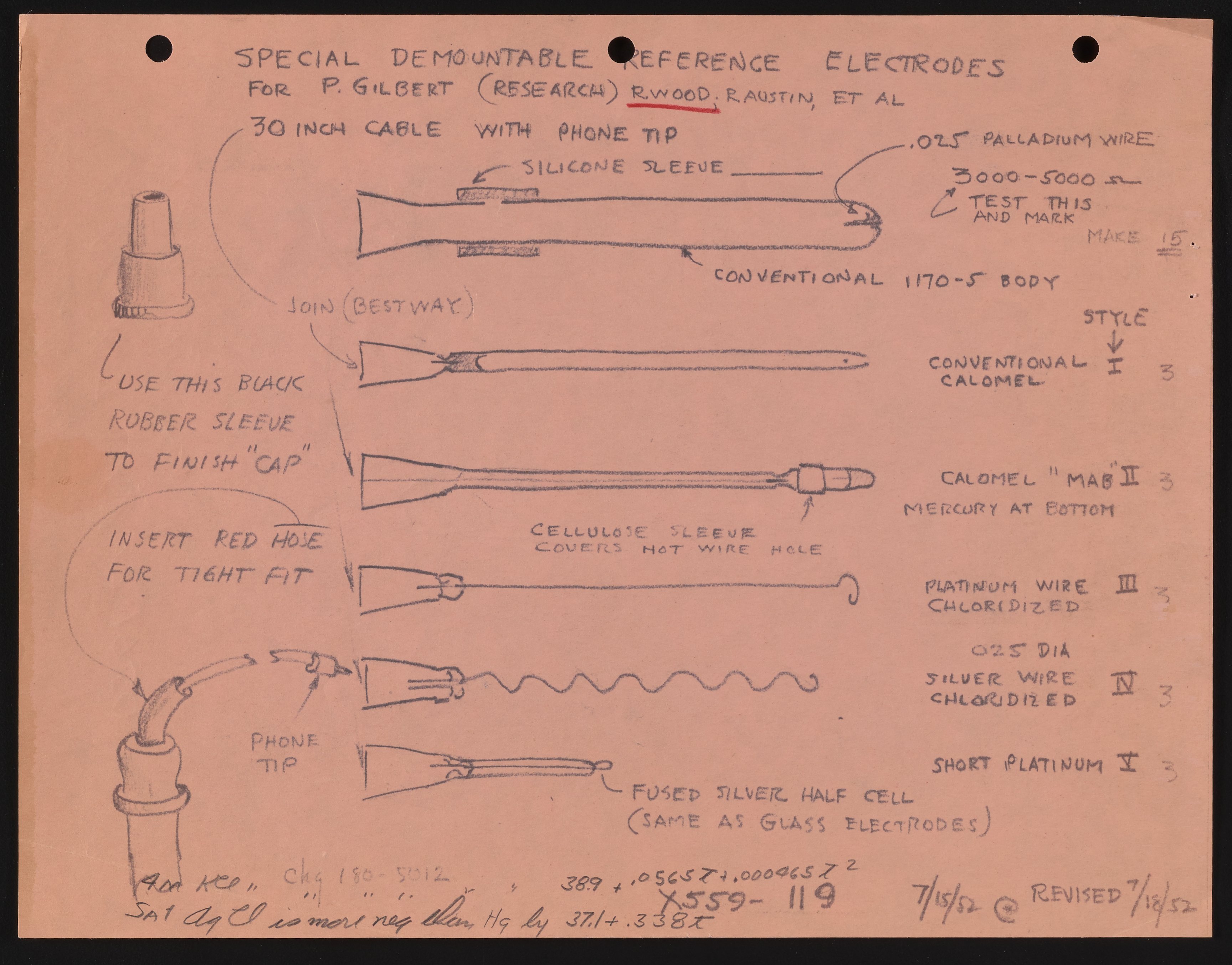 “Diagram of Special Demountable Reference Electrodes,” July 18, 1952. Beckman Historical Collection, Box 18, Folder 26. Science History Institute. Philadelphia. https://digital.sciencehistory.org/works/dn39x1888.