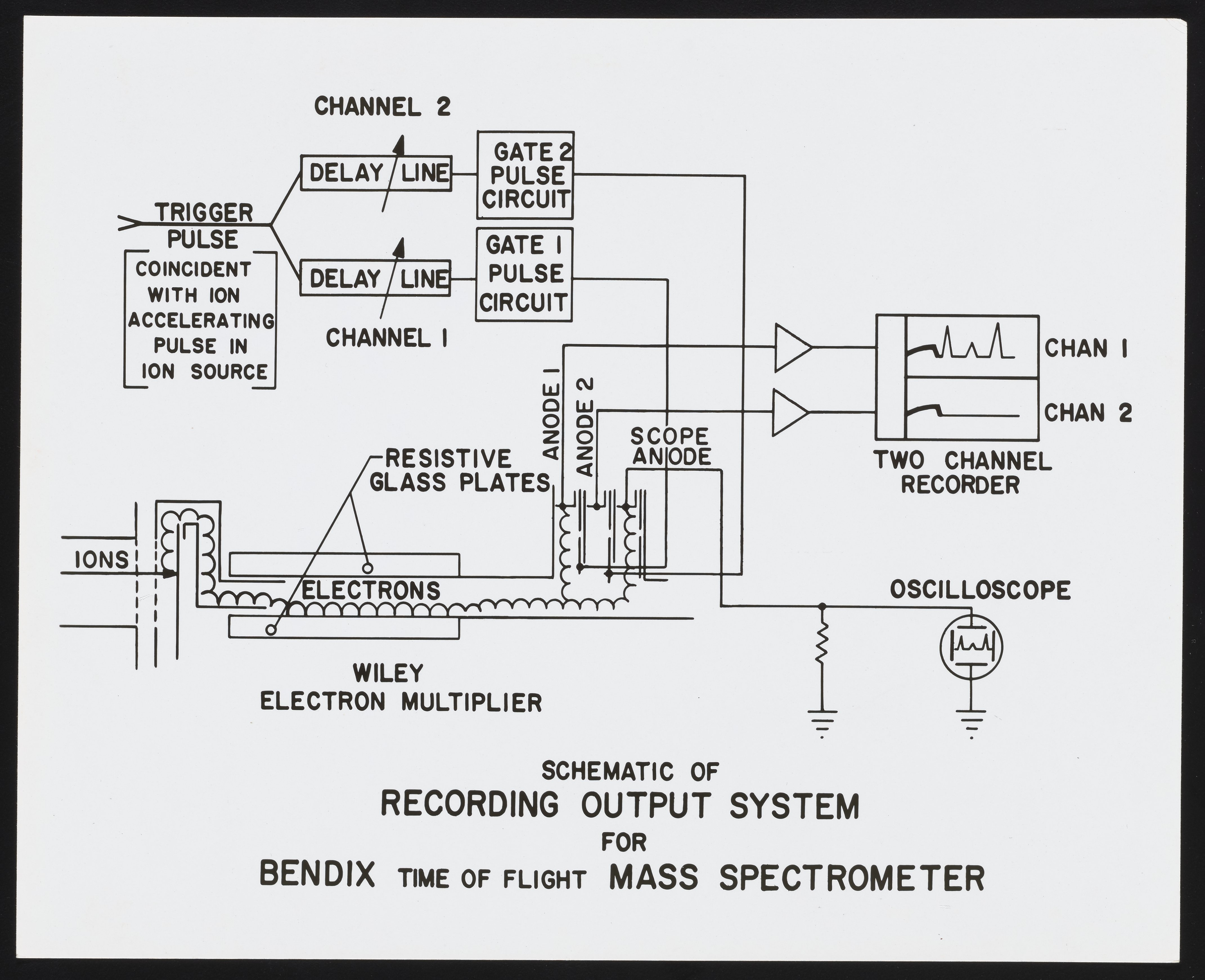 Schematic diagram depicting the recording output system for a Bendix Time-of-Flight Mass Spectrometer, with view of oscilloscope, two channel recorder, resistive glass plates, and Wiley electron multiplier. The Time-of-Flight Mass Spectrometer (TOFMS) was the flagship analytical instrument of the Bendix Corporation.