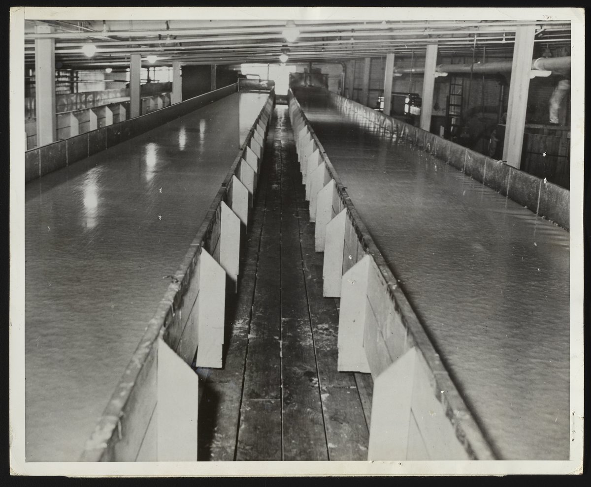 General view looking down either side of a riffle trough at the Hercules Powder Company plant in Hopewell, Virginia. The trough may have been used to clean and catch particles during the production of so-called "chemical cotton," a type of purified cellulose obtained from raw cotton linters.