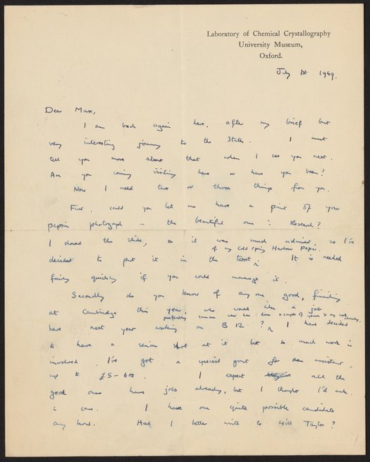 Hodgkin, Dorothy. “Letter from Dorothy Hodgkin to Max Perutz, July 1, 1949,” July 1, 1949. History of Molecular Biology Collection, Box 76, Folder 5. Science History Institute. Philadelphia. https://digital.sciencehistory.org/works/dnmui53.