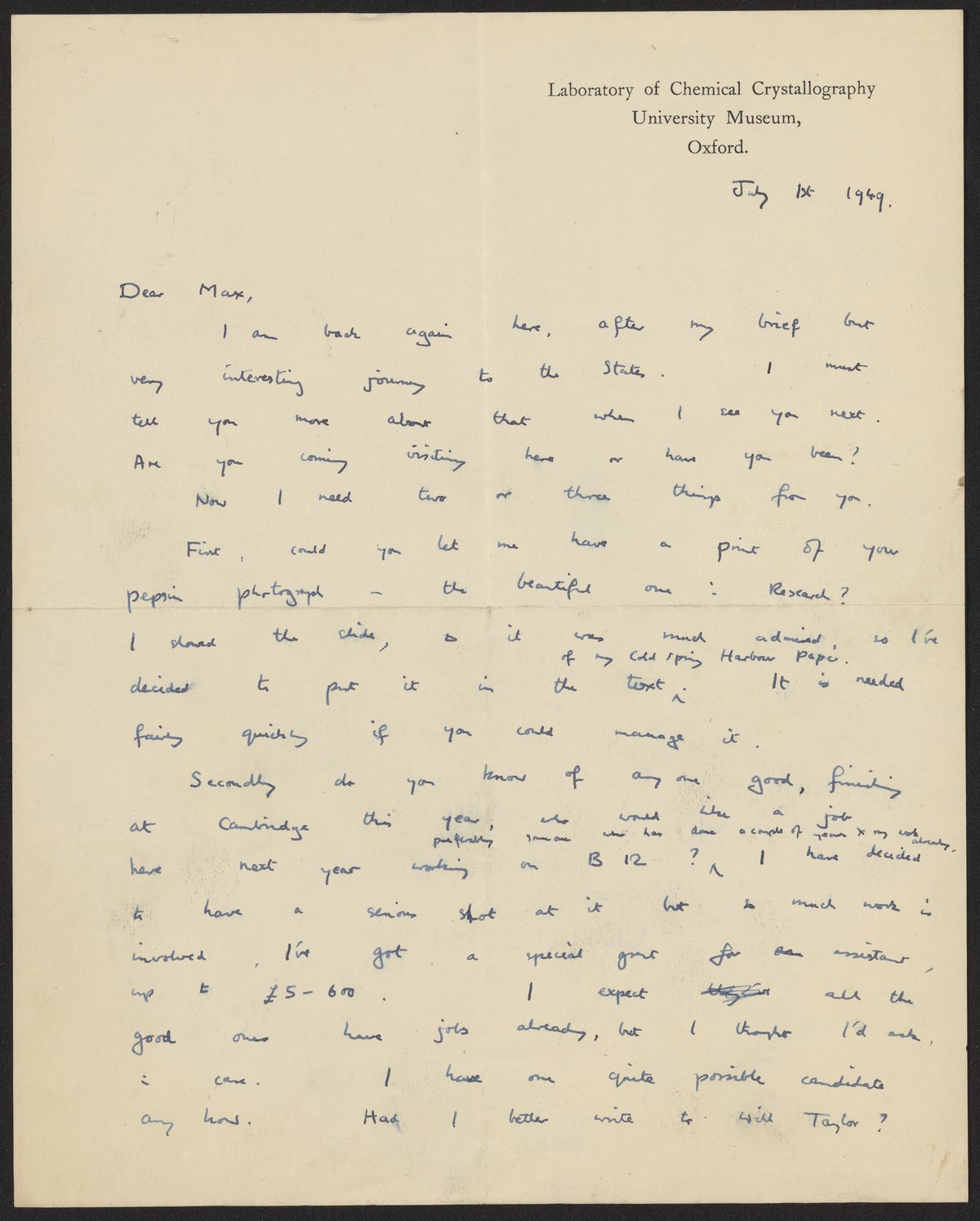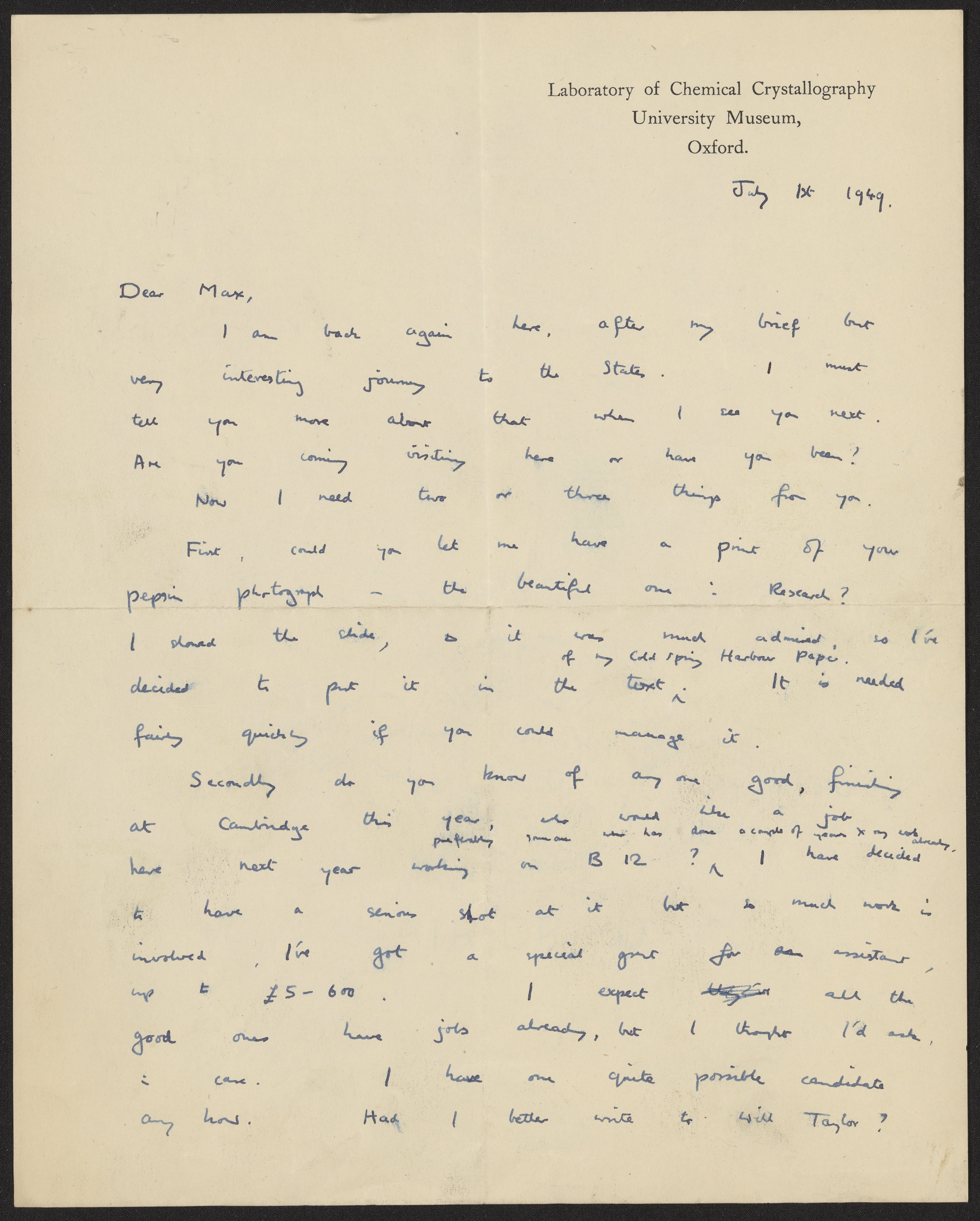 Letter from Dorothy Hodgkin to Max Perutz, July 1, 1949