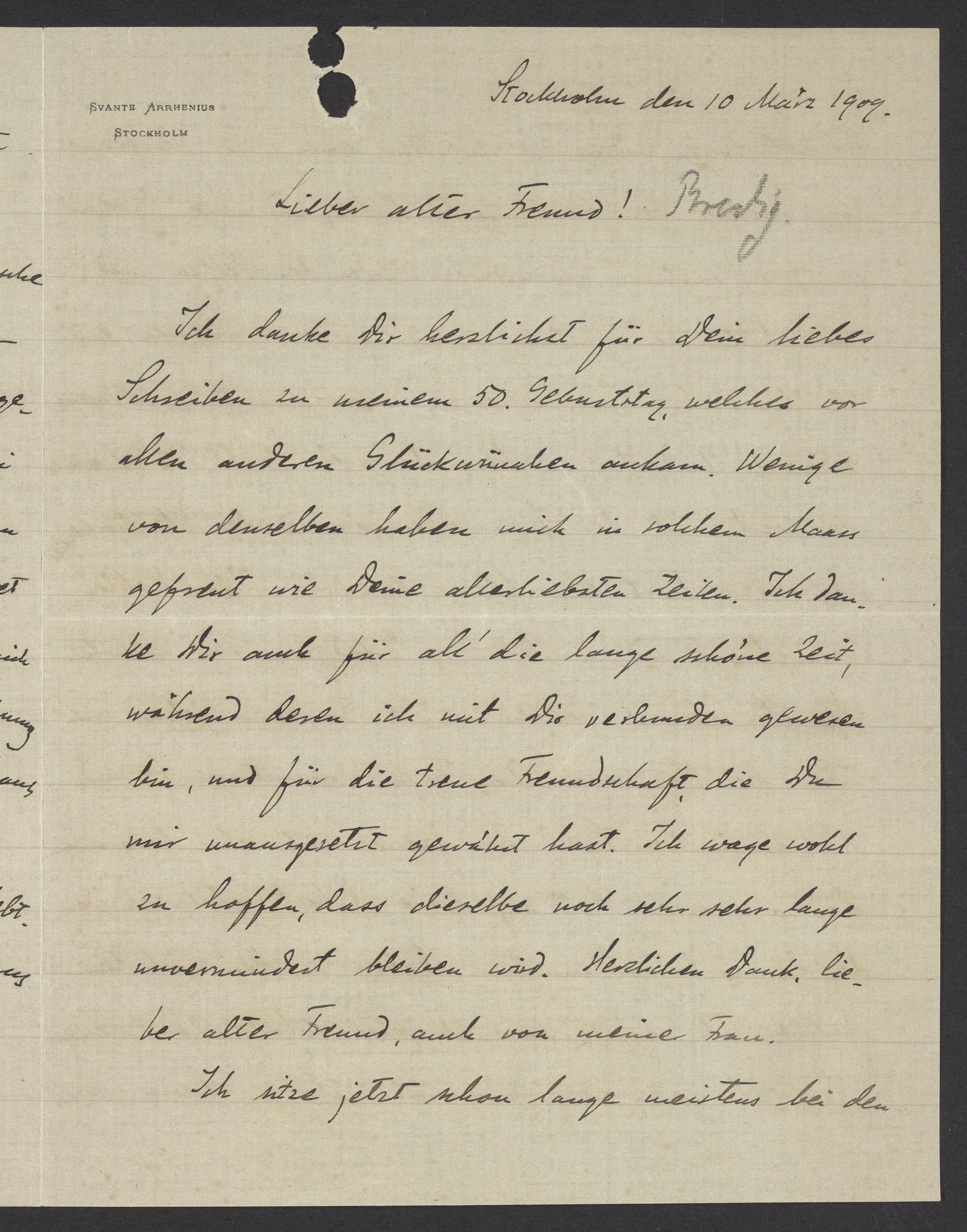 Arrhenius, Svante. “Letter from Svante Arrhenius to Georg Bredig, March 1909,” March 10, 1909. Papers of Georg and Max Bredig, Box 1, Folder 4. Science History Institute. Philadelphia. https://digital.sciencehistory.org/works/dqao8vj.