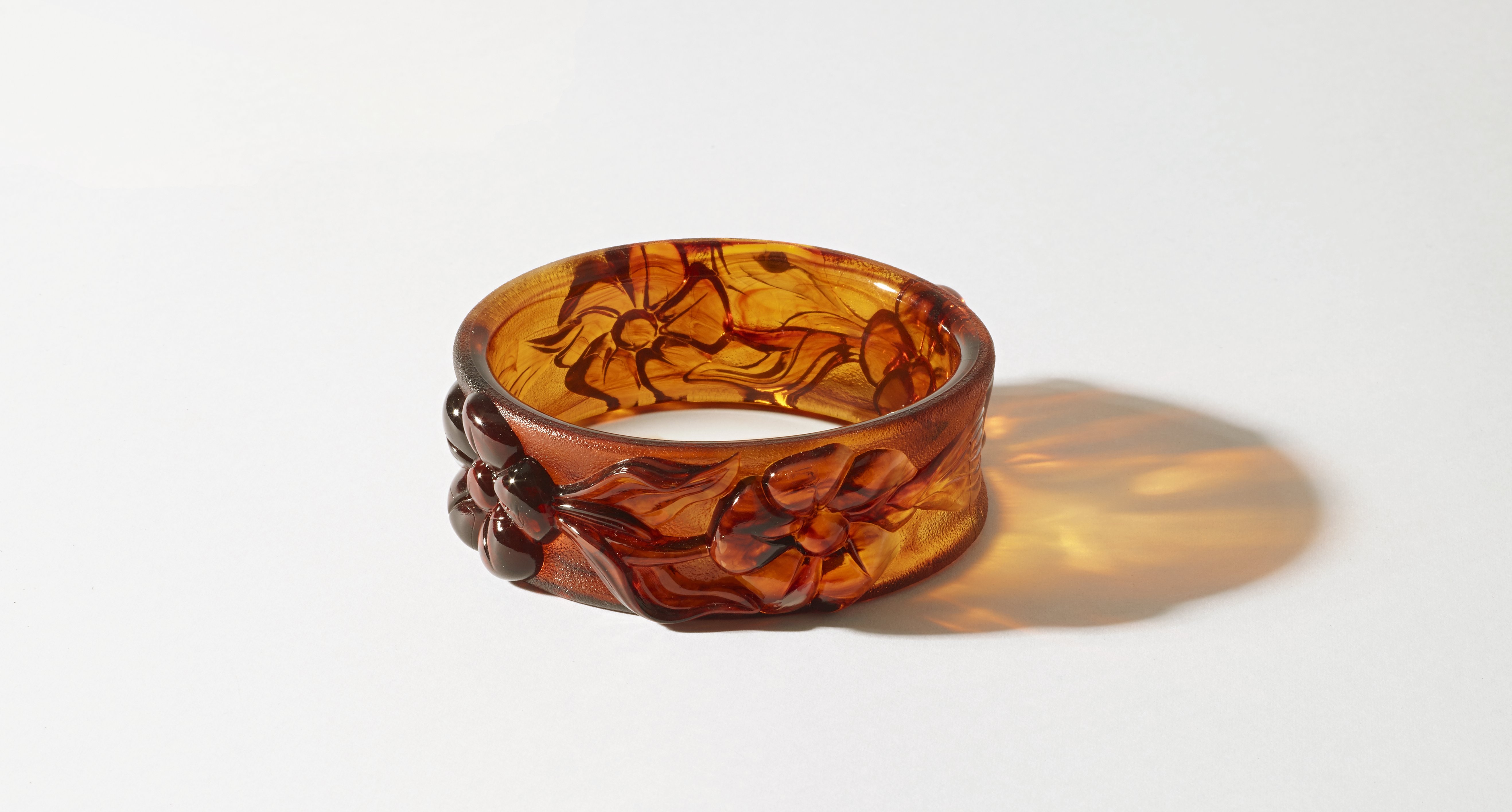 Amber-tinted lucite bracelet; exterior has raised floral pattern.
