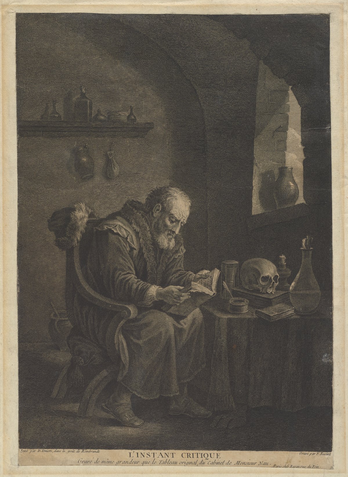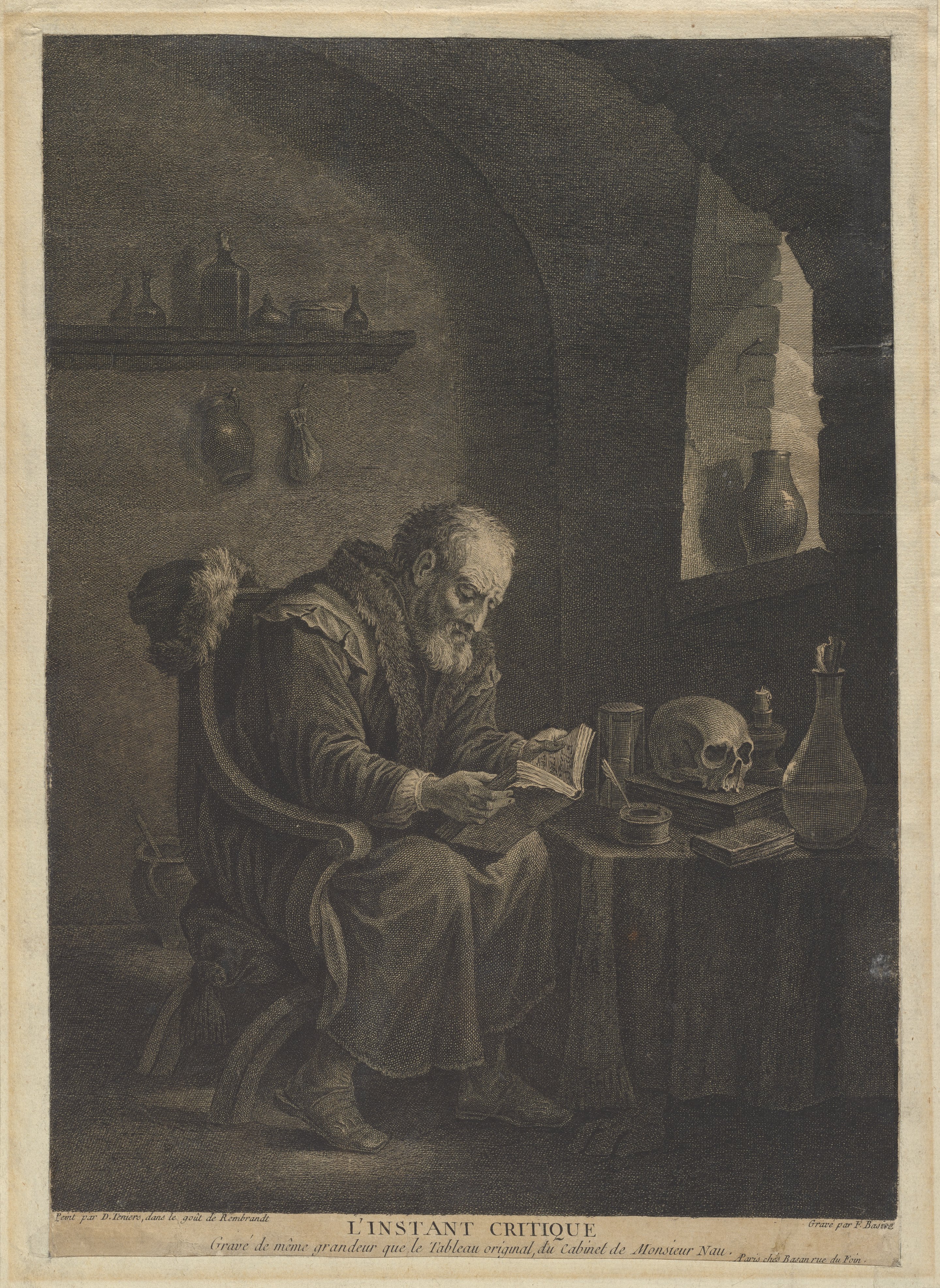 This print reproduces a scene originally painted by David Teniers, in a strongly tenebrist manner, showing the alchemist in a shadowed room beneath the light of a single window. Engaged in reading, the alchemist may be experiencing a moment of revelation as he leafs through his text. Beside him on a small table sit glass flasks and books, as well as a human skull that reminds the viewer of their own mortality.