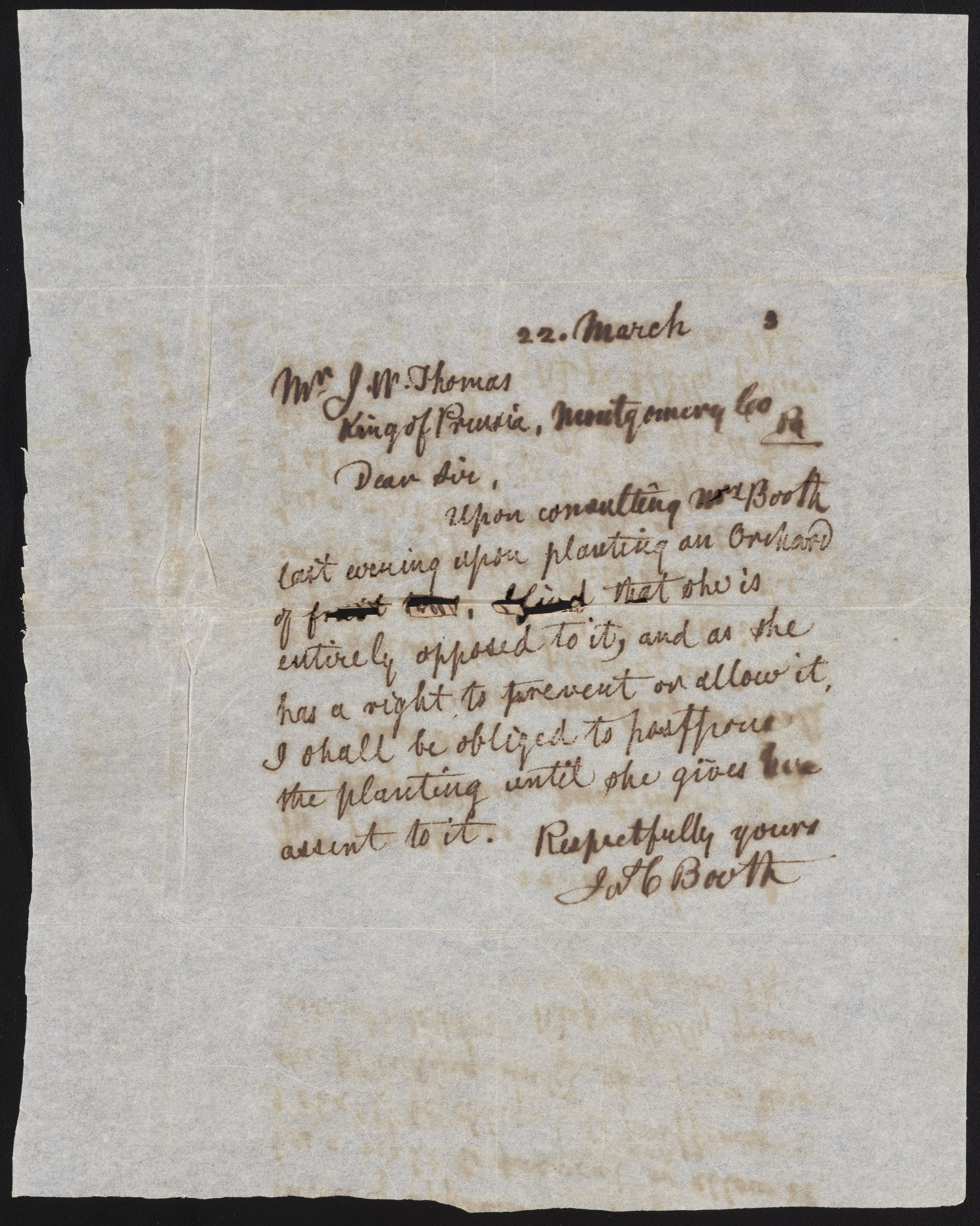 Small JPG1200 x 1501px — 360 KBLarge JPG2880 x 3603px — 2.0 MBFull-sized JPG5149 x 6441px — 5.4 MBOriginal fileTIFF — 5149 x 6441px — 94.9 MBJames Curtis Booth (1810-1888) reports that his wife, Margaret, is opposed to planting an orchard at this time.