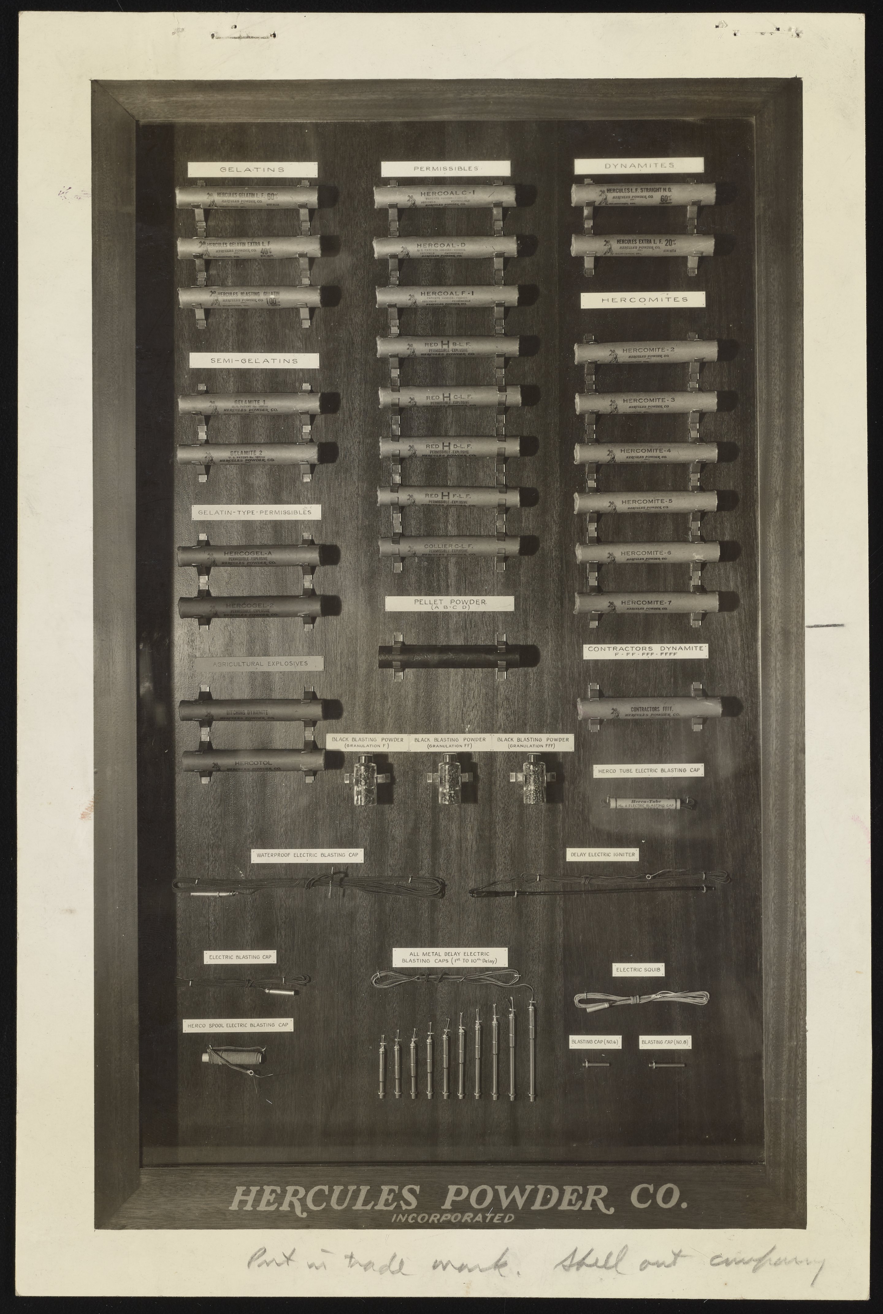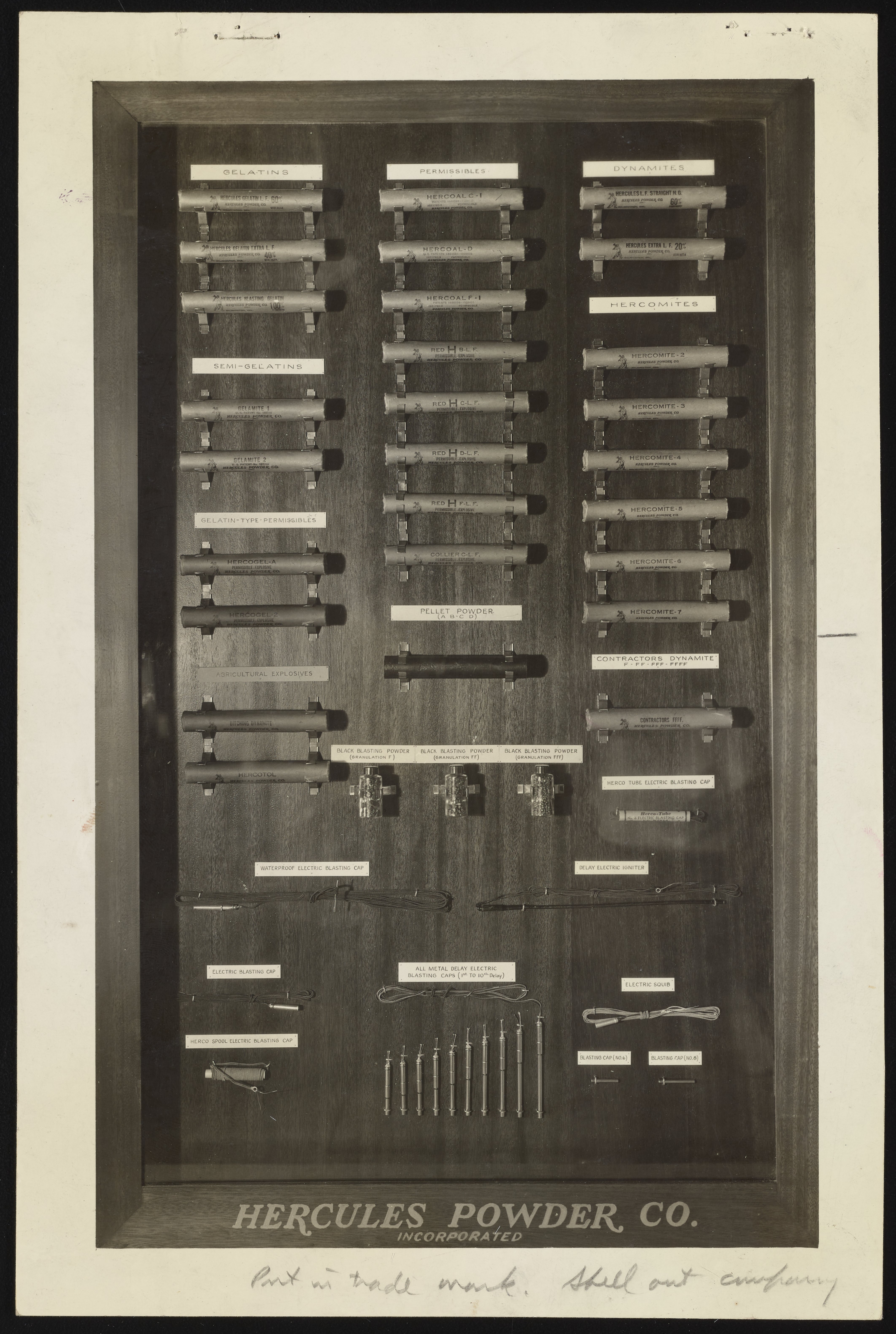 General view of an exhibit panel featuring samples of various explosives manufactured and sold by the Hercules Powder Company.