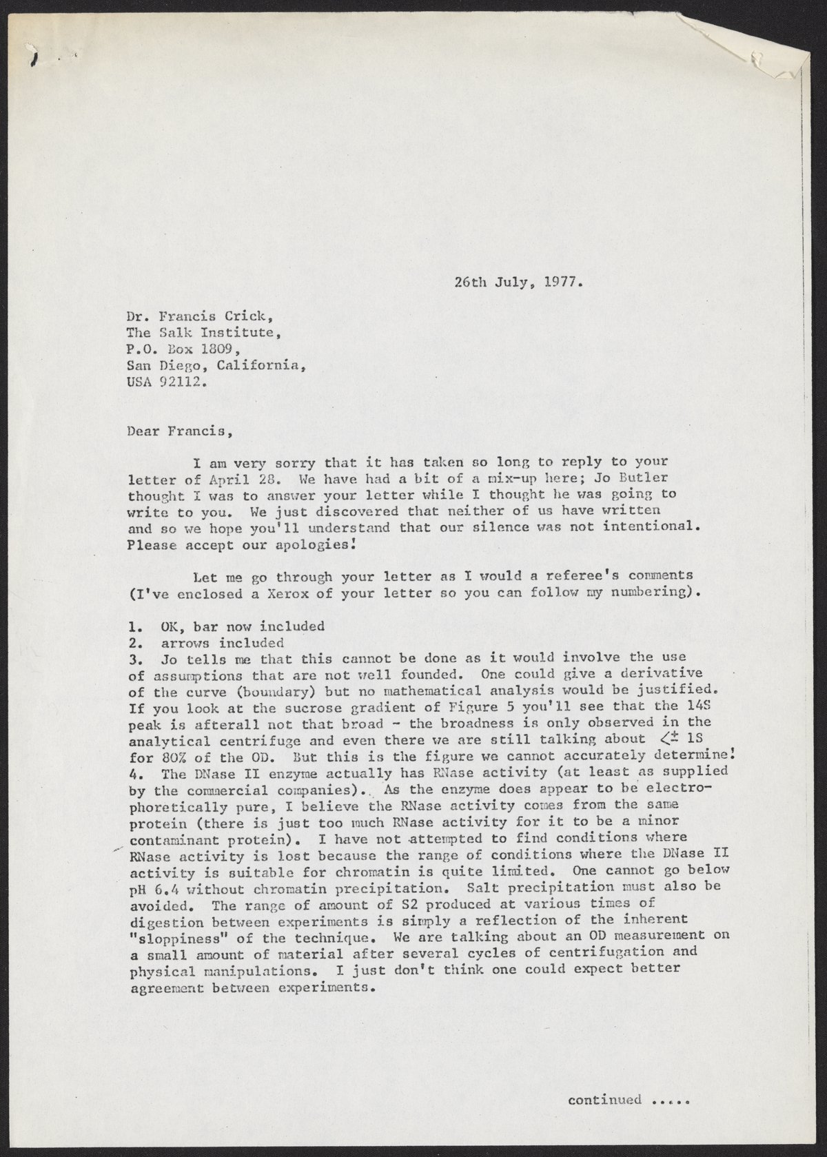 Gottesfeld, Joel. “Letter from Joel Gottesfeld to Francis Crick, July 26, 1977,” July 26, 1977. History of Molecular Biology Collection, Box 20, Folder 1. Science History Institute. Philadelphia. https://digital.sciencehistory.org/works/duqx1tz.