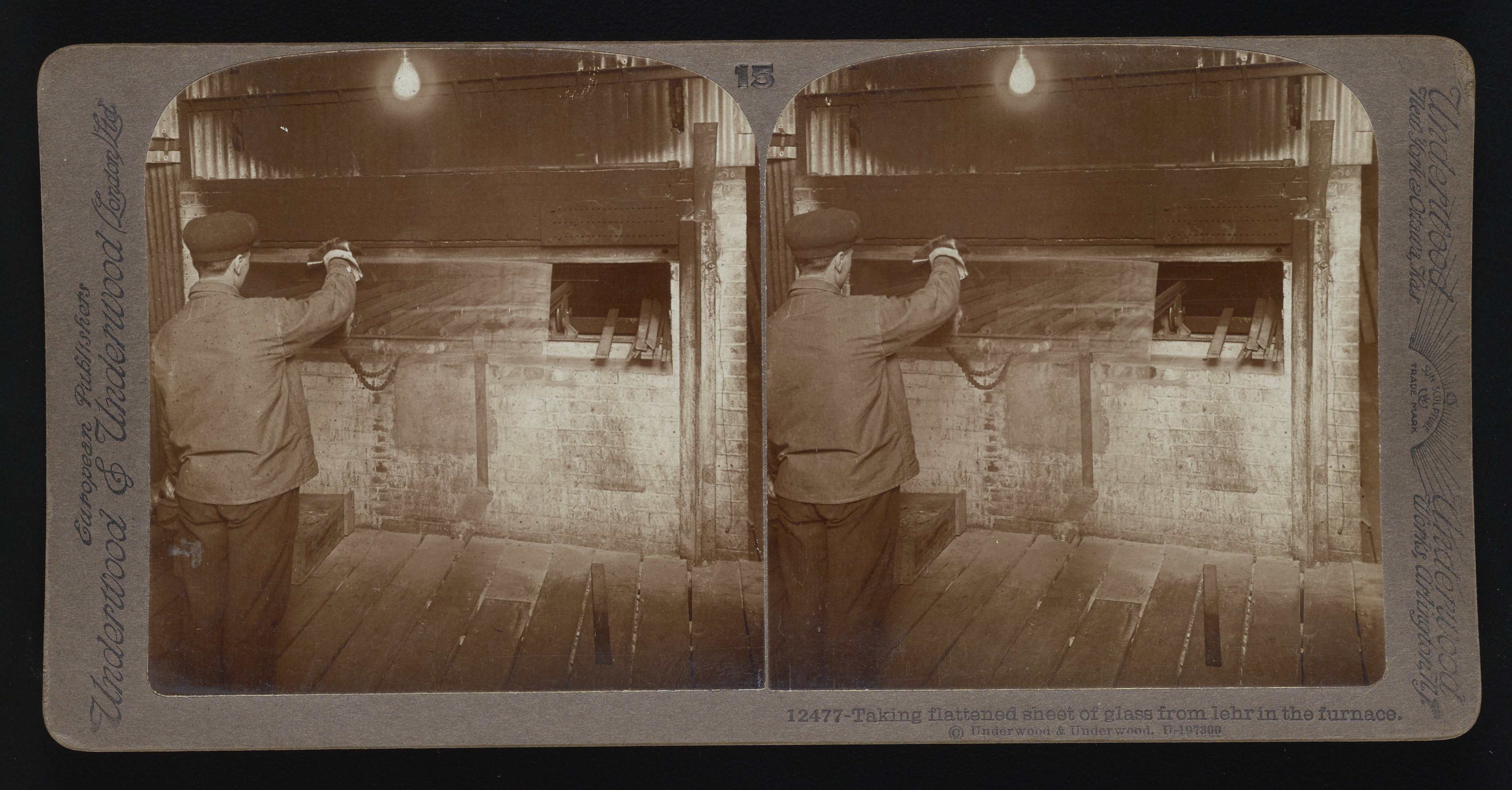 “Taking Flattened Sheet of Glass from Lehr in the Furnace.” Underwood & Underwood, n.d. Underwood & Underwood Stereographs of Manufacturing Industries. Science History Institute. Philadelphia. https://digital.sciencehistory.org/works/dv13zt216.