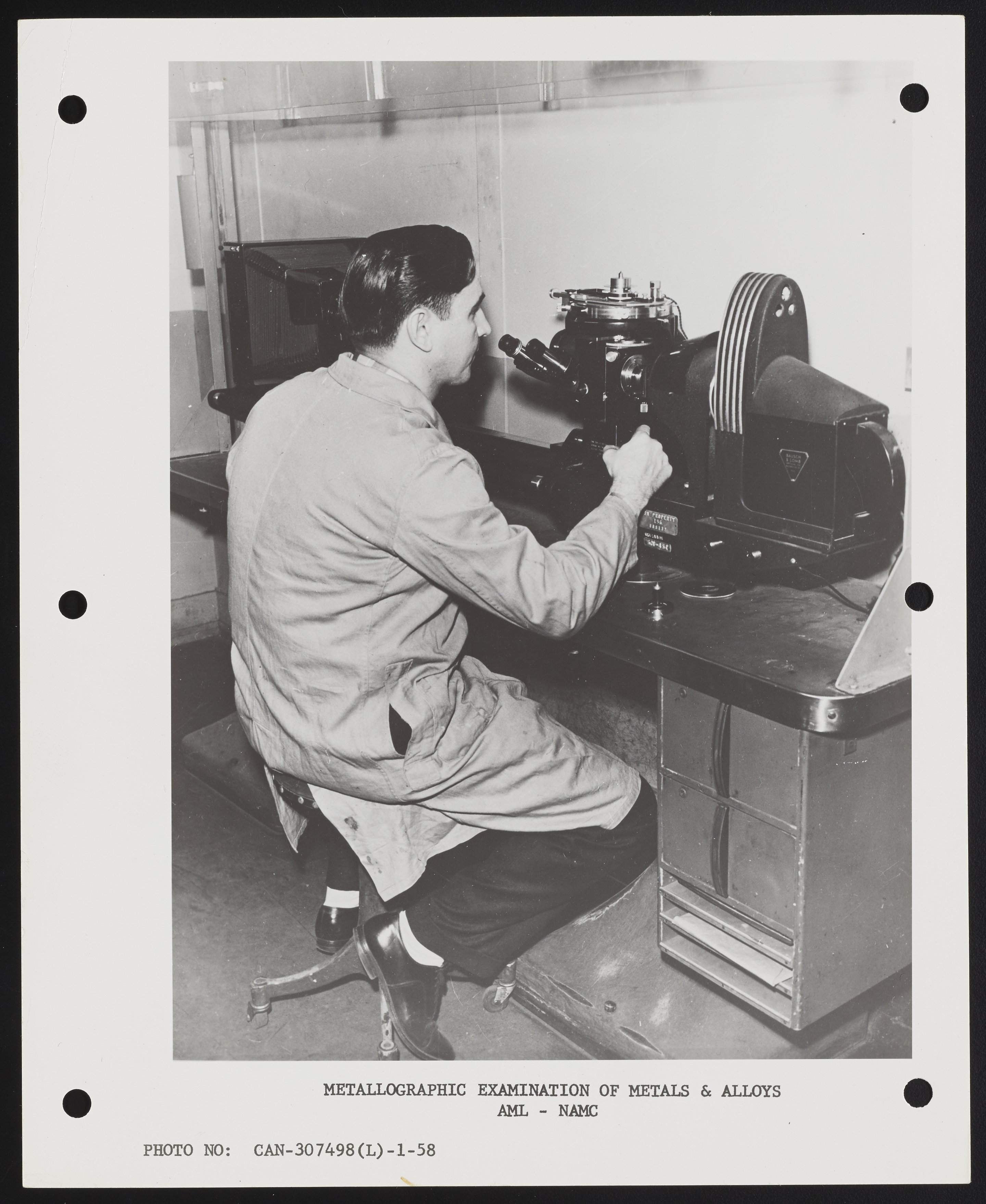 View of a technician performing a metallographic examination of metals and alloys in the Naval Air Materials Center's Aeronautical Materials Laboratory. Metallography is the study of the physical structure and components of metals, typically using microscopy. Analysis of a material's microstructure aids in determining if the material has been processed correctly and thus is a critical step for determining product reliability and quality control analysis.
