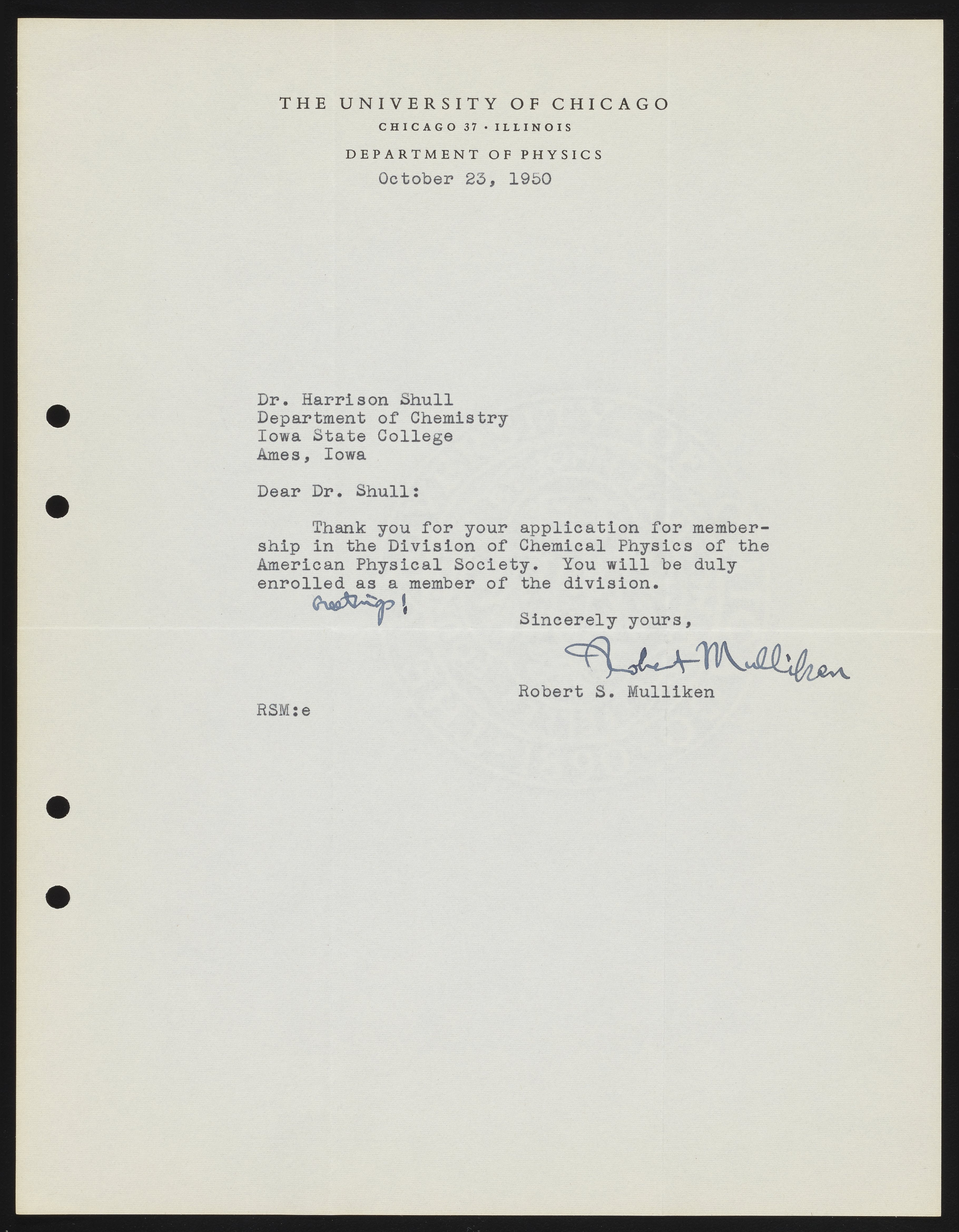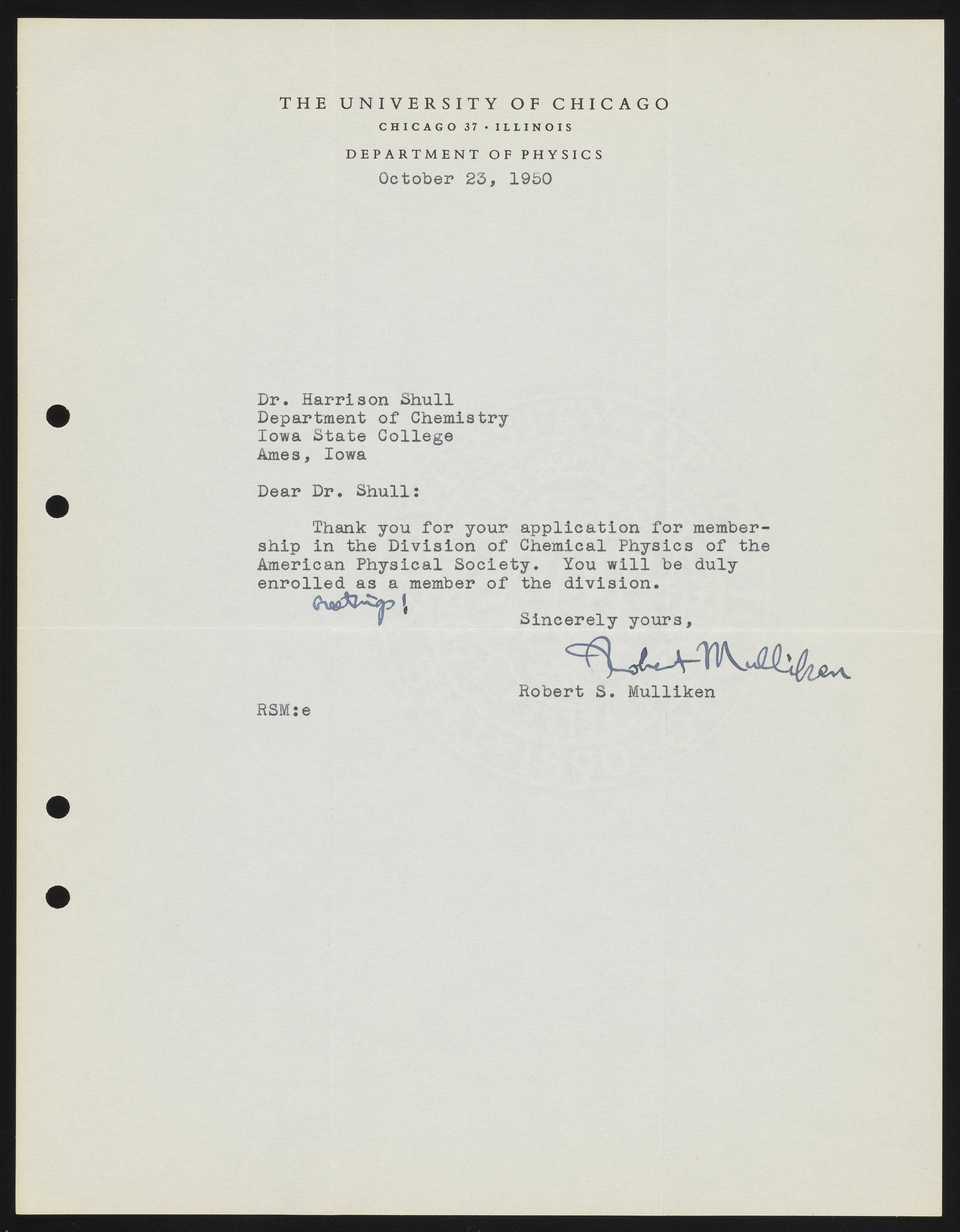 Letter from Robert S. Mulliken to Harrison Shull, 1950