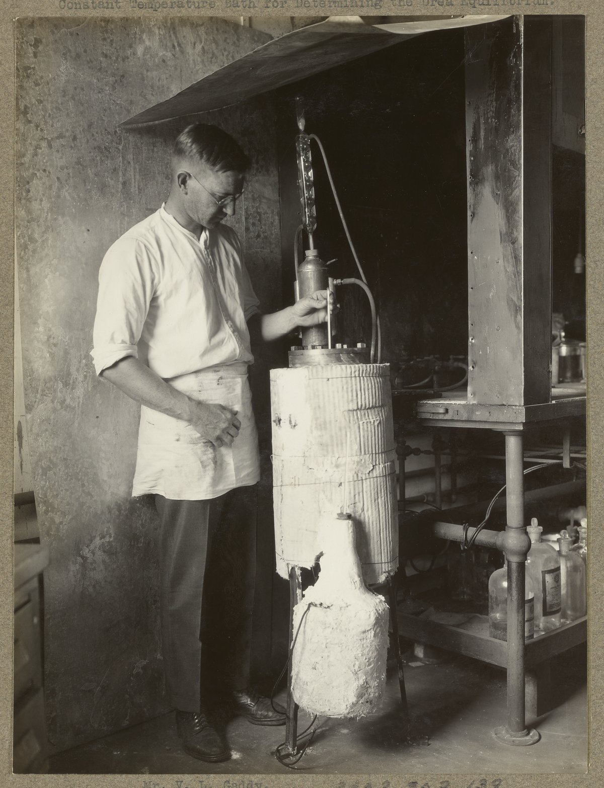“V.L. Gaddy with Constant-Temperature Bath at Fixed Nitrogen Research Laboratory,” circa 1927. Travis P. Hignett Collection of Fixed Nitrogen Research Laboratory Photographs, Box 1. Science History Institute. Philadelphia. https://digital.sciencehistory.org/works/dv13zt348.