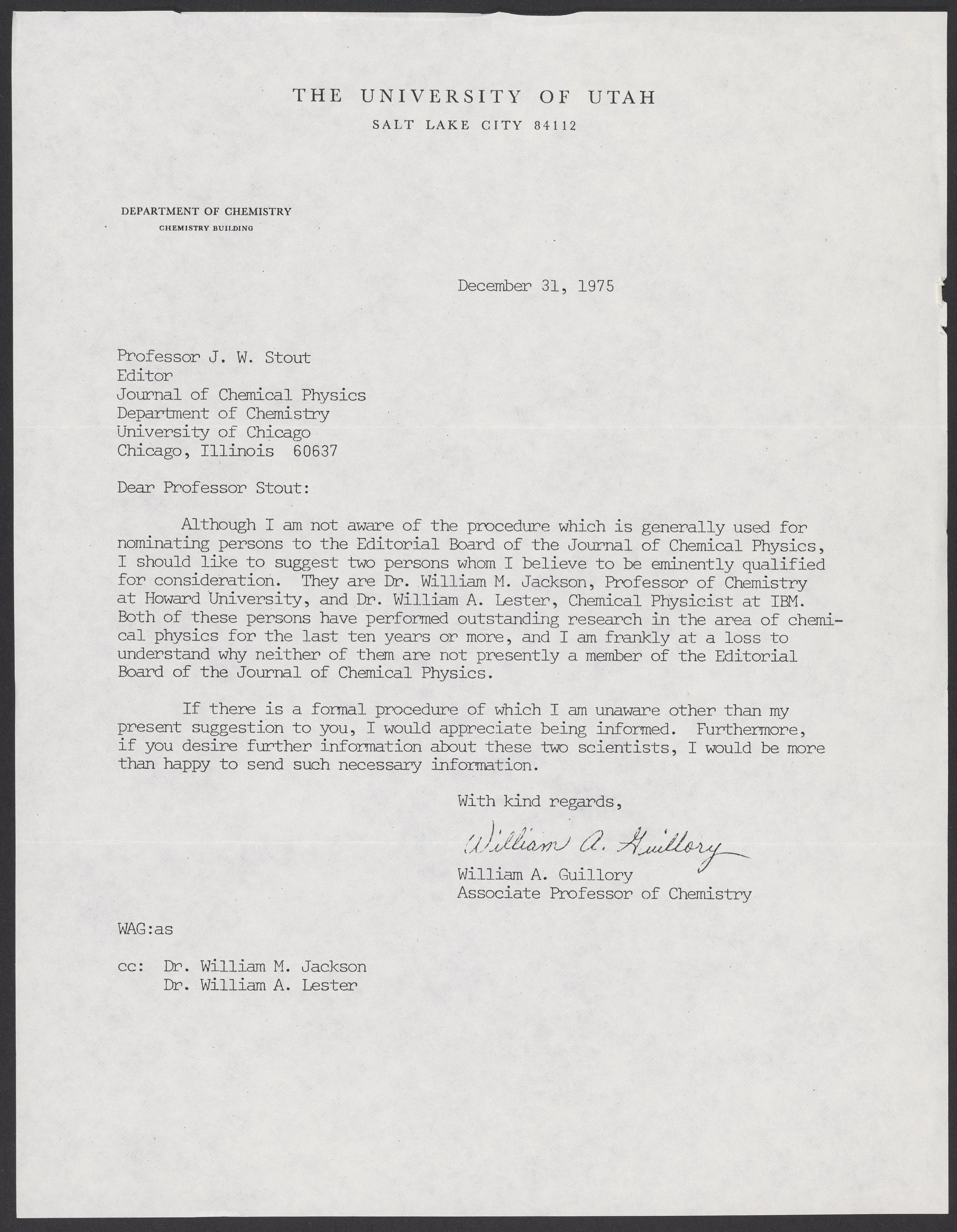 Letter from William A. Guillory to J. W. (John Willard) Stout, nominating William M. Jackson (1936-) and William A. Lester, Jr. (1937-) for the Editorial Board for the Journal of Chemical Physics.