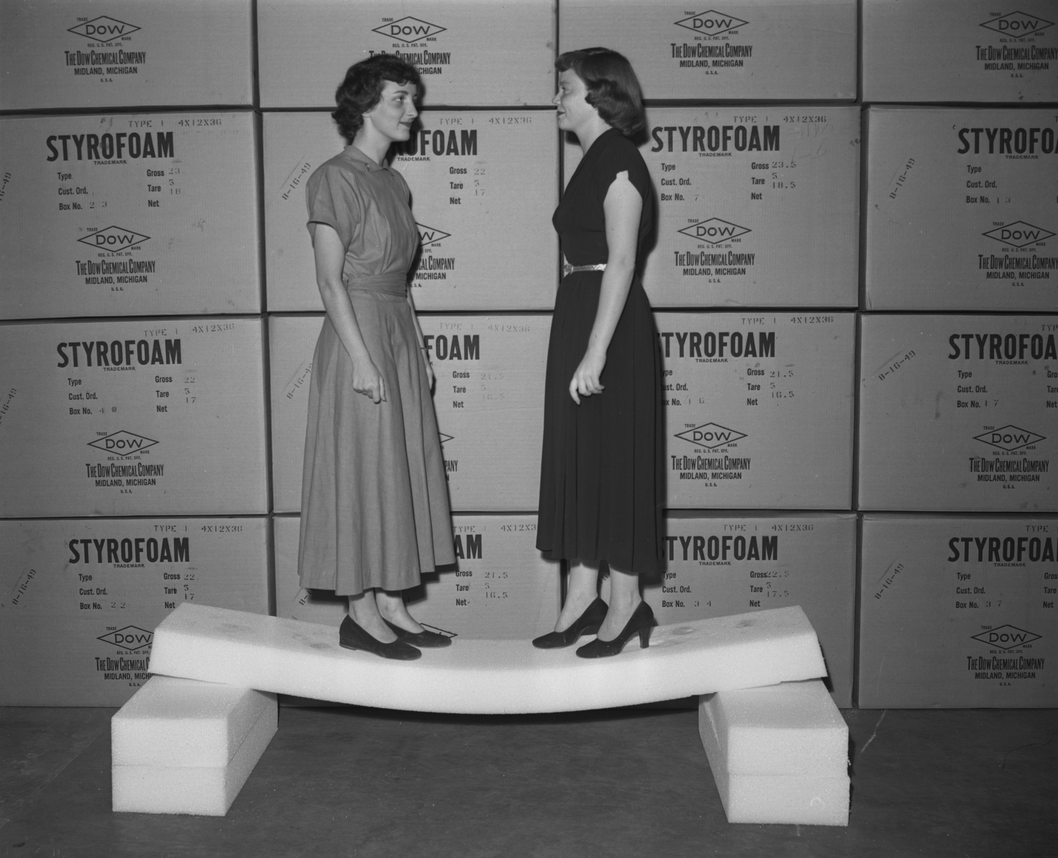 View of two female models standing on a plank of Dow Chemical Company Styrofoam to demonstrate the product's sturdiness and durability. Several boxes of Styrofoam products are visible in the background.